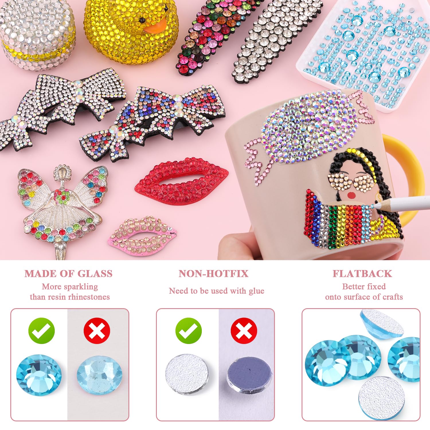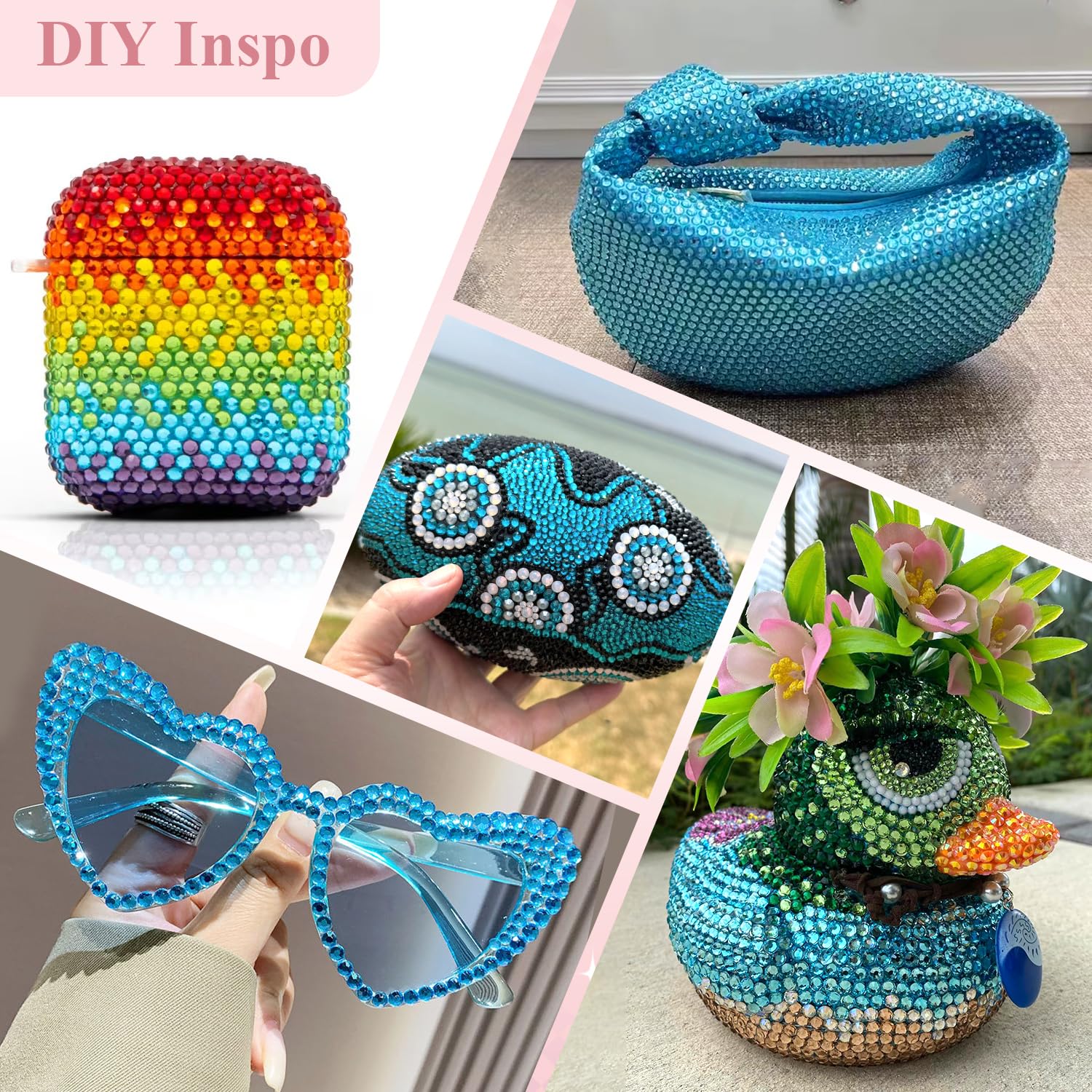 WIDE APPLICATION -- The iridescent and bedazzling gems will remarkably add glitz to your DIY crafts, like shoes, sneakers, high heels, tumblers, mugs, goblets, bottles, clothes, dresses, jeans, hats, masks, glasses, phone cases, popsockets, scrapbooks, diamond paintings, greeting cards, bags, guitars, keychains, hair clips, etc. You can use them for face makeup, eye makeup, body art, 3D nail art as well. Apply it to whatever you want to bedazzle!