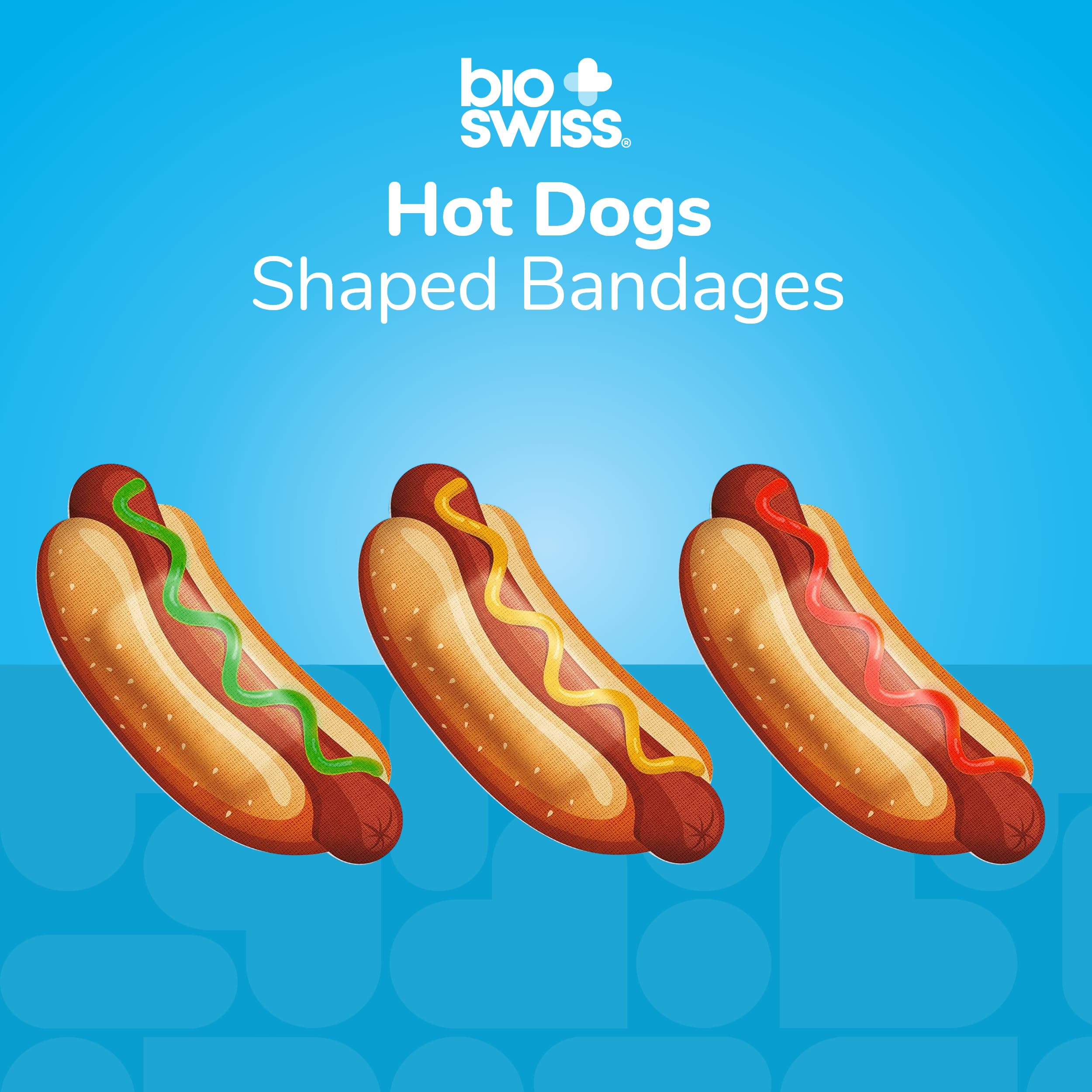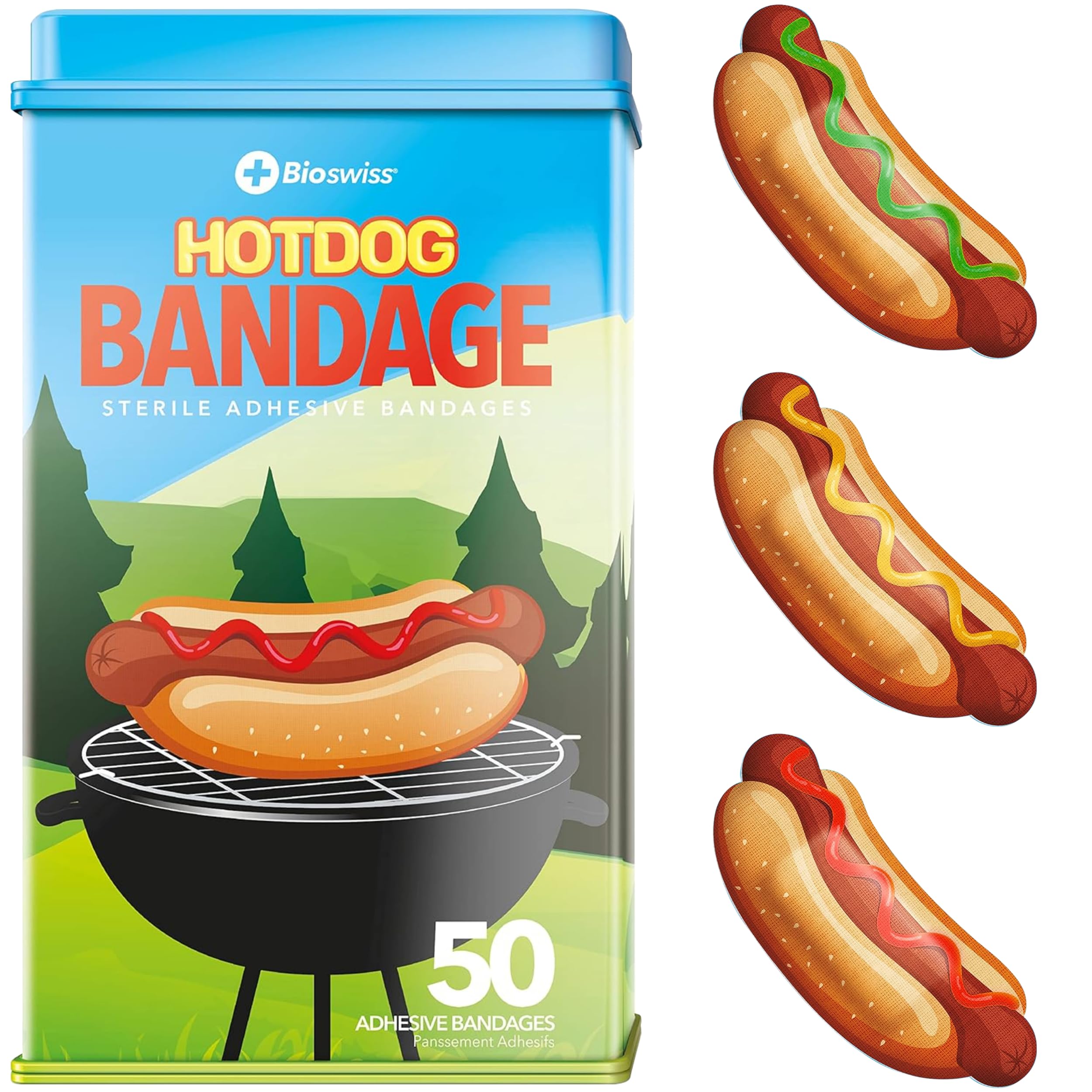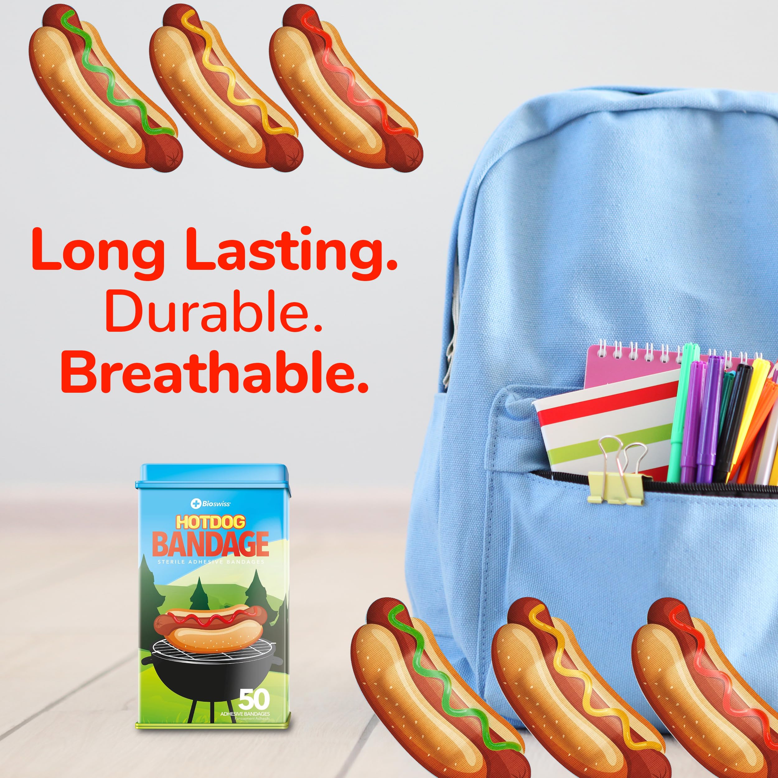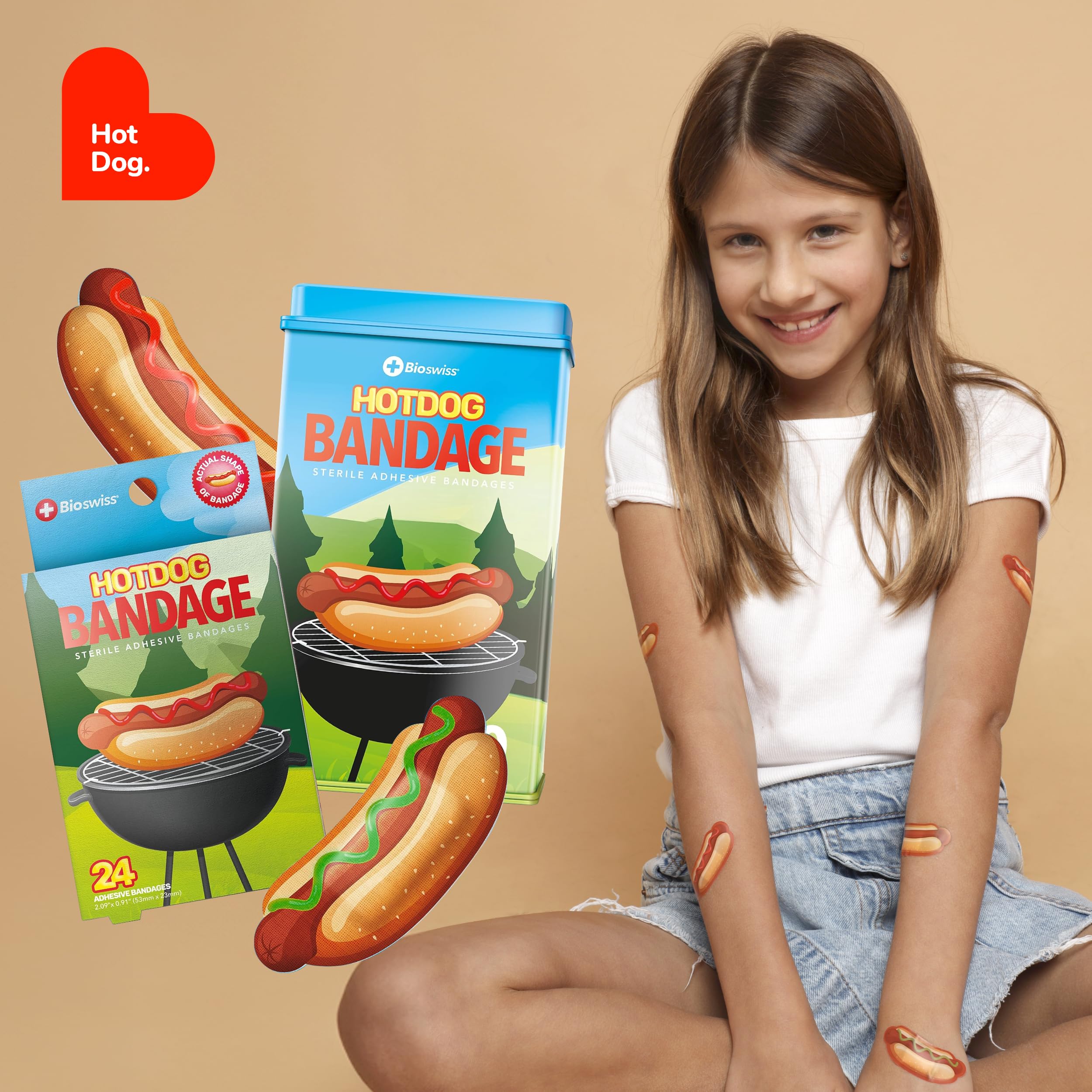 50 HOT DOG KIDS BANDAGES: Fun hot dog-shaped adhesive bandages tin helps protect cuts, scrapes, and minor wounds while making healing less stressful for children; bandages come in 3 assorted styles