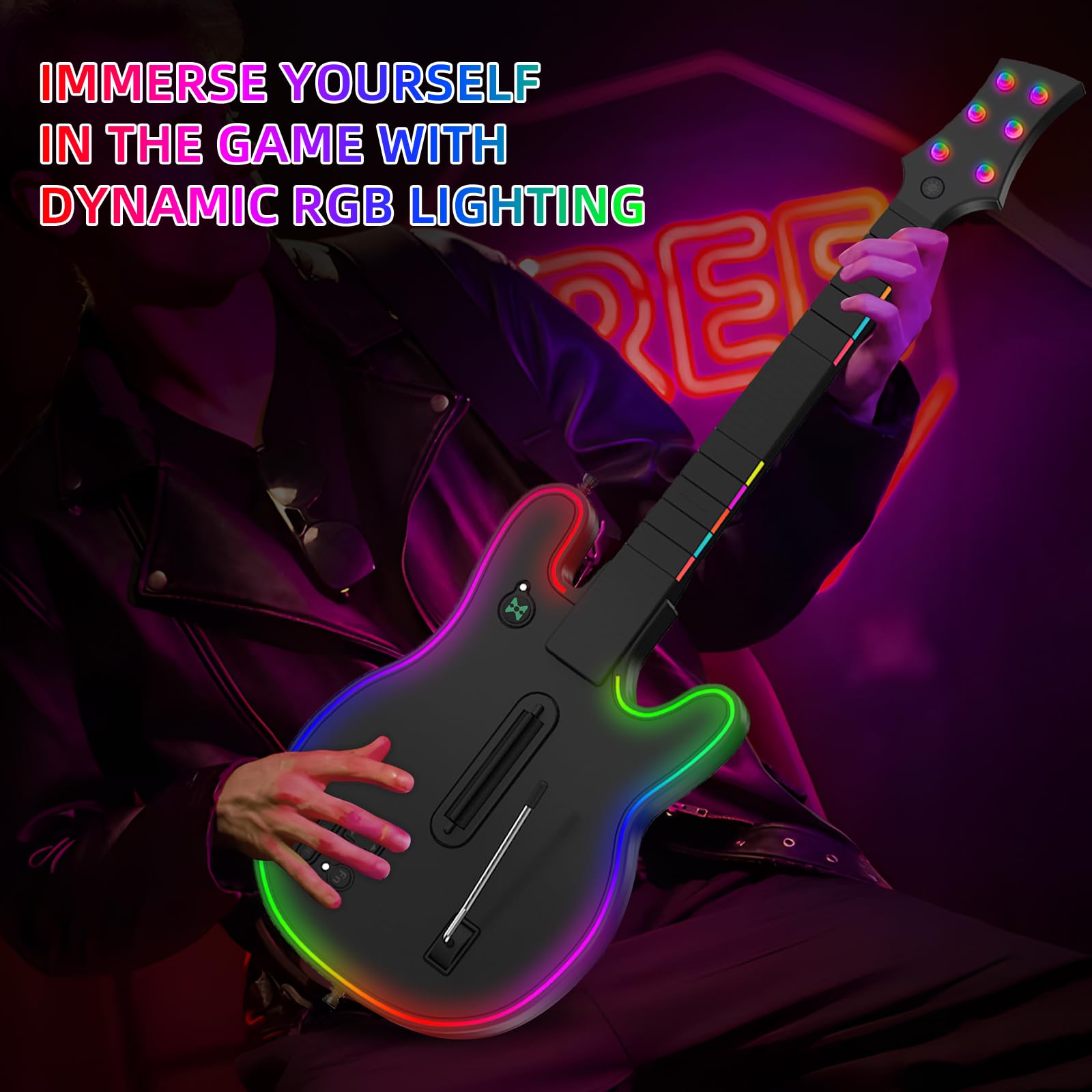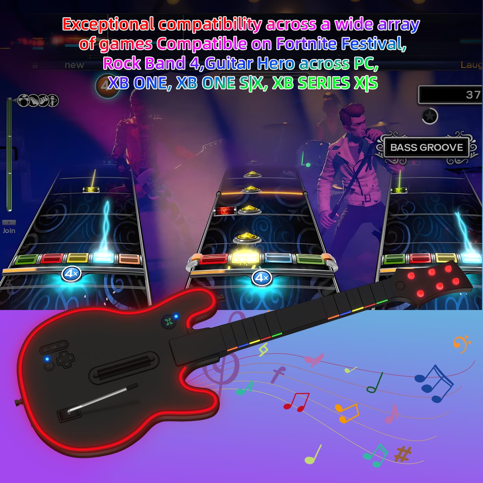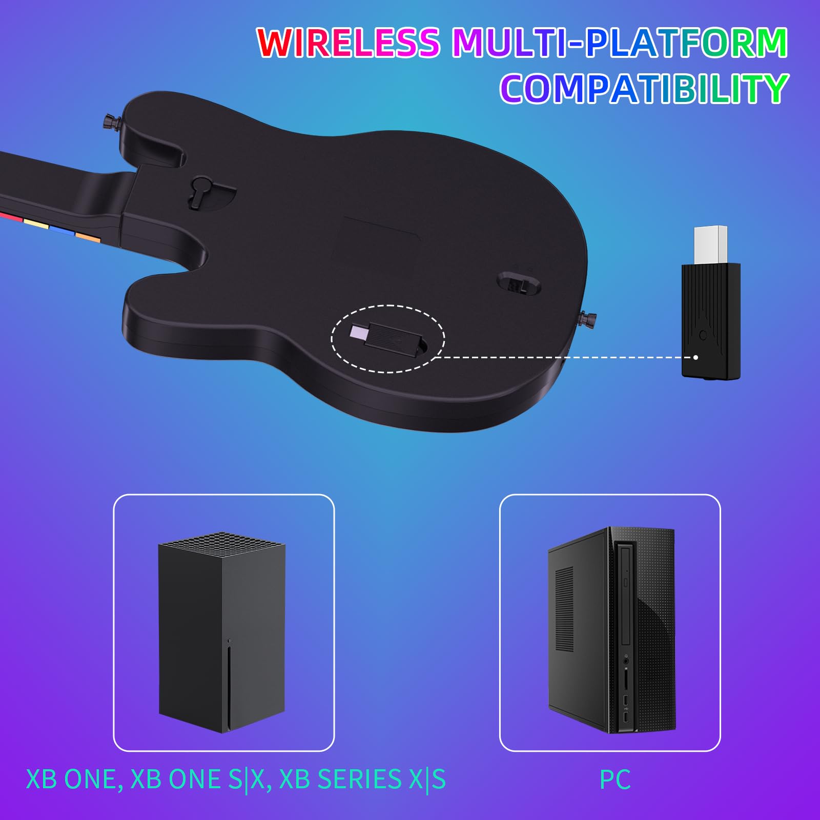 【Wireless Connectivity】You can play guitar games without interruption thanks to the 2.4G RF technology that offers stable wireless connections for up to 7 meters. Just plug the USB receiver into your Xbox, or PC. Pairing is easy and usage is convenient