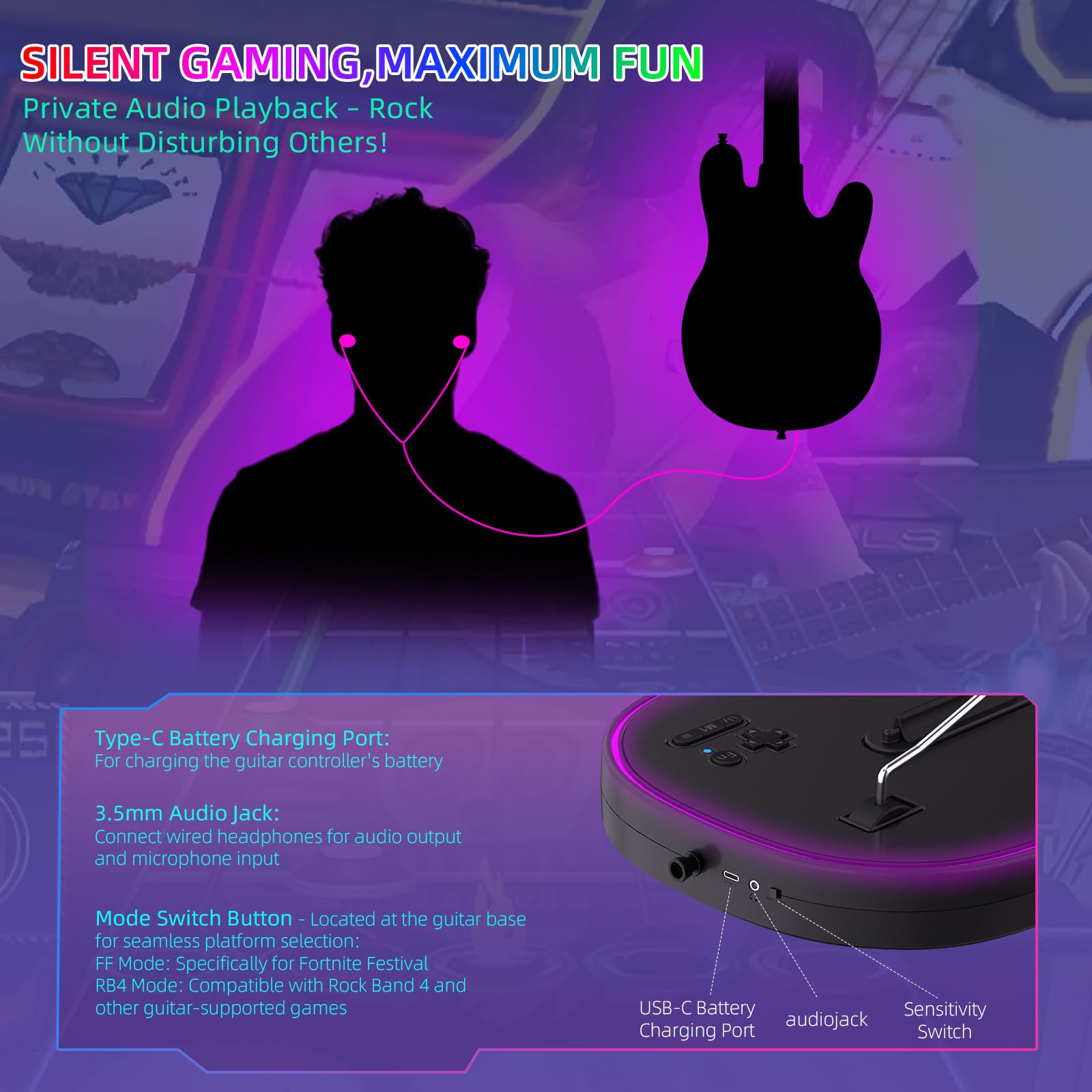 【Wide platform Compatibility】This wireless guitar hero controller is compatible with multiple platforms including PS4, PS3, PC and Windows. You can play Rock Band 4 and Fortnite Music Festival on XBOX; Guitar Hero 3-5, and other series of games such as Guitar Hero,Fortnite Music Festival and Clone Hero on Windows/PC
