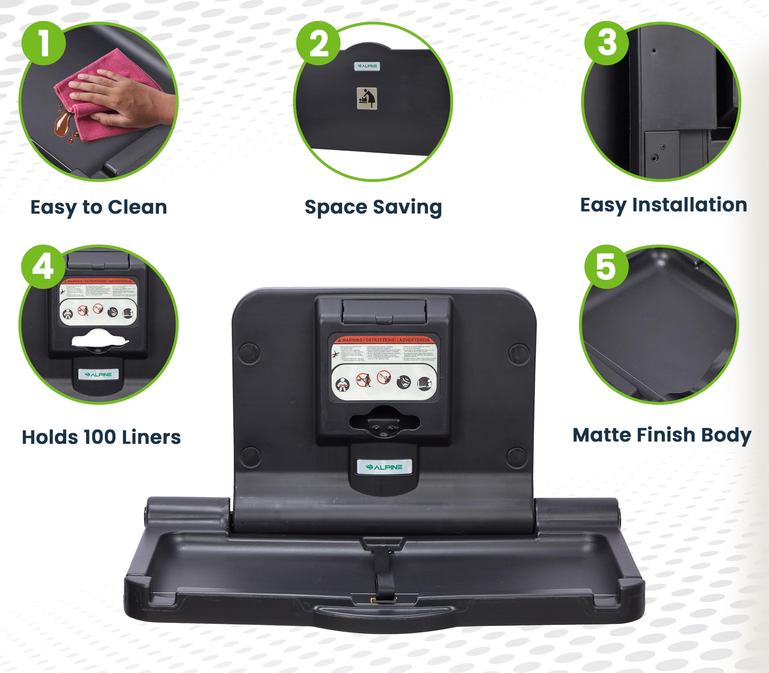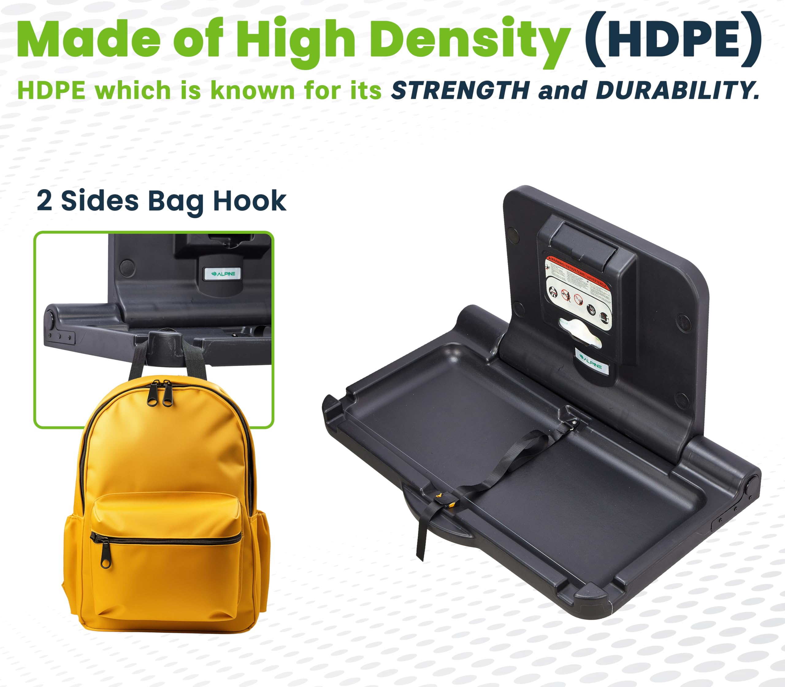 With two side bag hooks, the Alpine baby changing station provides wide storage space and makes it easy for parents to keep their belongings within reach while changing their baby. We are confident you'll love it!