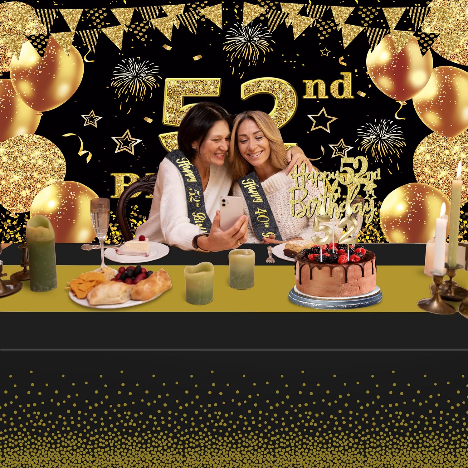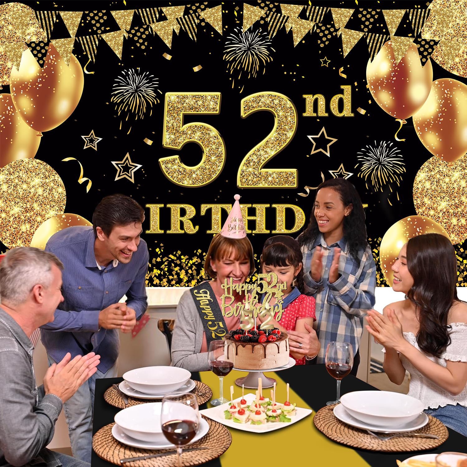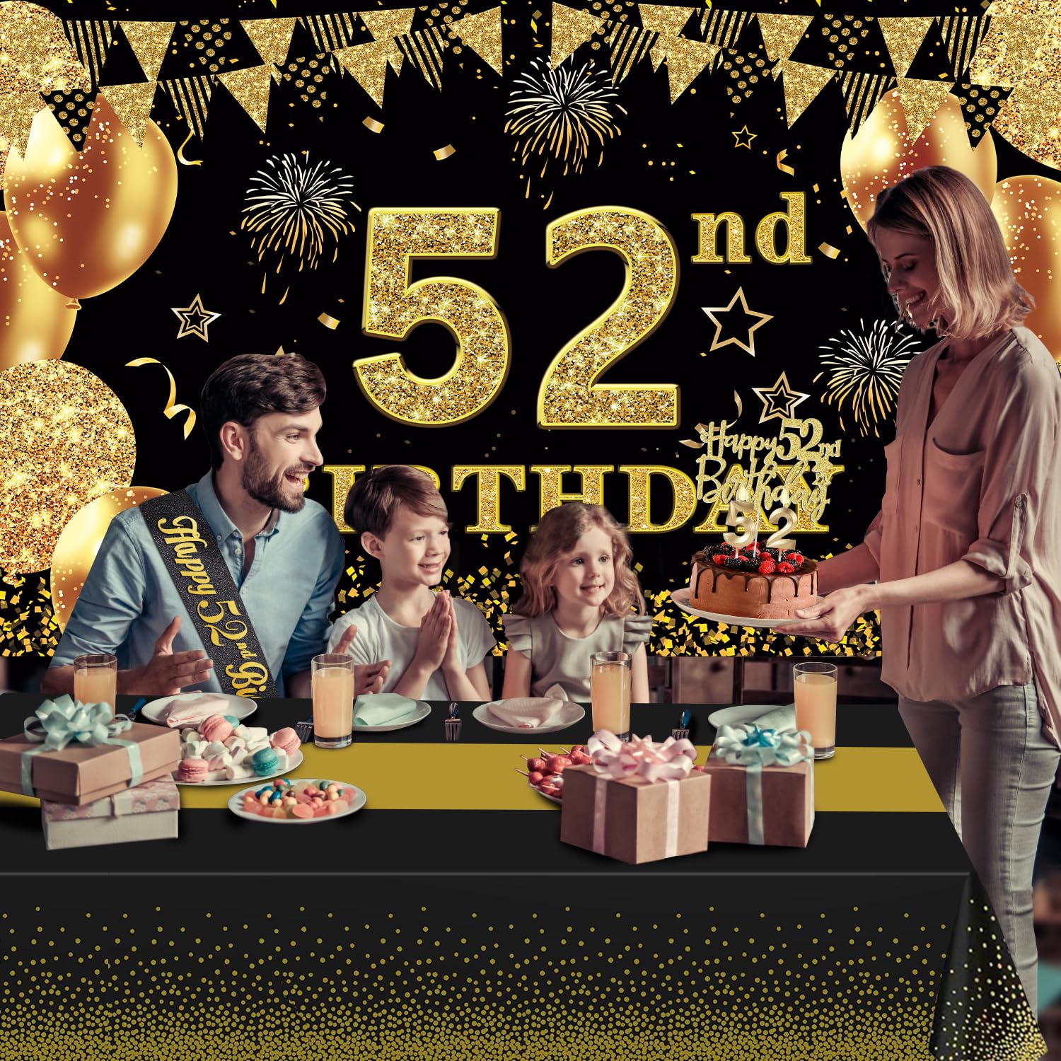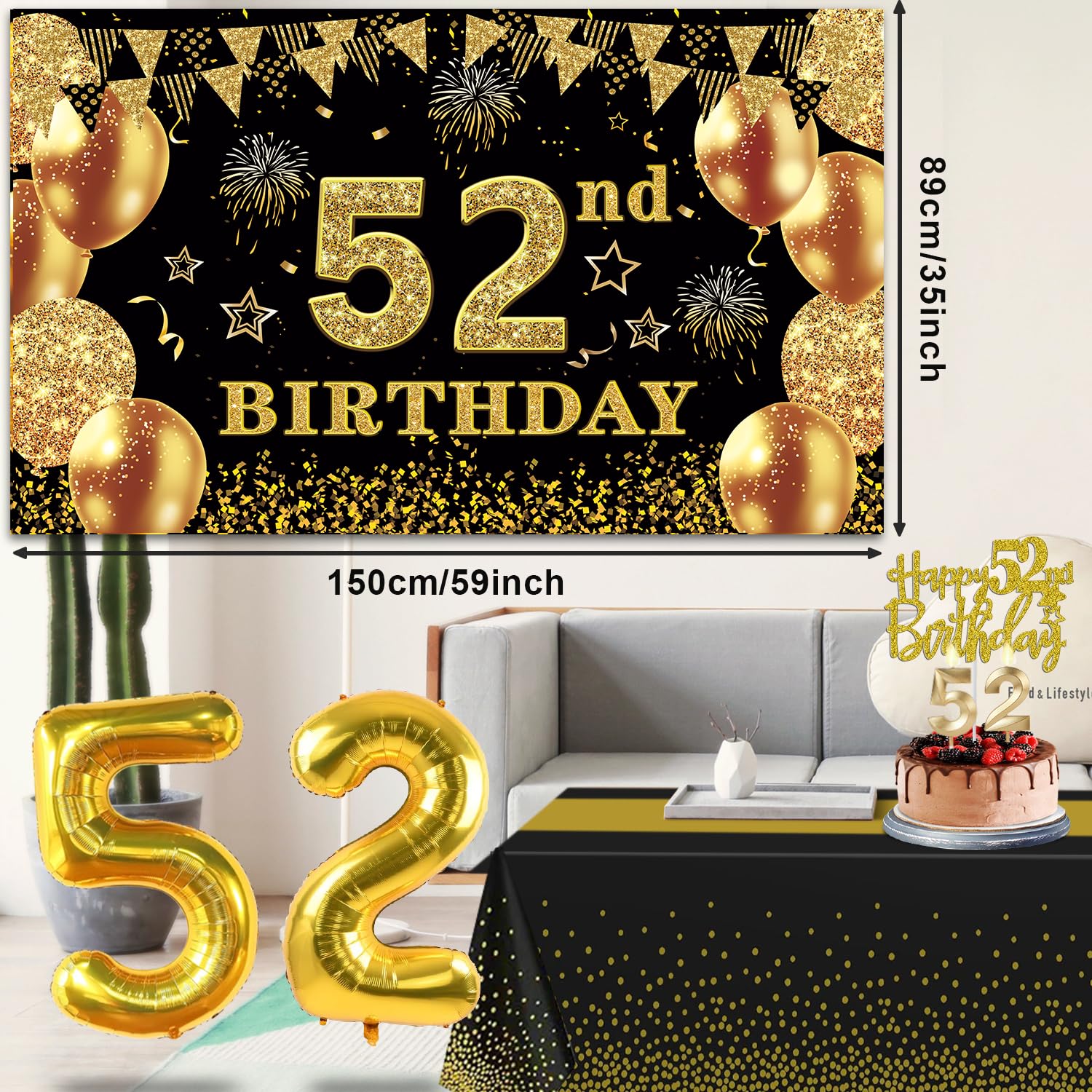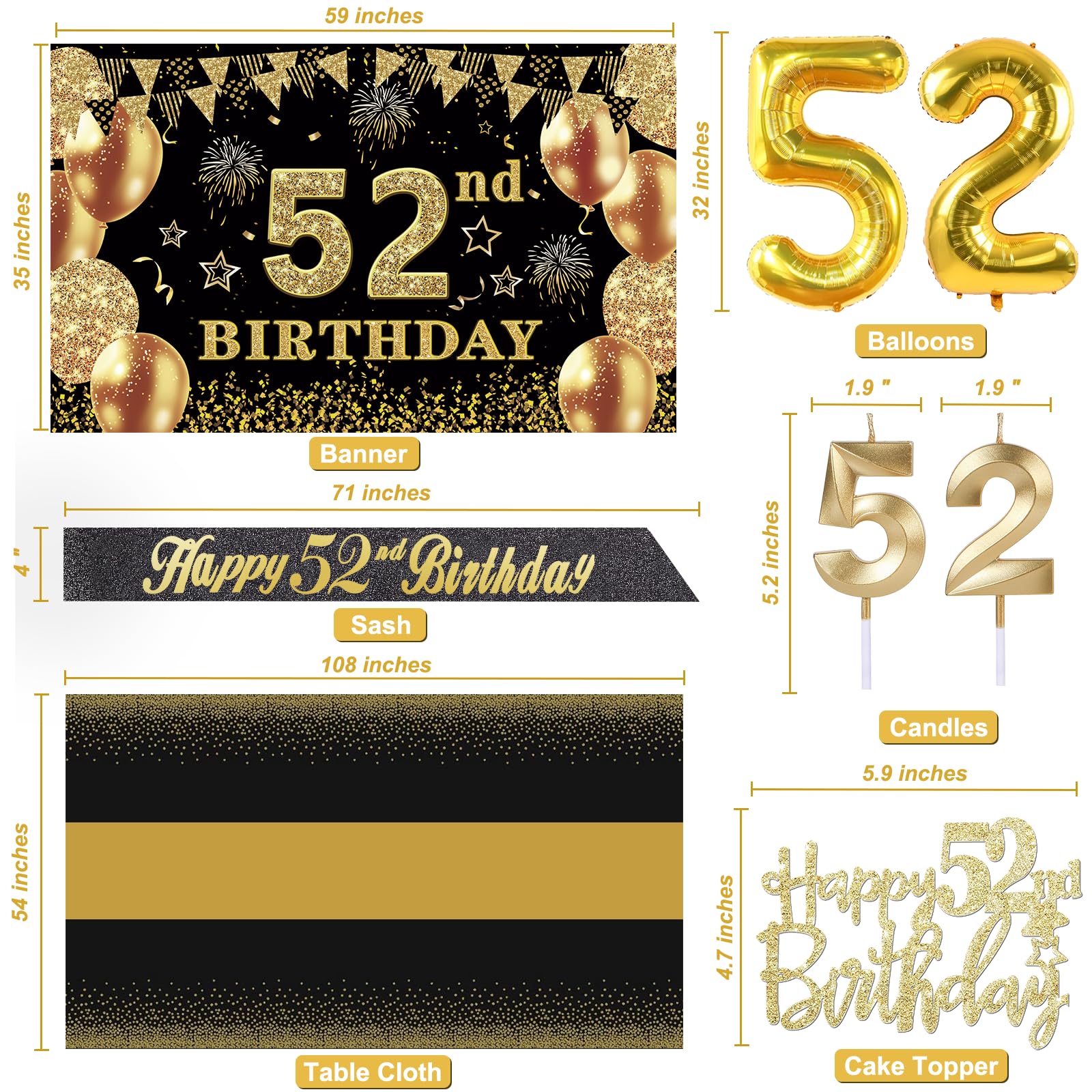 52nd Birthday Decorations Kit: Packing coming with Large 52nd Birthday Banner x 1pc, Big Gold 52nd Birthday Balloons x 1set, Black and Gold Table Cloth x 1pc, Black Glittery with Gold Foil Words Happy 52nd Birthday Sash x 1pc, Happy 52nd Birthday Cake Topper x 1pc, Gold Number 52 Candles x 1set. This Value Black and Gold Party Decorations Set Meet Your Every Needs and Expects in 52nd Birthday Milestone