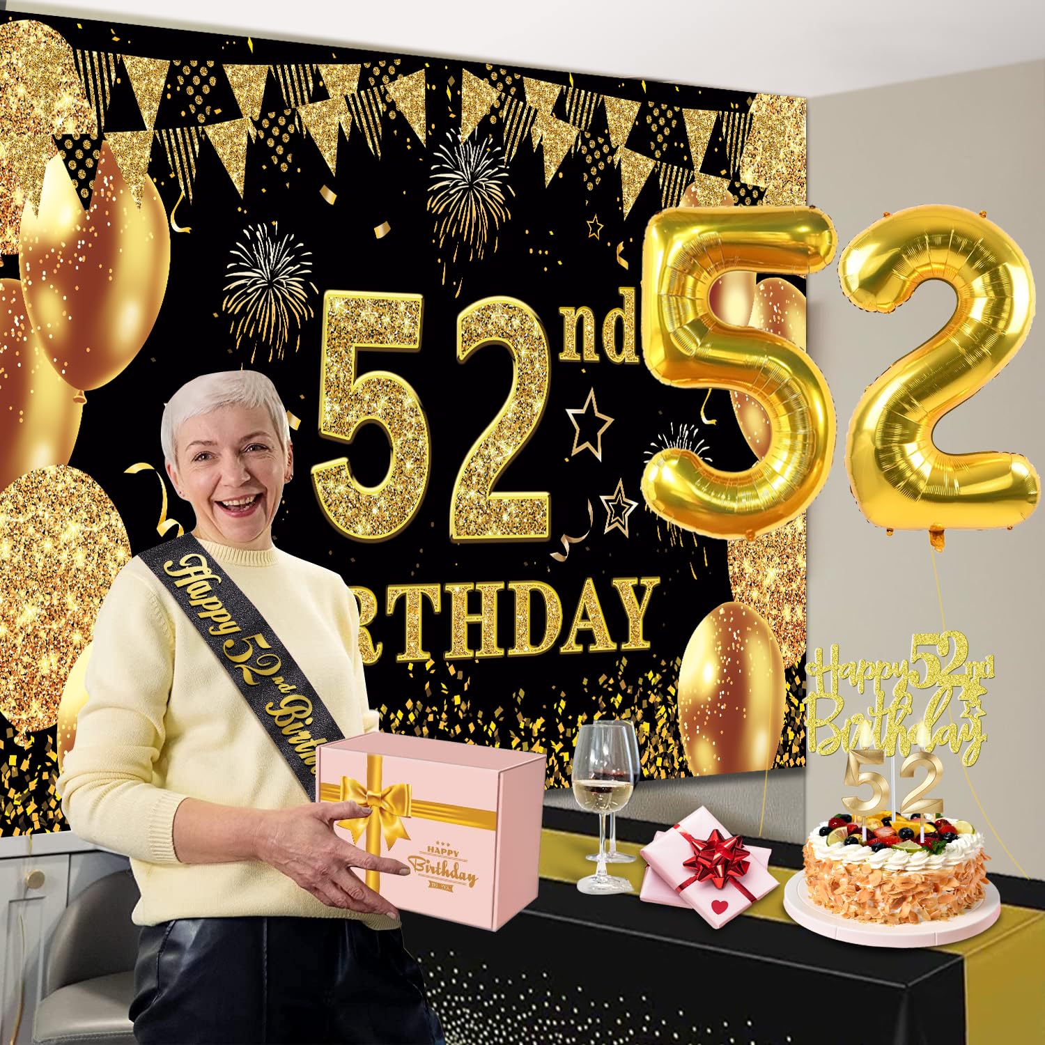 52nd Birthday Balloons and Sash: Big Size 71 * 4 inches Glitter Black Happy 52nd Birthday Sash with Gold Foil lettering and come with a gold charm pin that you can easily adjust the length you needed. Make the birthday king and birthday queen be eye-catching. Big 32inch gold 52 balloons come with straw to inflate. It has Self-sealing valve for easy inflation and deflation. Hang 52nd balloons add much fun in the 52 birthday party
