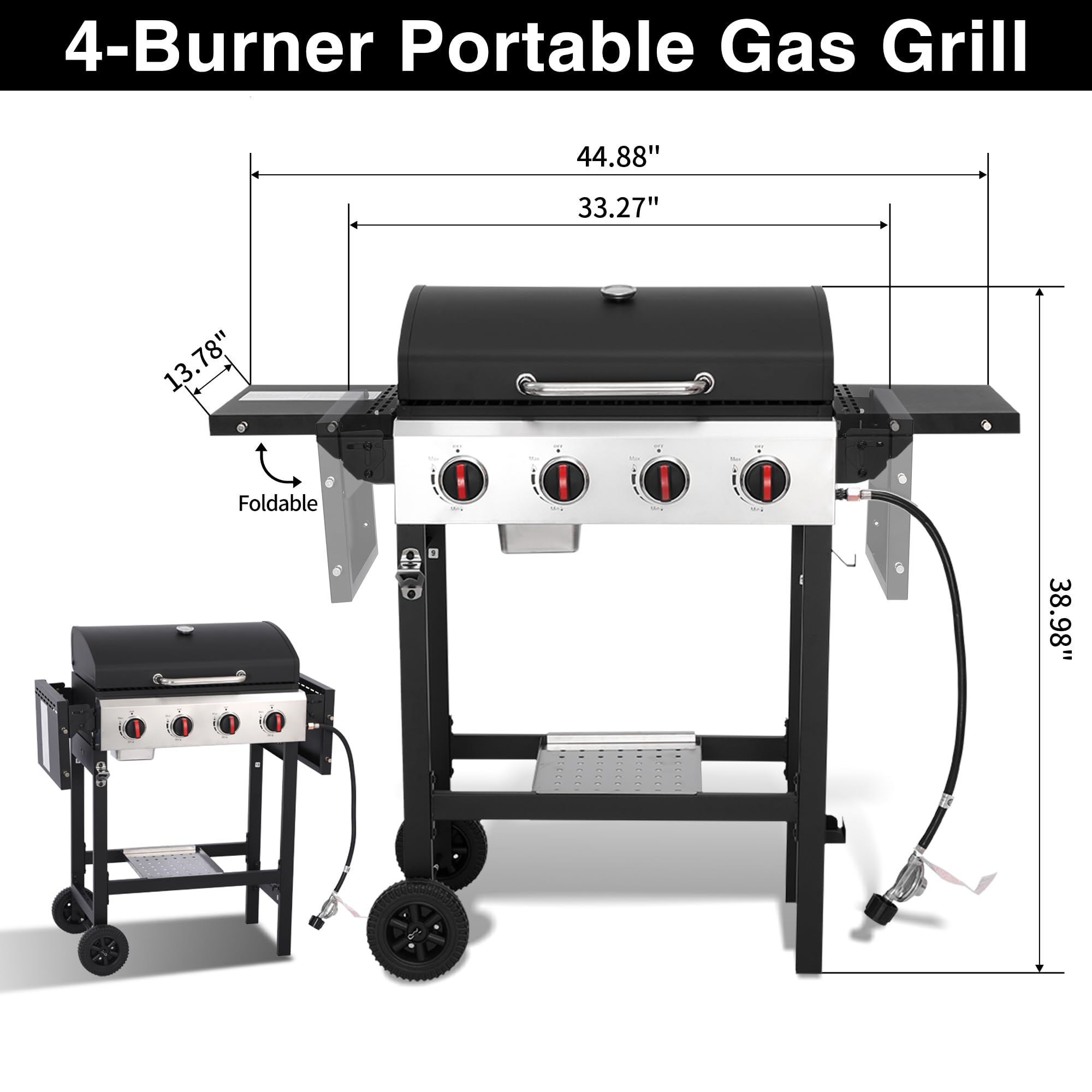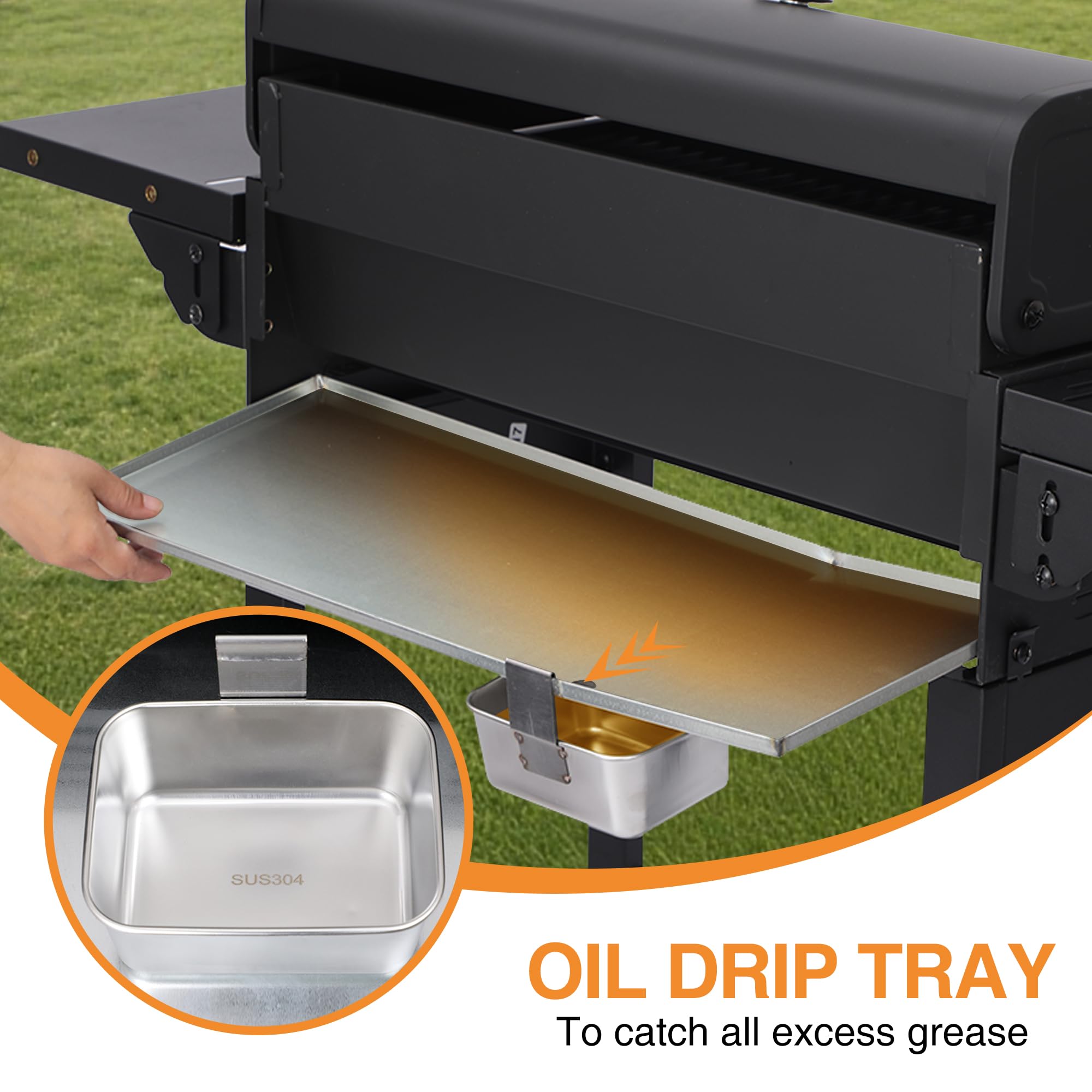 PERFORMANCE-ORIENTED DESIGN - Removable grease tray and detachable grill grates for quick cleanup, adjustable knobs + built-in thermometer master low-and-slow or high-heat cooks, high-temperature resistant lid for preventing the wind from lowering the temperature, side propane tank hook for stability and safety, built-in tool hooks for tongs/spatulas and built-in bottle opener for hassle-free BBQ party.