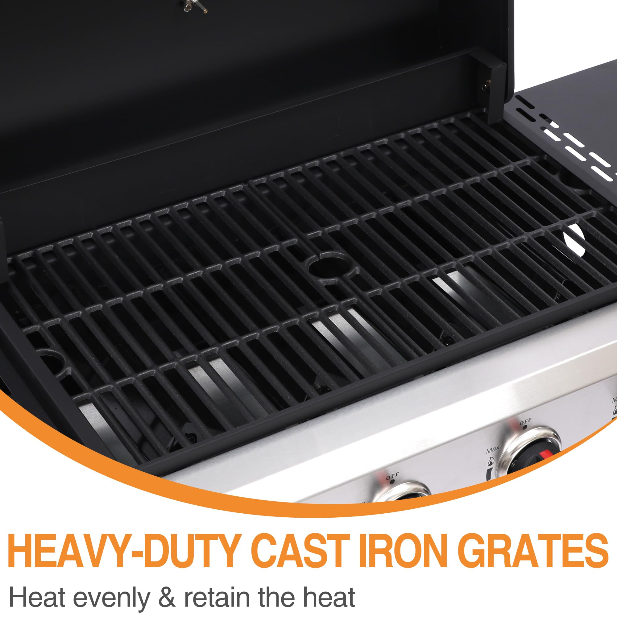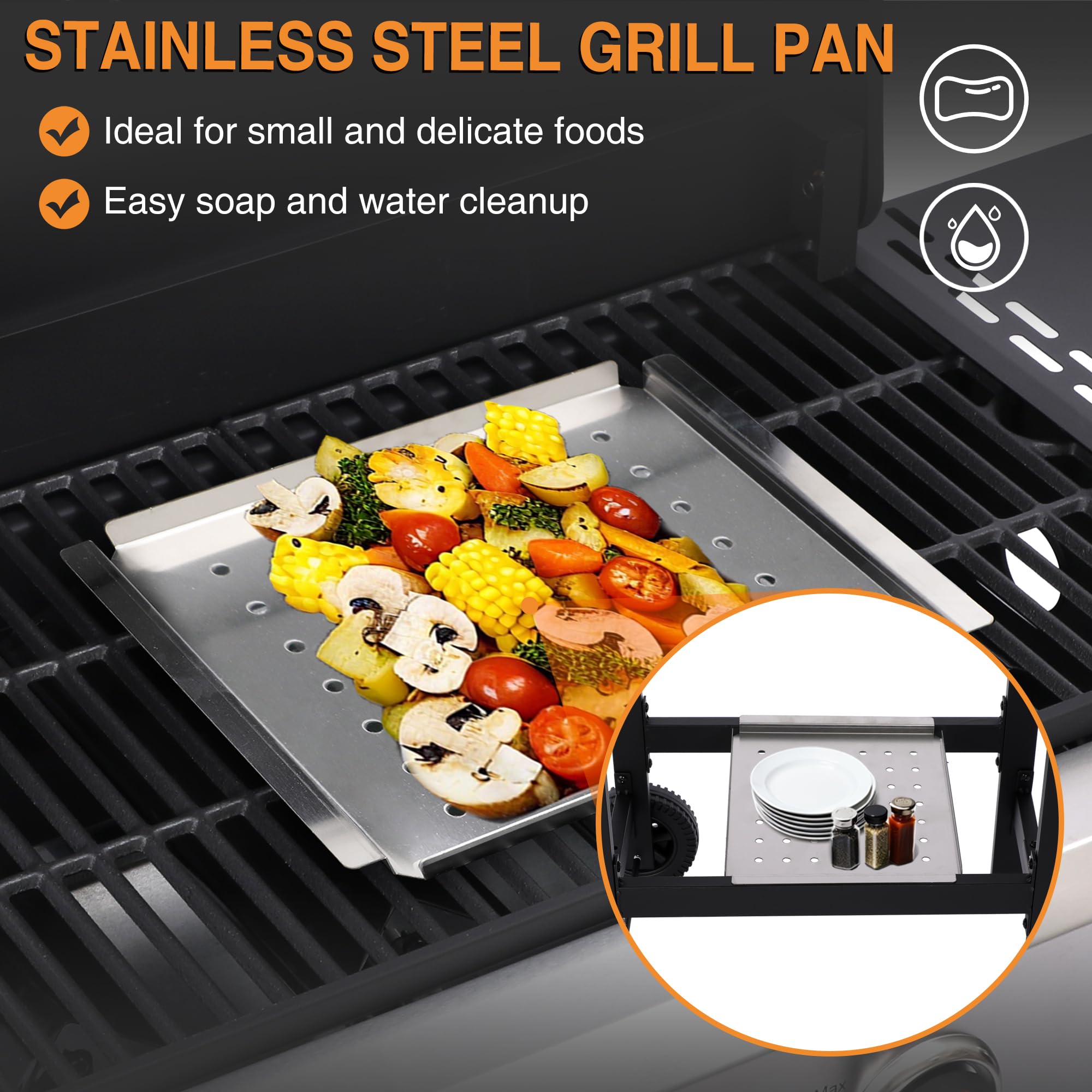 CAST IRON GRILL GRATES + PERFORATED GRIDDLE PAN COMBO - Cast iron grates ensure even heat distribution, and give foods that mouthwatering char. Perforated grill pan comes with plenty of holes on the bottom, allows heat and smoke to pass through food quickly and evenly, great for grilling meat, fish, veggies, steak, seafood and more. Both of them make this grill versatile beyond belief—breakfast, hibachi, sausages, fish, veggies, seafood, you name it.