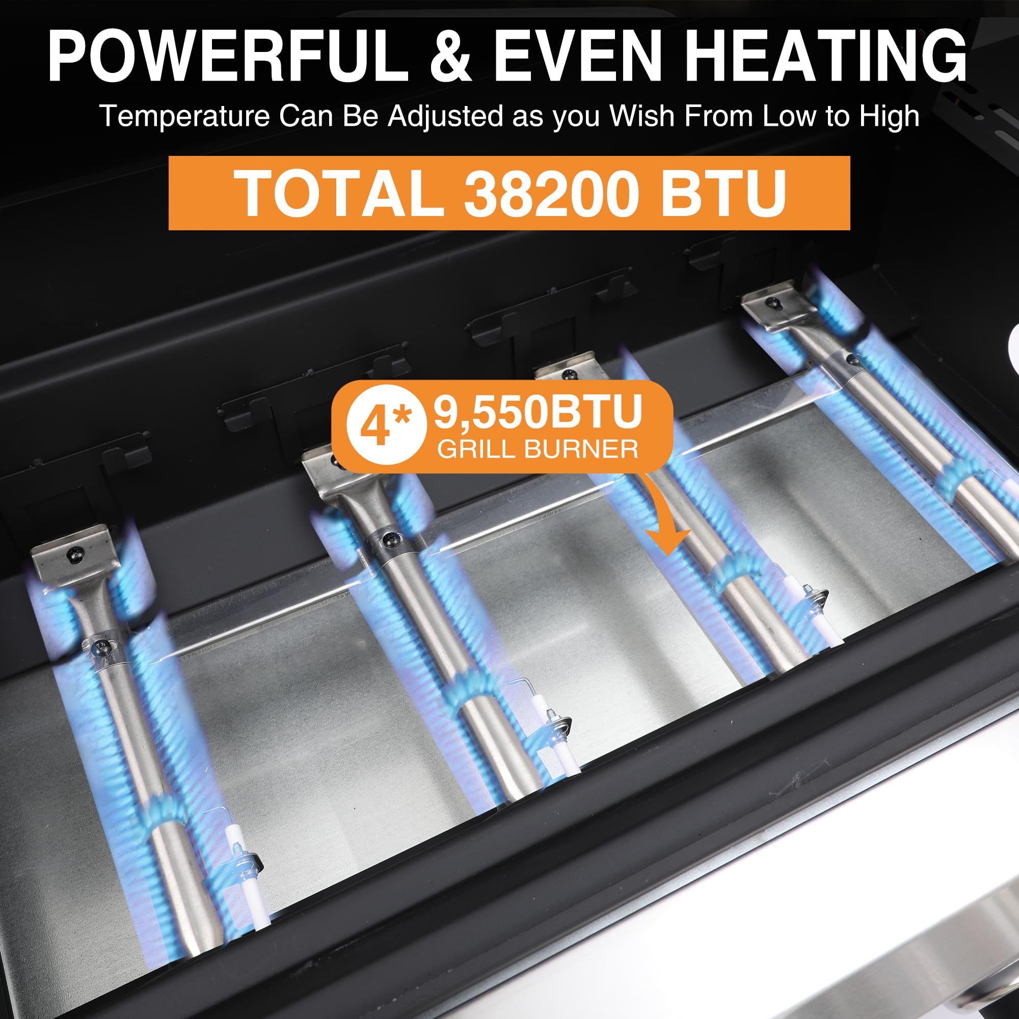 EXCEPTIONAL EFFICIENCY - Four independently adjustable burners (10,000 BTU each) heat evenly, which makes cooking for a crowd so much easier. Boasting 302 square inches of cooking space, this outdoor propane grill is designed for 2-4 peoples party.