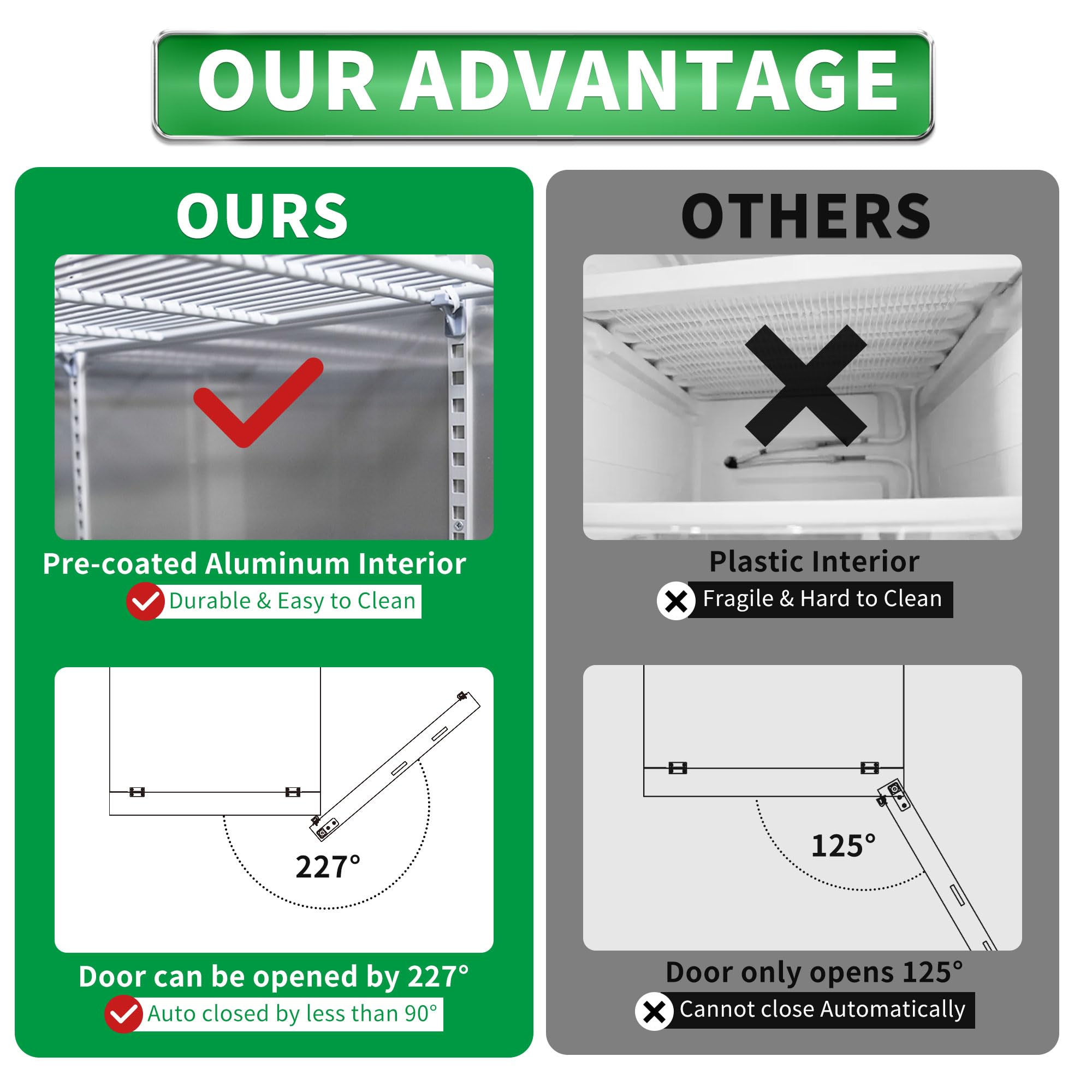 Frozen Food Freshness & Safety Guaranteed - Precise digital control locks in a food-safe -10°F to 10°F zone to keep frozen ingredients in optimal fresh state and prevent thawing. 6-hour automatic defrost (4x daily) prevents frost buildup that affects freezing efficiency; innovative door frame heating stops water mist and frost formation around the door—eliminating risks of spoilage and meeting commercial frozen food safety standards