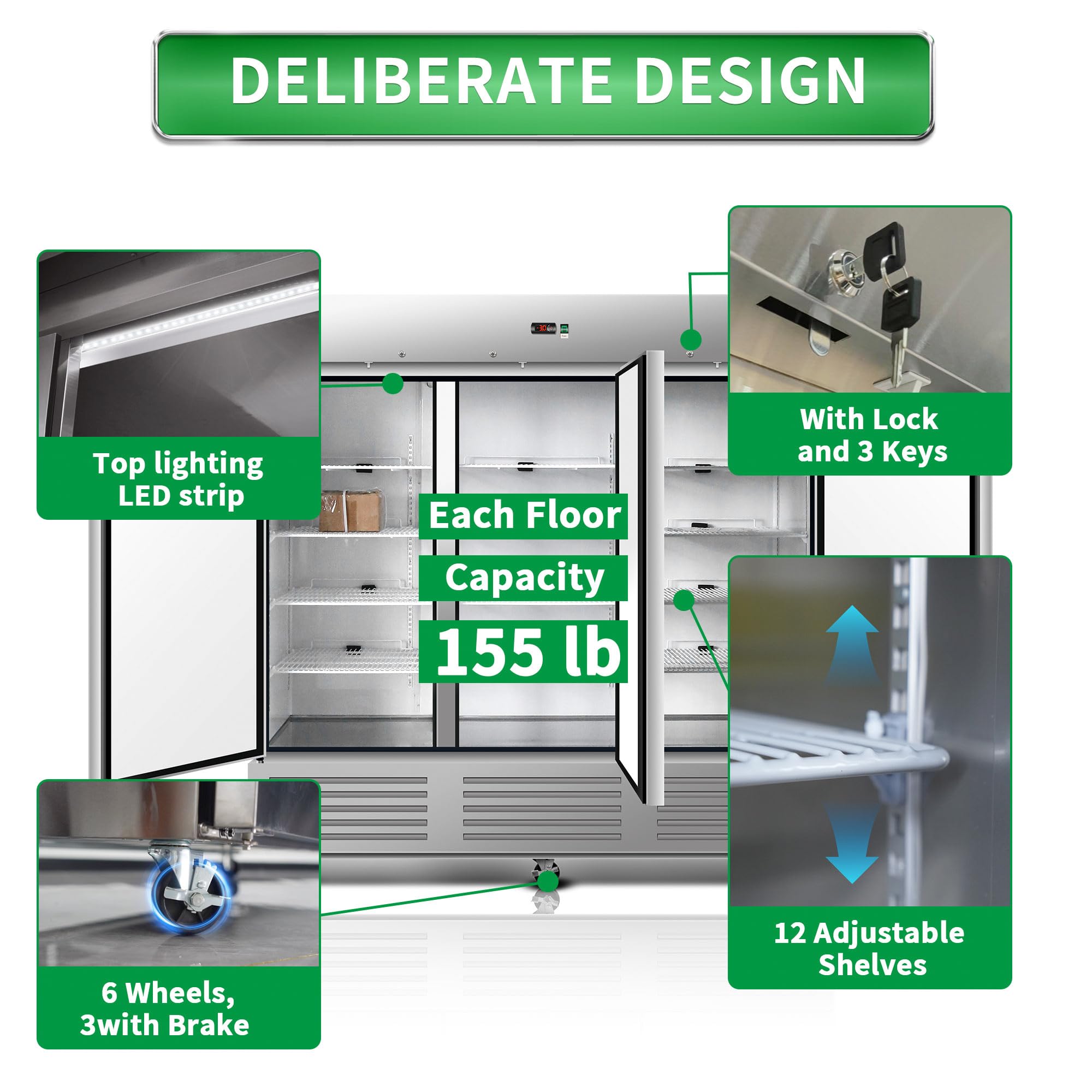 Spacious Commercial Grade Storage - 4 anti-corrosion adjustable shelves (each holds up to 155lb) maximize flexible storage for frozen foods, ice creams, and pre-prepared frozen supplies—ideal for restaurants, commercial kitchens, or convenience stores. 6 bottom wheels (3 with brakes) let you move/lock it easily; 222° wide door opening + auto-close (under 90°) boosts workflow, while top LED strip lights up every corner to quickly locate frozen items
