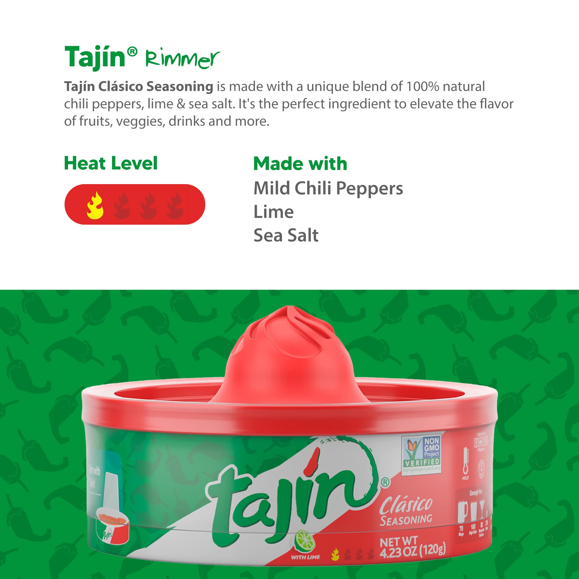 Give your favorite drinks a special zing with the Tajín Clásico Chile Lime Seasoning Rimmer! The Tajin rimmer is an easy new way to enjoy all your favorite cold beverages. Now, with just a simple twist of the wrist, you can add the unique blend of Tajin seasoning to your favorite juice or smoothie. Made with a unique blend of lime, mild chili peppers, and sea salt, the Tajin Clasico seasoning will bring out the flavor of your favorite drinks. Creating the perfect balance of zing to any beverage, the Tajin chili seasoning goes well with healthy juices, smoothies and more - this Mexican seasoning just adds a layer of flavorful spice to blends that you know and love. Of course, there's no need to worry about the heat from the Tajin Clasico seasoning with lime. The Tajin seasoning blend ensures that the sensation will be more flavorful rather than hot. The Tajin Clásico Chile Lime Seasoning Rimmer is produced in Zapopan, Mexico from world-class chilies sourced from farmers in the region and then exported to the US as a packaged and branded product to be sold at wholesale and retail.