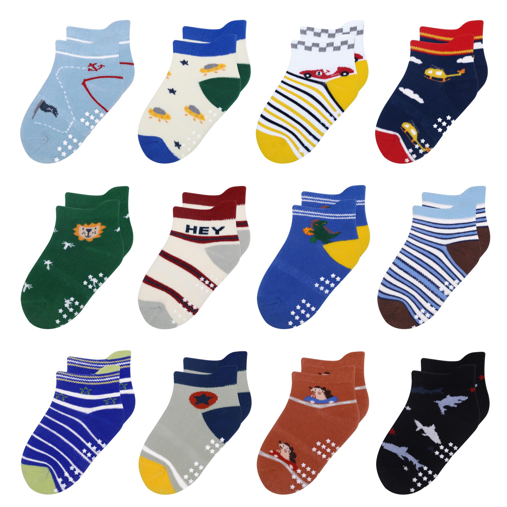 ASSORTED VALUE PACK-- 12 pairs of toddler non slip socks with fresh colors combinations at a good price. Kid boys socks suitable for children ages 1-3 years old, from shoe sizes 4-9. These kid ankle socks are easily match with multiple outfits.