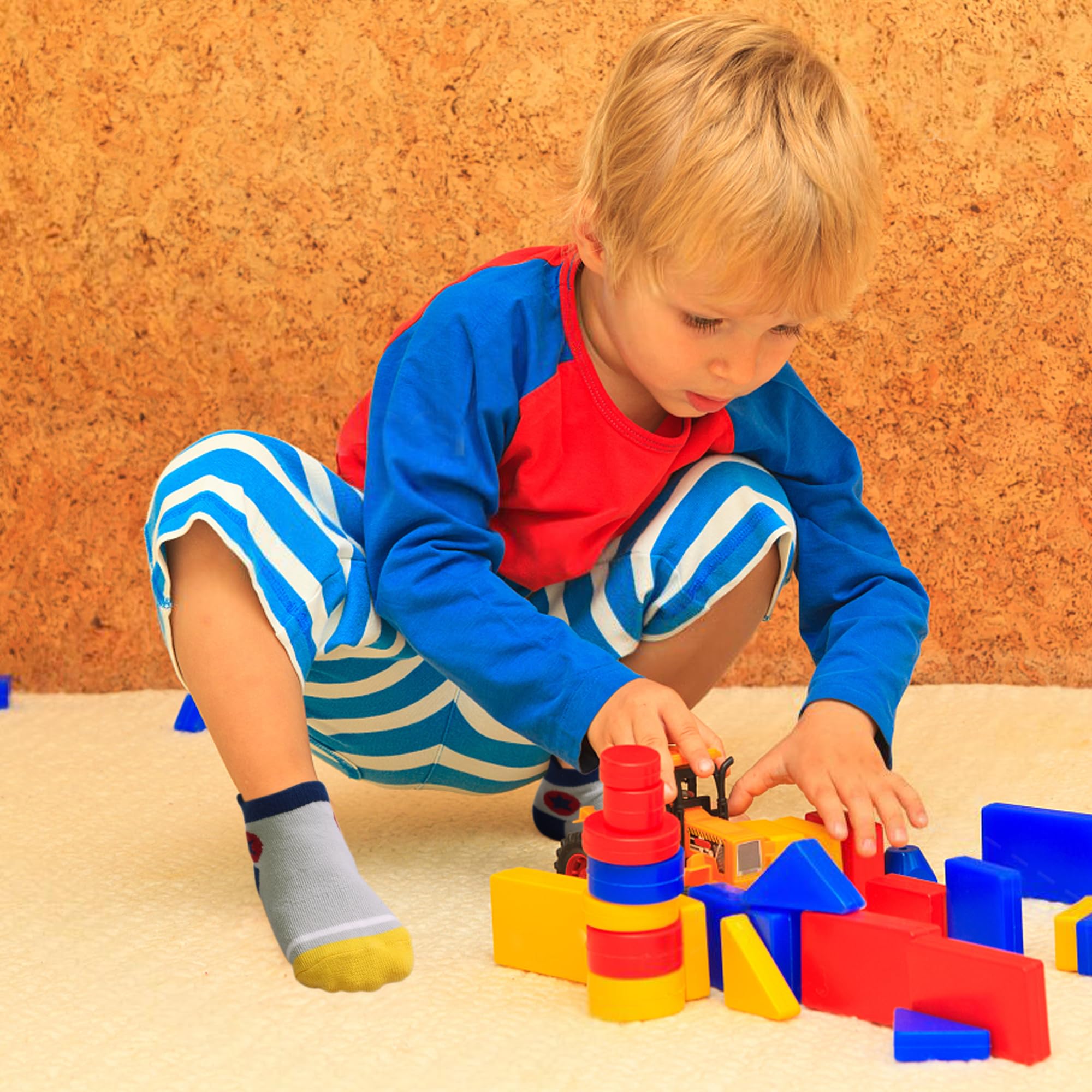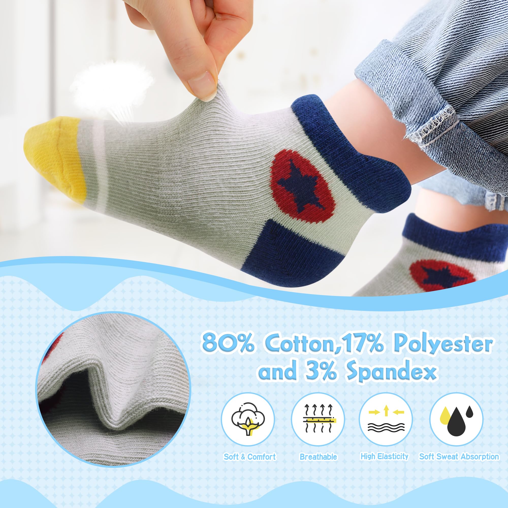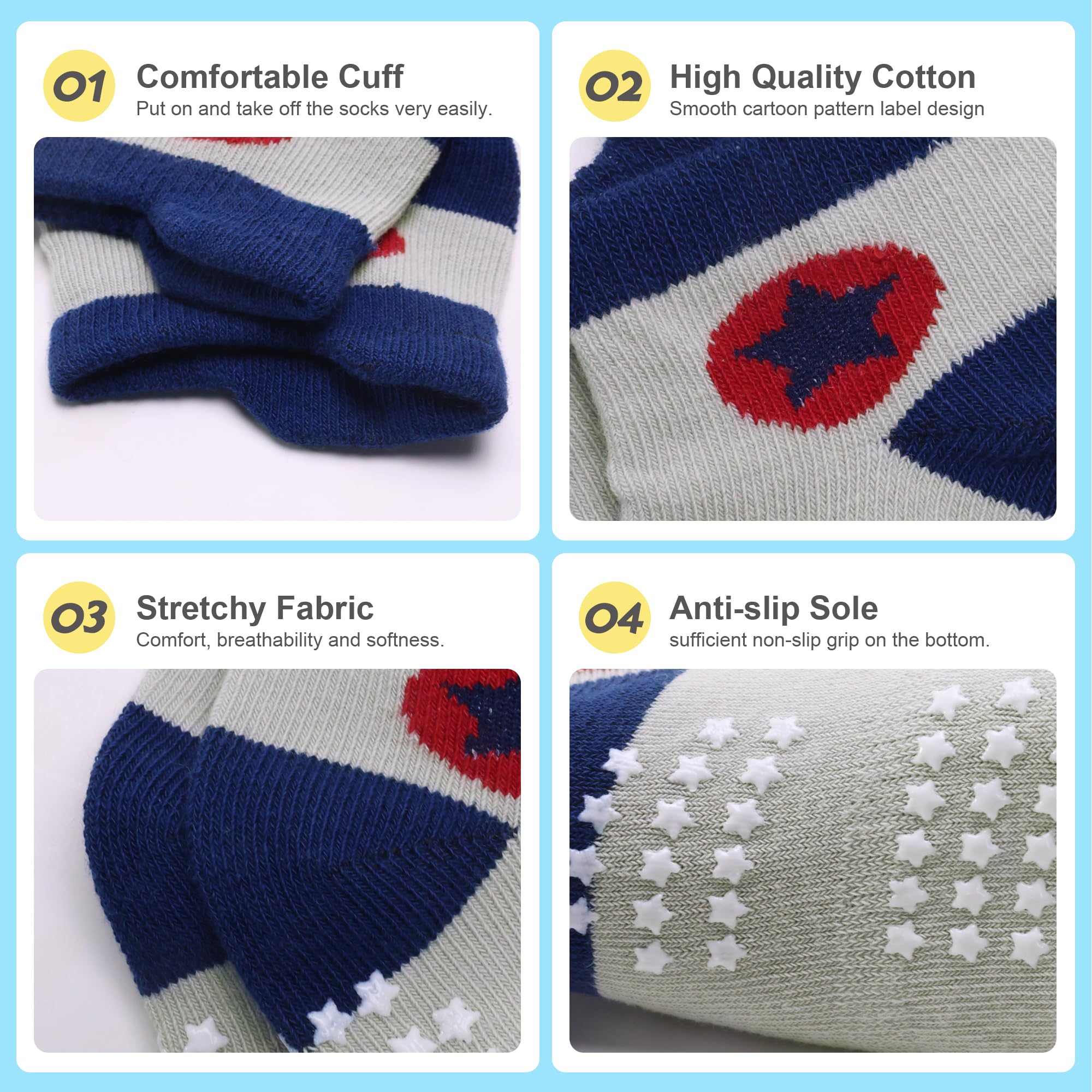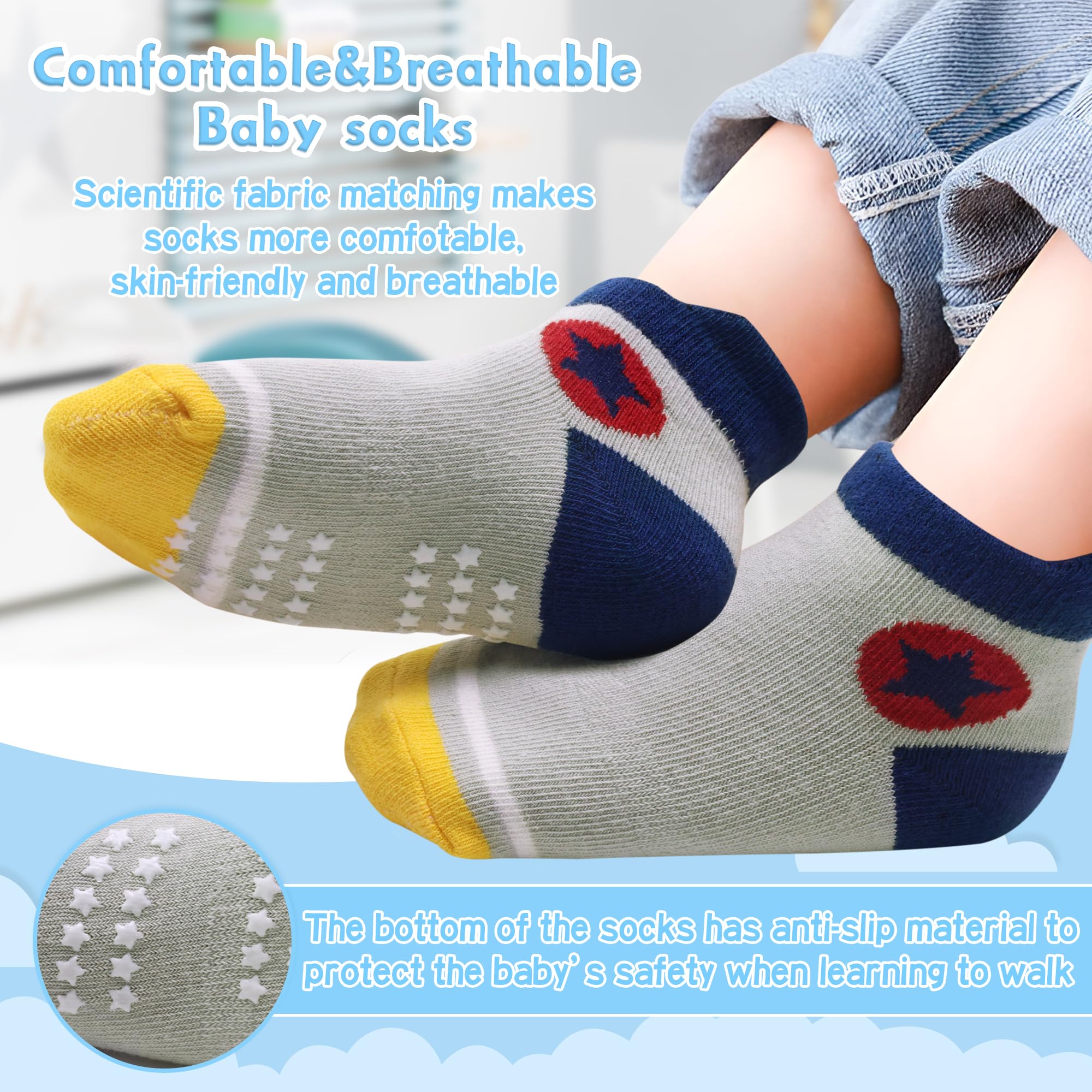 ANTI-SLIP TODDLER SOCKS-- These grip socks for boys with traction grips covers the whole sole from heel to toe. The gripper dots are smaller on the edges, bigger ones in the middle and evenly distributes maximize traction and minimize the risk of any slipping accidents.