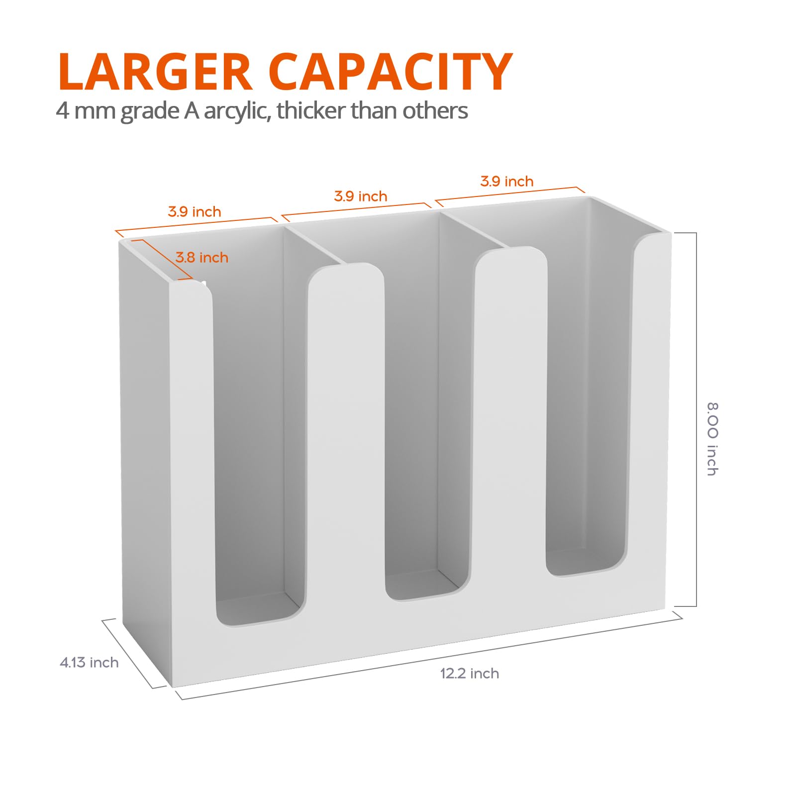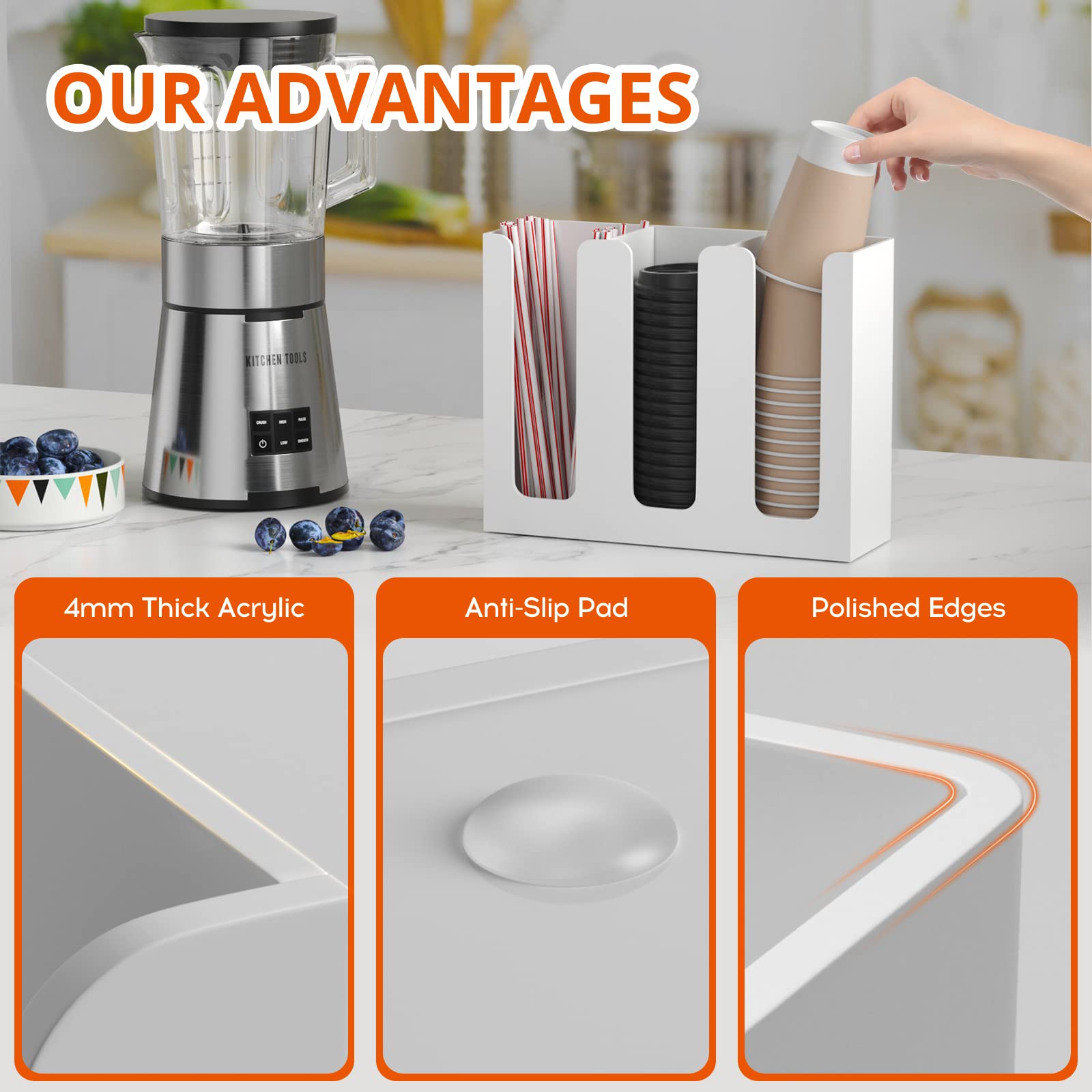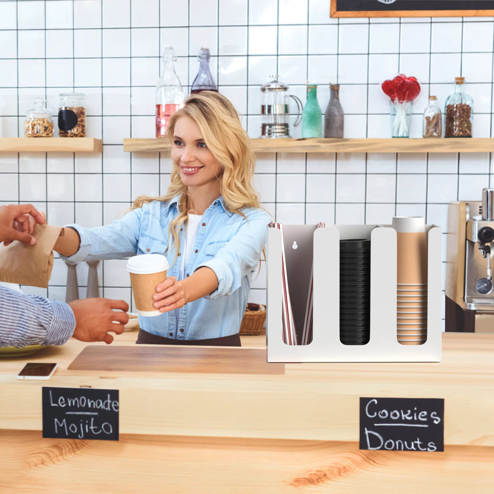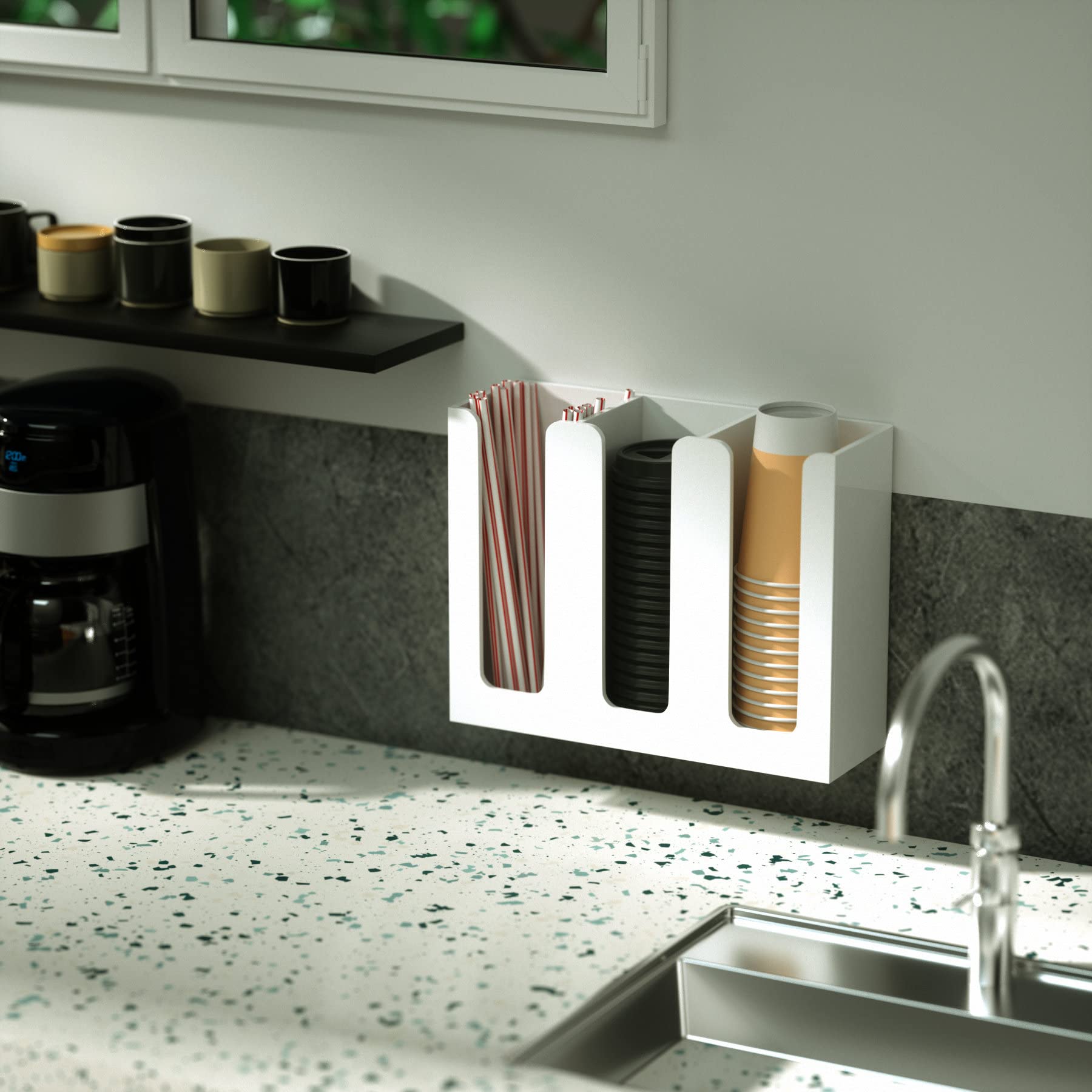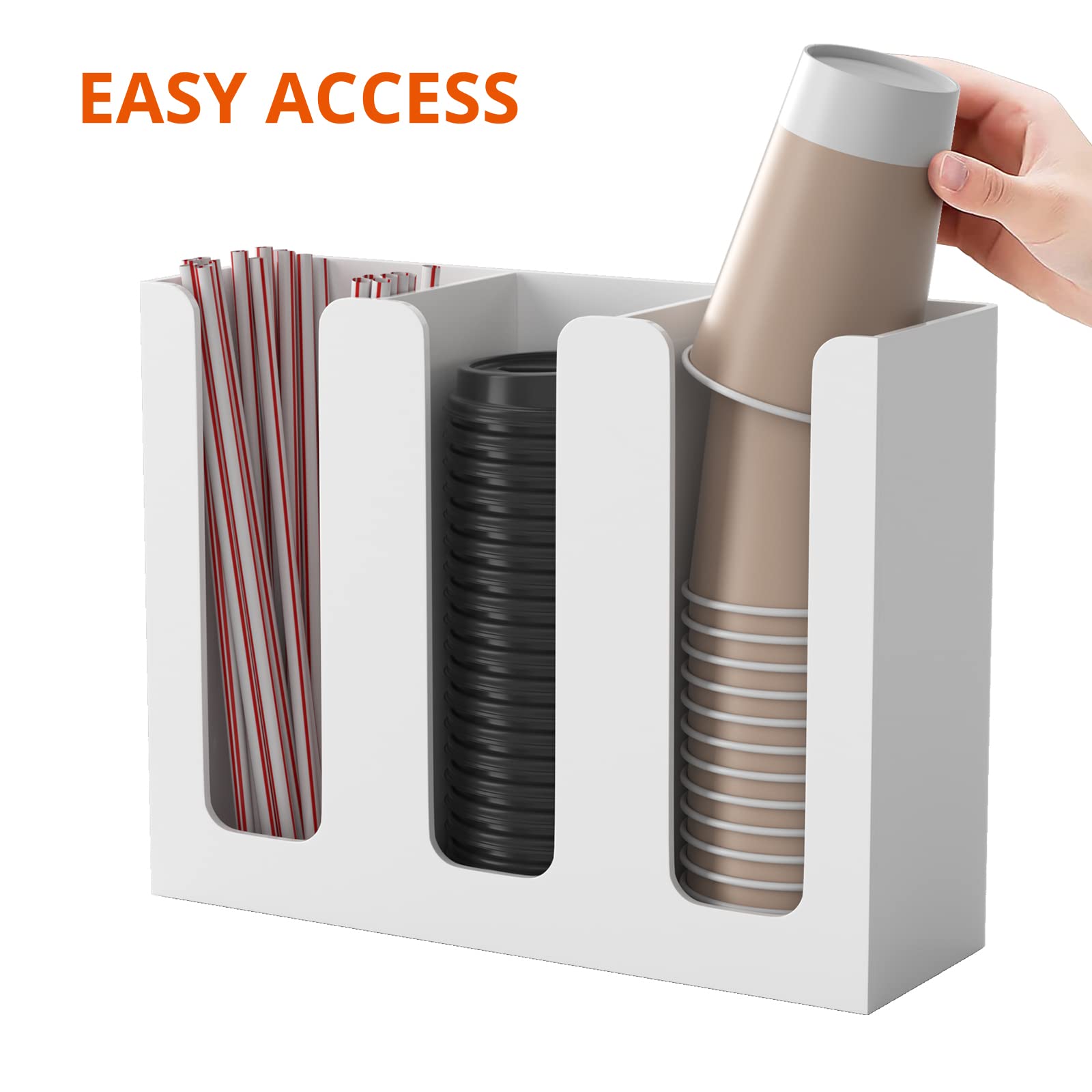 3 Section Design - the cup and lid organizer comes with 3 individual section, disposable cups and lids, coffee tea condiments can be storaged separately without any mess, it won't take much space of your countertop, making it look neater and more organized.