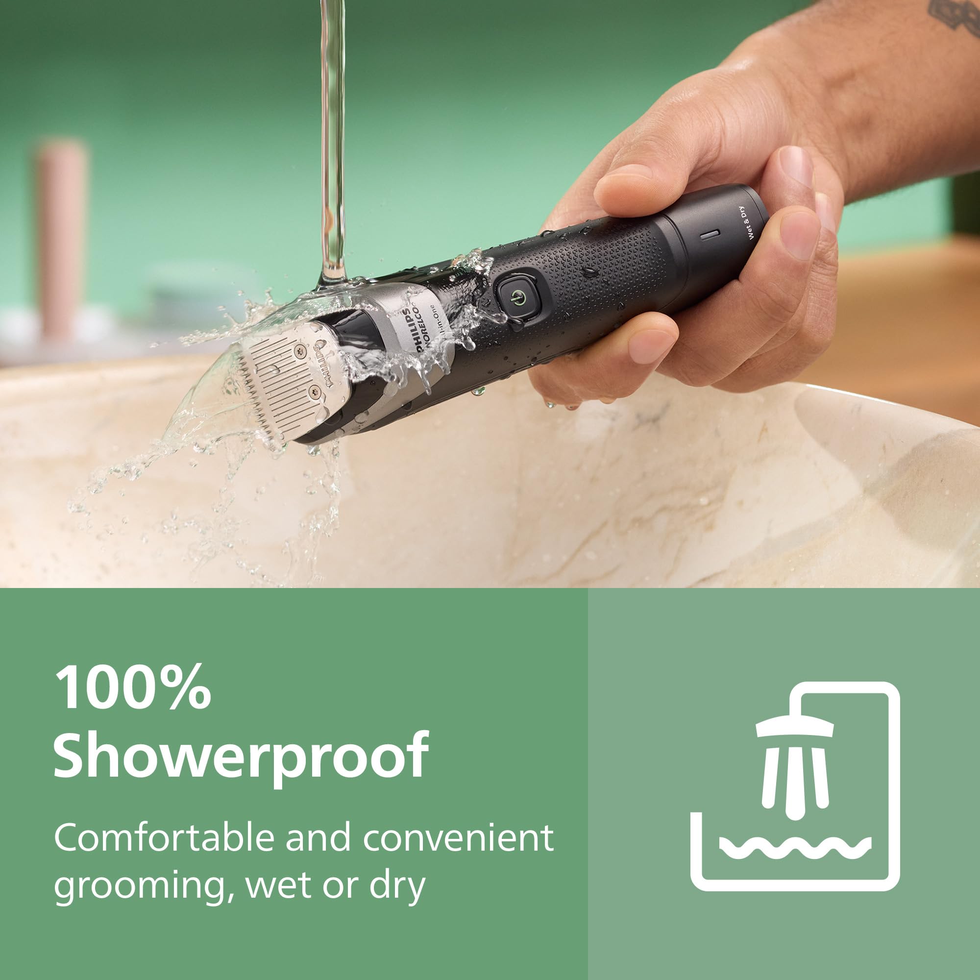 Try out a new look any day of the week with the durable Philips Norelco All-in-One 5000 series hair trimmer for men. With 21 attachments, self-sharpening titanium-coated steel blades for long-lasting precision, and a durable, lithium-ion battery with up to 3-hour runtime, this versatile and efficient electric razor for men efficiently tackles all your grooming needs. It's a hair and beard trimmer men can always rely on! Effortlessly trim and style your beard and hair with precision blades and beard combs that deliver clean, straight lines for your desired look. Use the hair-clipping comb with various length settings to maintain your hairstyle at home. With the click-on body comb ensuring a gentle, effective trim, the device also works perfectly as a body trimmer for men. Plus, you can easily remove unwanted nose and ear hair without nicks or cuts with the nose hair trimmer attachment. Achieve a precise and even trim with self-sharpening titanium-coated blades that deliver added strength for maximum precision, staying as sharp as day one with no blade oil required. Select from 0.5 to 16 mm length settings to craft your desired look to the exact length you want. The premium trimmer is easy to hold and maneuver with an ergonomic rubber grip for superior comfort and control. Built to last, the durable lithium-ion battery offers up to 3 hours of runtime for uninterrupted trimming. The battery indicator keeps you fully informed of your battery status, whether itβs low, empty, fully charged, or still charging, ensuring you're always ready for your next grooming session. With USB-A charging, it's easy to power up anywhere (adapter is not included). The trimmer is 100% showerproof, so you can use it both wet and dry for a comfortable, convenient experience, every time. Plus, itβs easy to clean too.