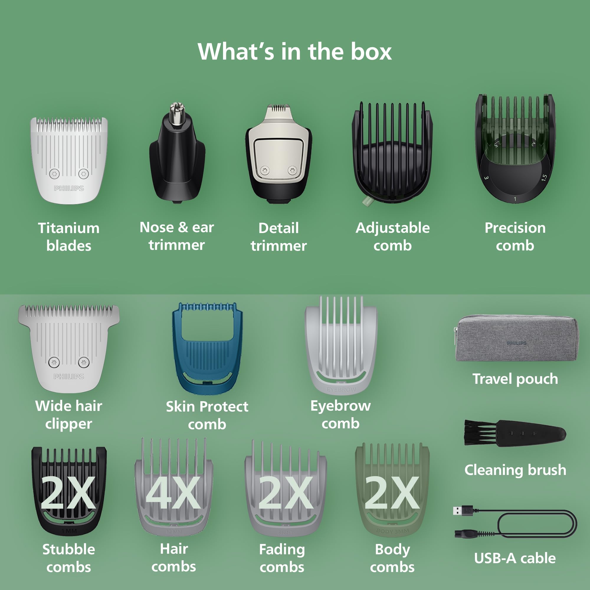 THE SET INCLUDES: 1x Philips Norelco All-in-One Trimmer 5000 Series, 1x full metal titanium-coated blade, 1x wide hair clipper (T-blade), and more; see the "what's in the box" section