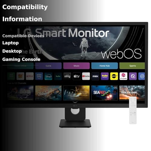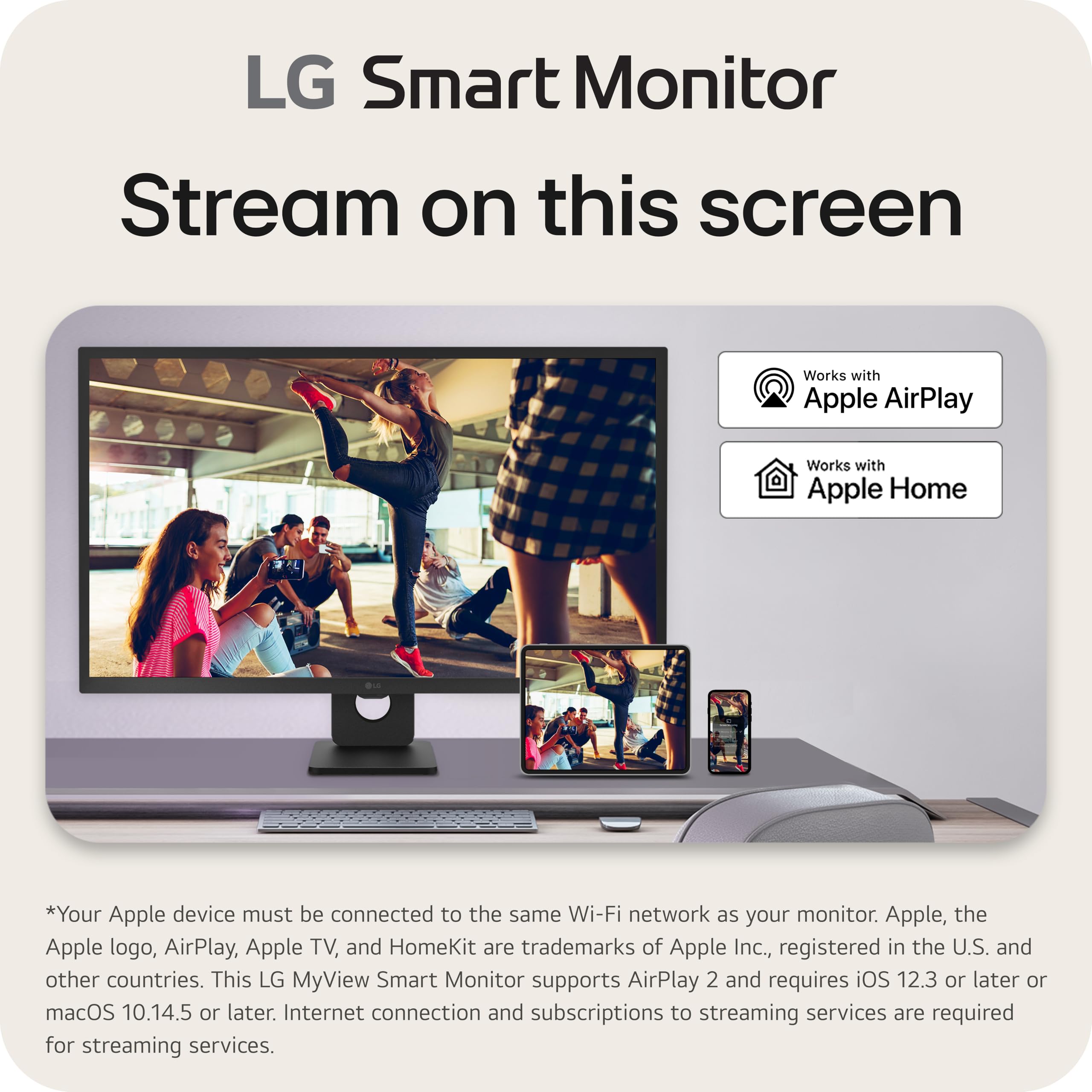 LG 32SR50F-B Smart Monitor 32-Inch FHD (1920x1080) IPS Display, webOS Smart Monitor, ThinQ Home Dashboard, LG ThinQ App, Remote Control, x2 Built-in Speakers, AirPlay 2 Screen Share Bluetooth, Black. ¹Internet connection and subscription to streaming services are required. ²Home Office services support only Microsoft 10 and 11 or higher. Microsoft 365 and Google registration and subscriptions may be required. Separate services may require payment for subscription. Supported service may vary by country. ³Internet connection and subscriptions to streaming services are required. Amazon, Prime Video and all related logos are trademarks of Amazon.com, Inc. or its affiliates. Amazon Prime membership and/or Prime Video fees apply. See primevideo.com/terms for details. HBO Max 2023 Warner Media, LLC. All Rights Reserved. HBO Max is used under license. Number of LG Channels subject to change. ⁴Your Apple device must be connected to the same Wi-Fi network as your monitor. Apple, the Apple logo, AirPlay, Apple TV, and HomeKit are trademarks of Apple Inc., registered in the U.S. and other countries. This LG Smart Monitor supports AirPlay 2 and requires iOS 12.3 or later or macOS 10.14.5 or later. Internet connection and subscriptions to streaming services are required for streaming services.