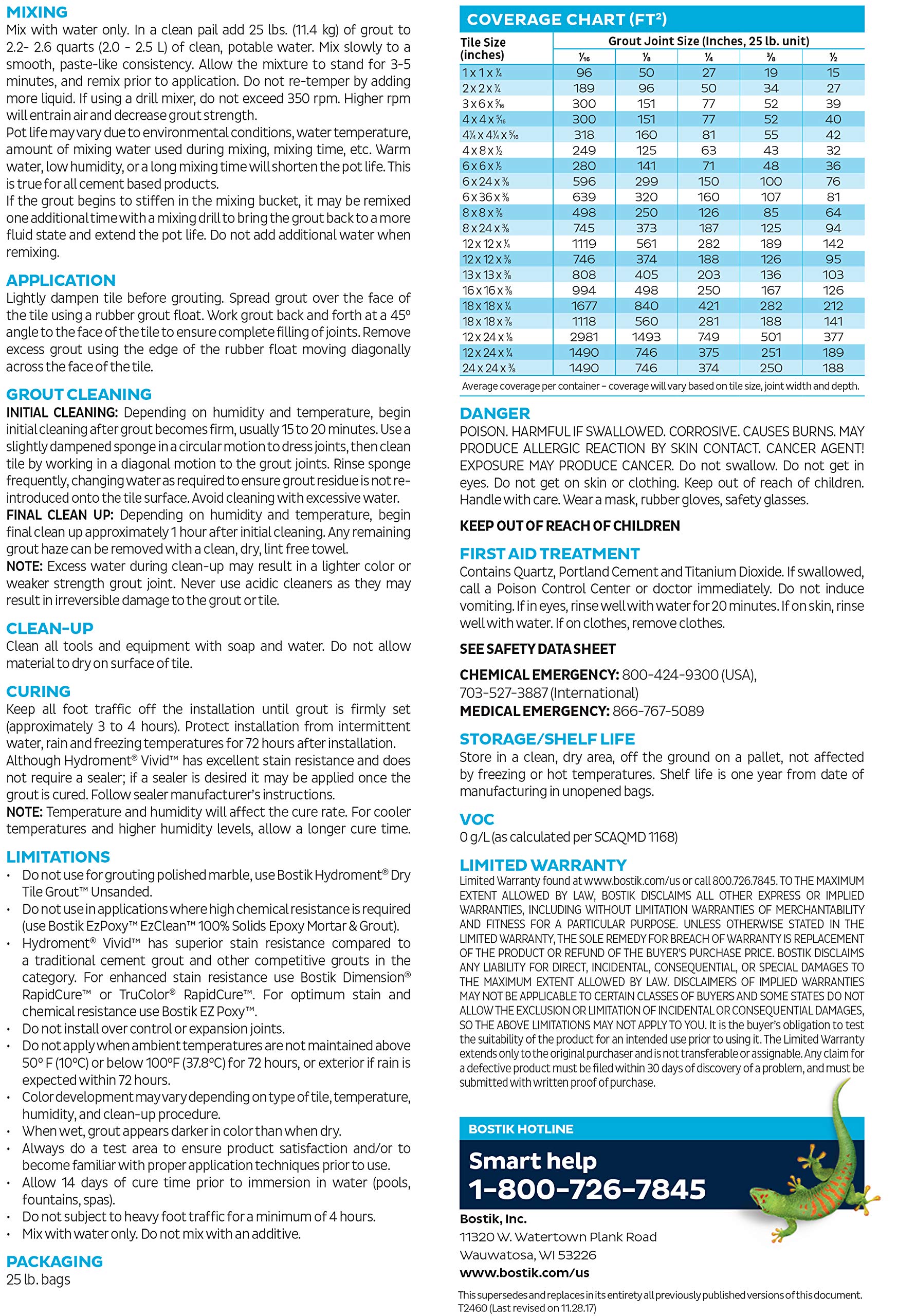 Hydroment Vivid is a rapid curing, premium grade, stain resistant cementitious grout developed with the scientific breakthroughs of Bostik’s HyDriX and Color Suspension Technologies for demanding commercial and residential projects. It offers consistent color technology with enhanced stain and efflorescence protection.