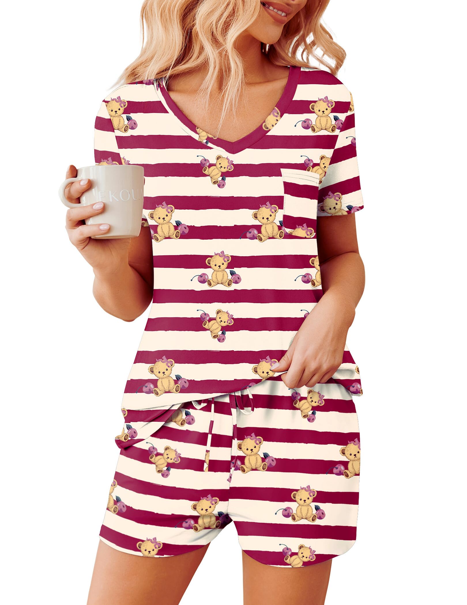FEATURES: pajama sets for women 2 piece, pj sets for woman, V neck women's pajama sets, short sleeve T-shirt, drawstring elastic waist shorts.