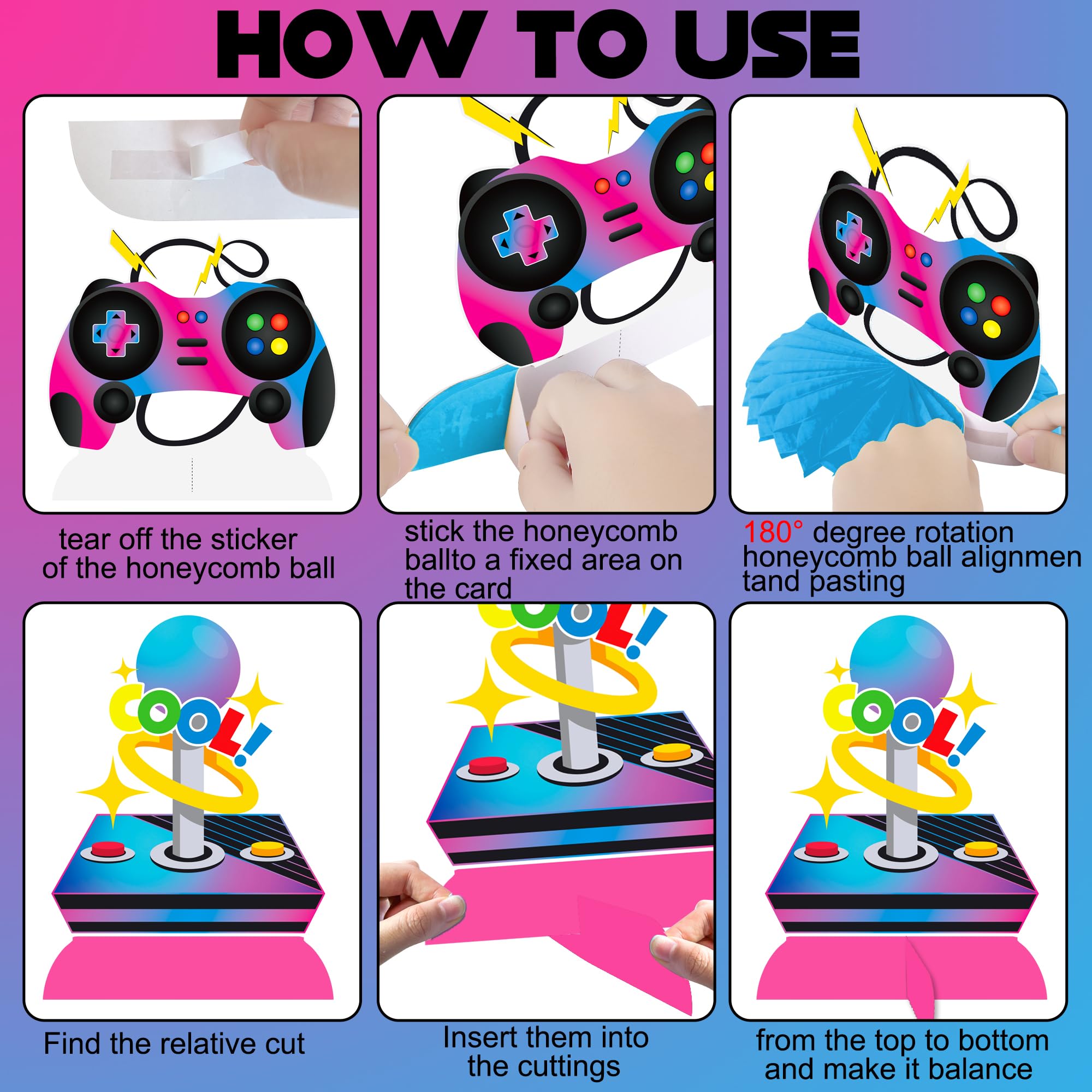 ❤【Installation instructions】Convenient game zone party supplies are able to be assembled in minutes. Just tear off the sticke and spread the honeycomb base 180 degrees, then stick the honeycomb ball to a fixed area of the card, and repeat on the other side. Quick and simple, save you a lot of time.