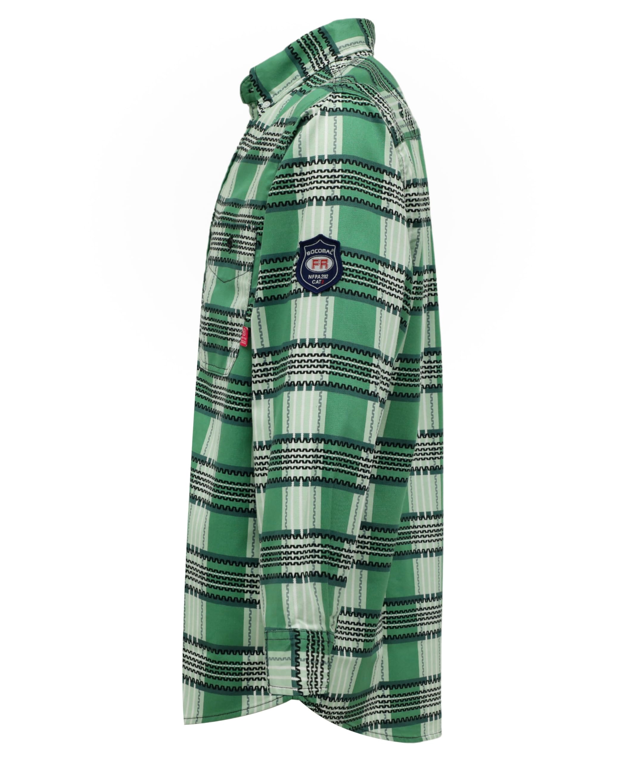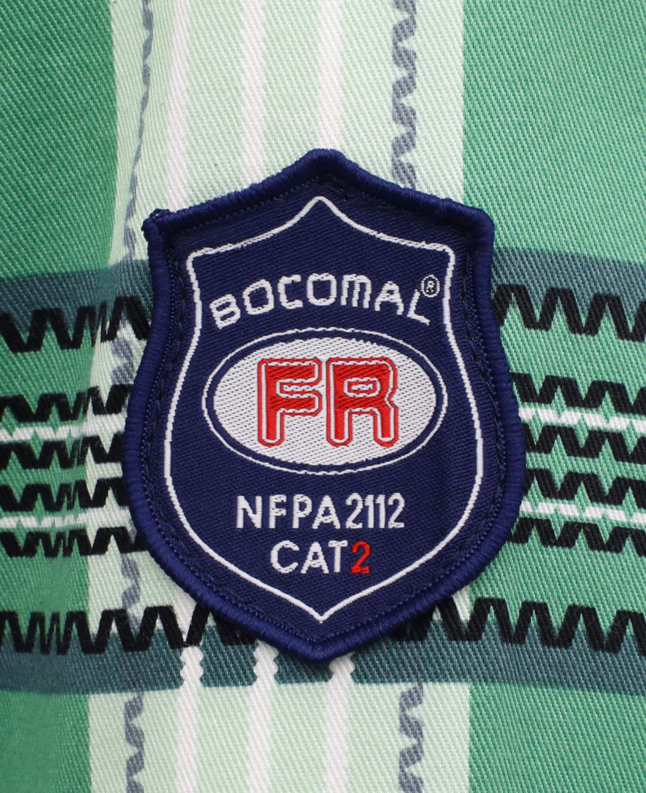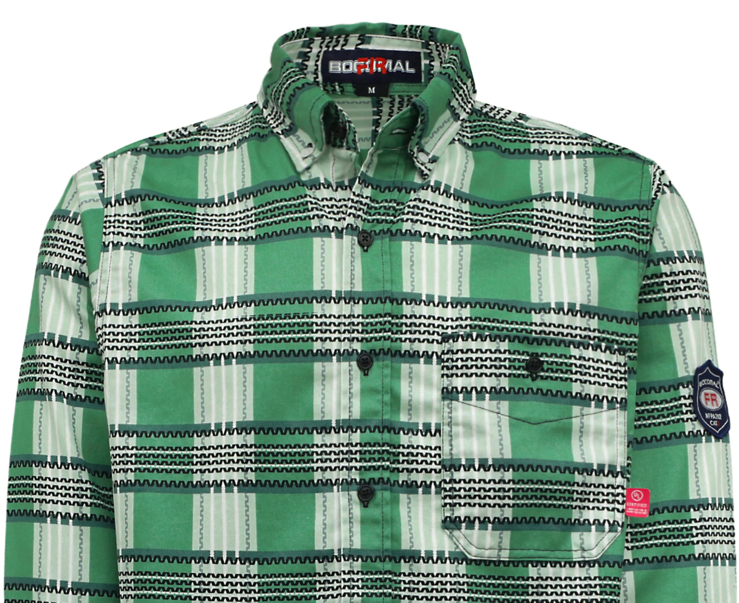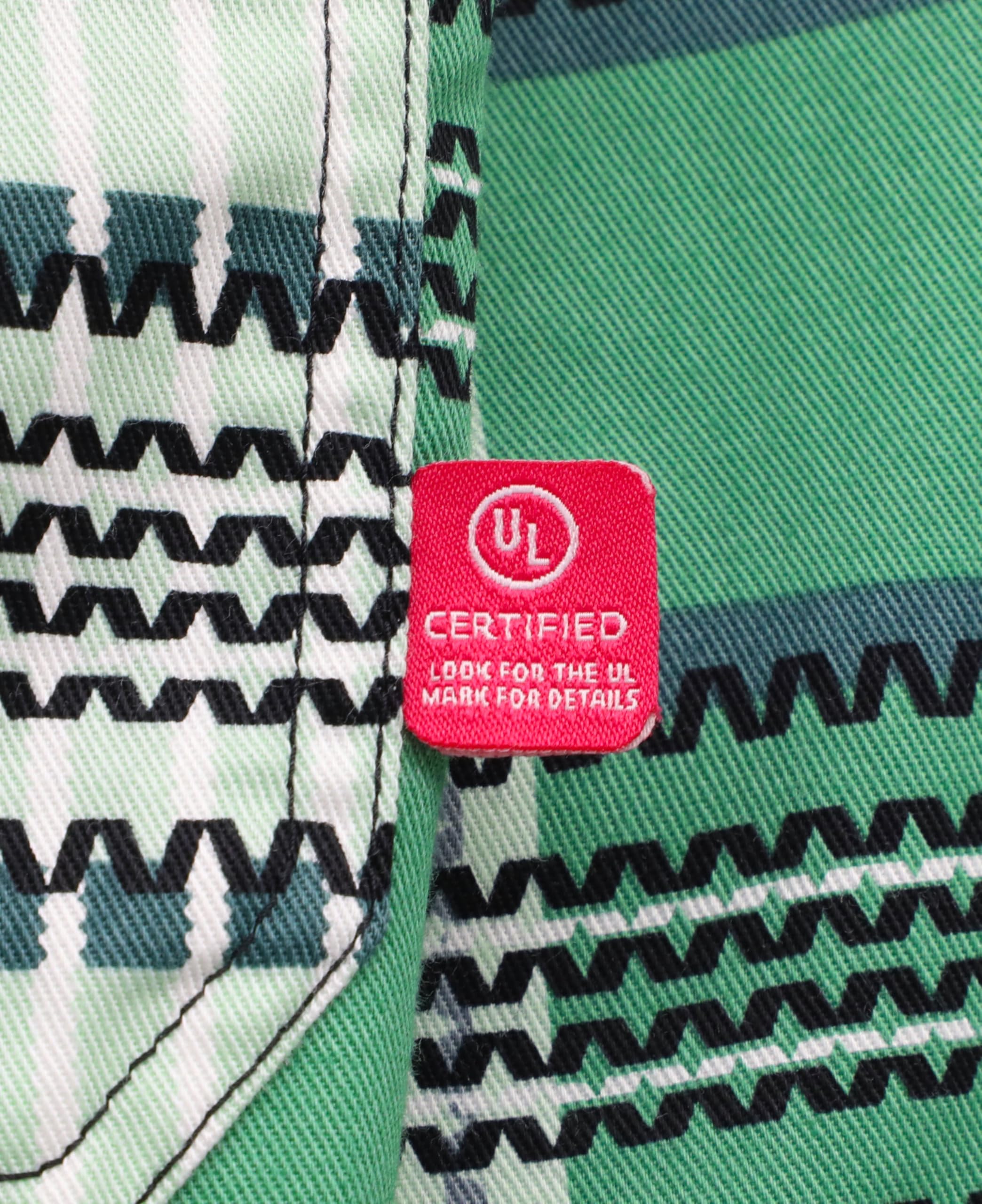FR MATRIALS LIGHT WEIGHT:6.5OZ Cotton Printed Plaid,They feature FR buttons and are stitched with FR sewing threads for added safety.Eyecatch FR Tag on pocket.Additionally,the inside tag provides more information about UL certification. As a bonus, we have included a small sample inside the package for customers to try out the FR properties firsthand.