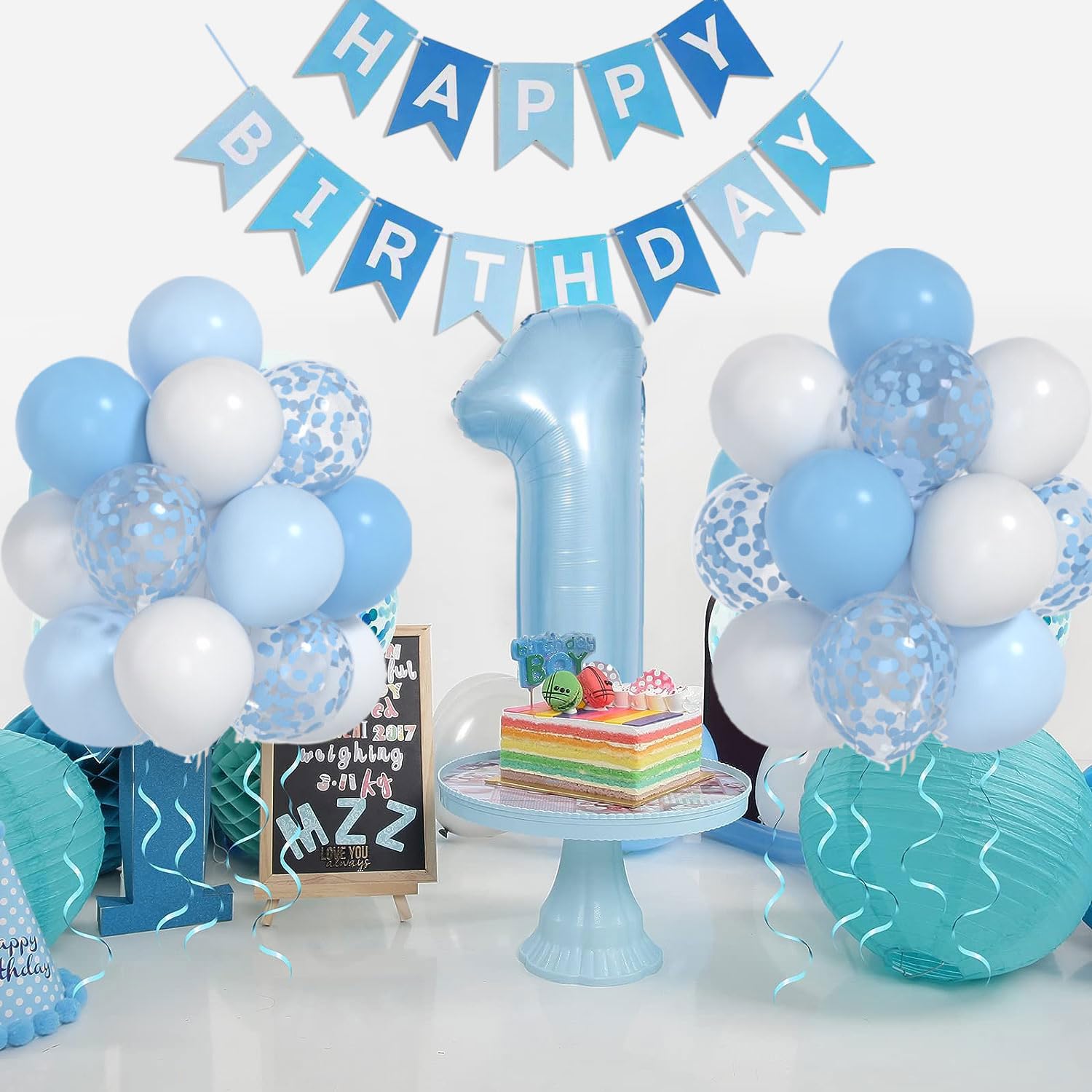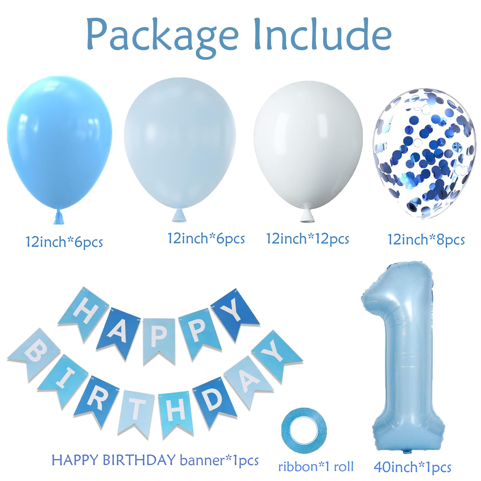 【VALUABLE PACK】32pcs One Balloon for First Birthday Kit include: 40inch blue 1 balloon, blue HAPPY BIRTHDAY banner, 6pcs 12inch pastel blue balloons, 6pcs 12inch light blue balloons, 12pcs 12inch white balloons, 8pcs blue confetti balloons.