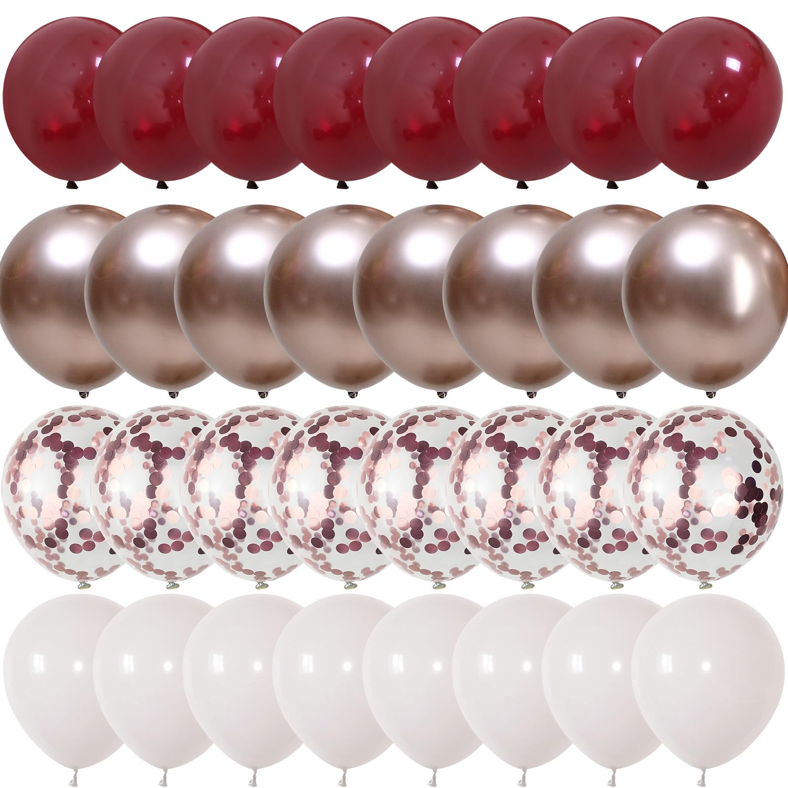 Party Balloons Set: The burgandy balloons set have 35pcs 12 inch helium balloons, include 12pcs dark red balloons, 8pcs metallic rose gold balloons, 10pcs pearllllll white balloons, 5pcs chrome rose gold confetti balloons, 1pc rose gold balloon ribbon.