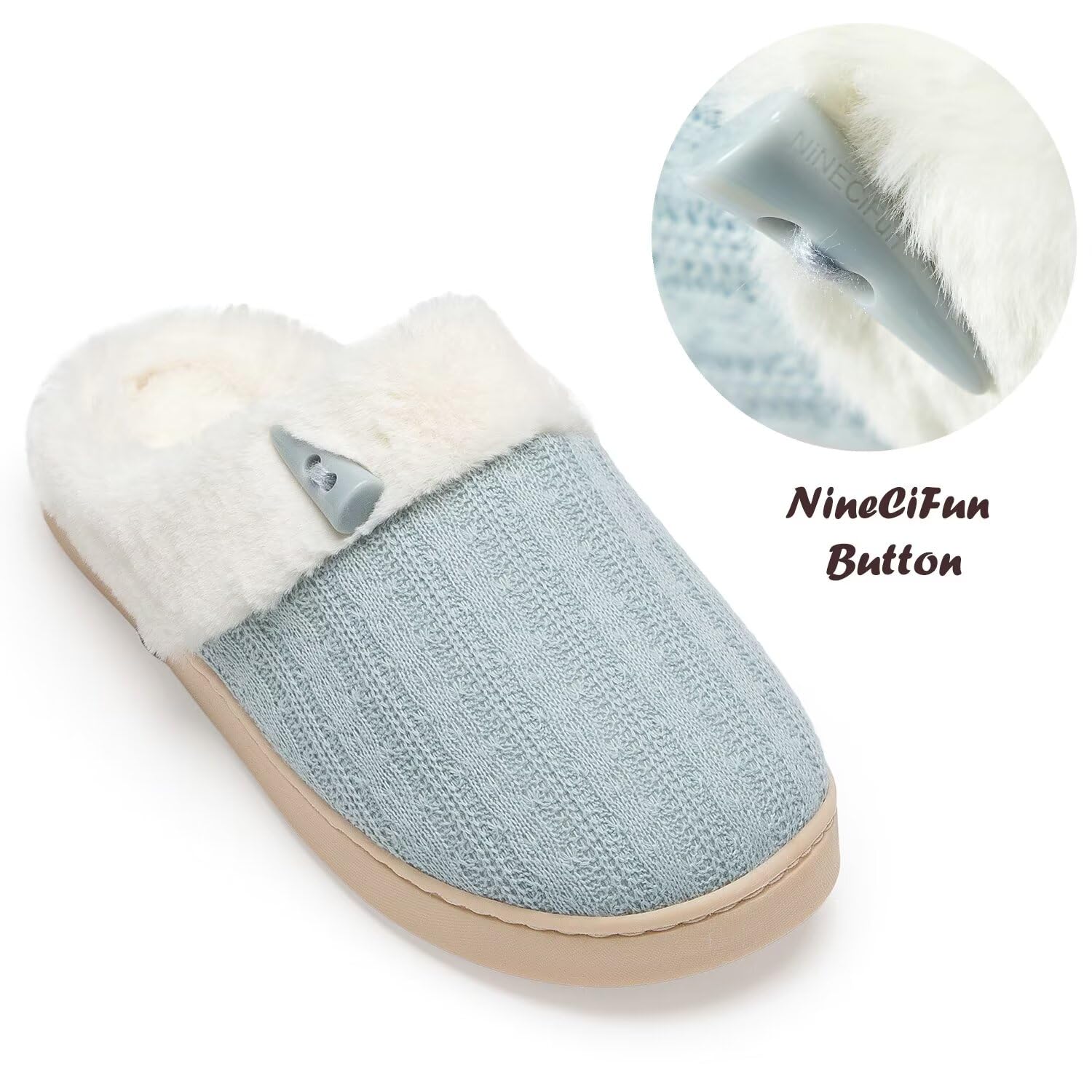EASY SLIP ON STYLE:Step into comfort easily with these open back fuzzy bedroom slippers that are made with fluffy plush.Soft plush faux fur lining offers superior comfortability from the clouds.Also these comfy house shoes are so chic with knitting upper and horn button design.They're the perfect house slippers for women and girls.