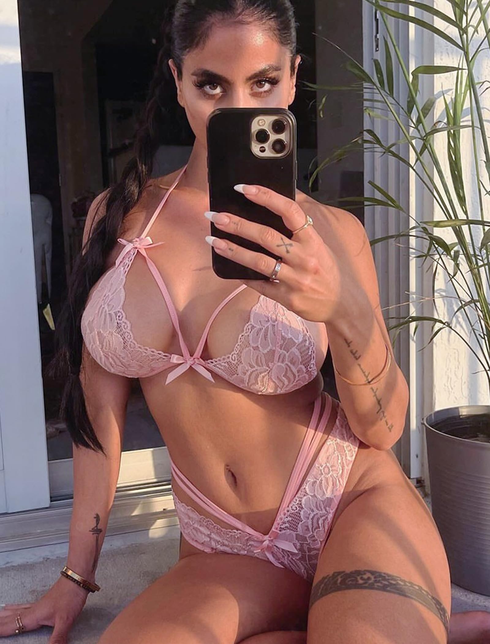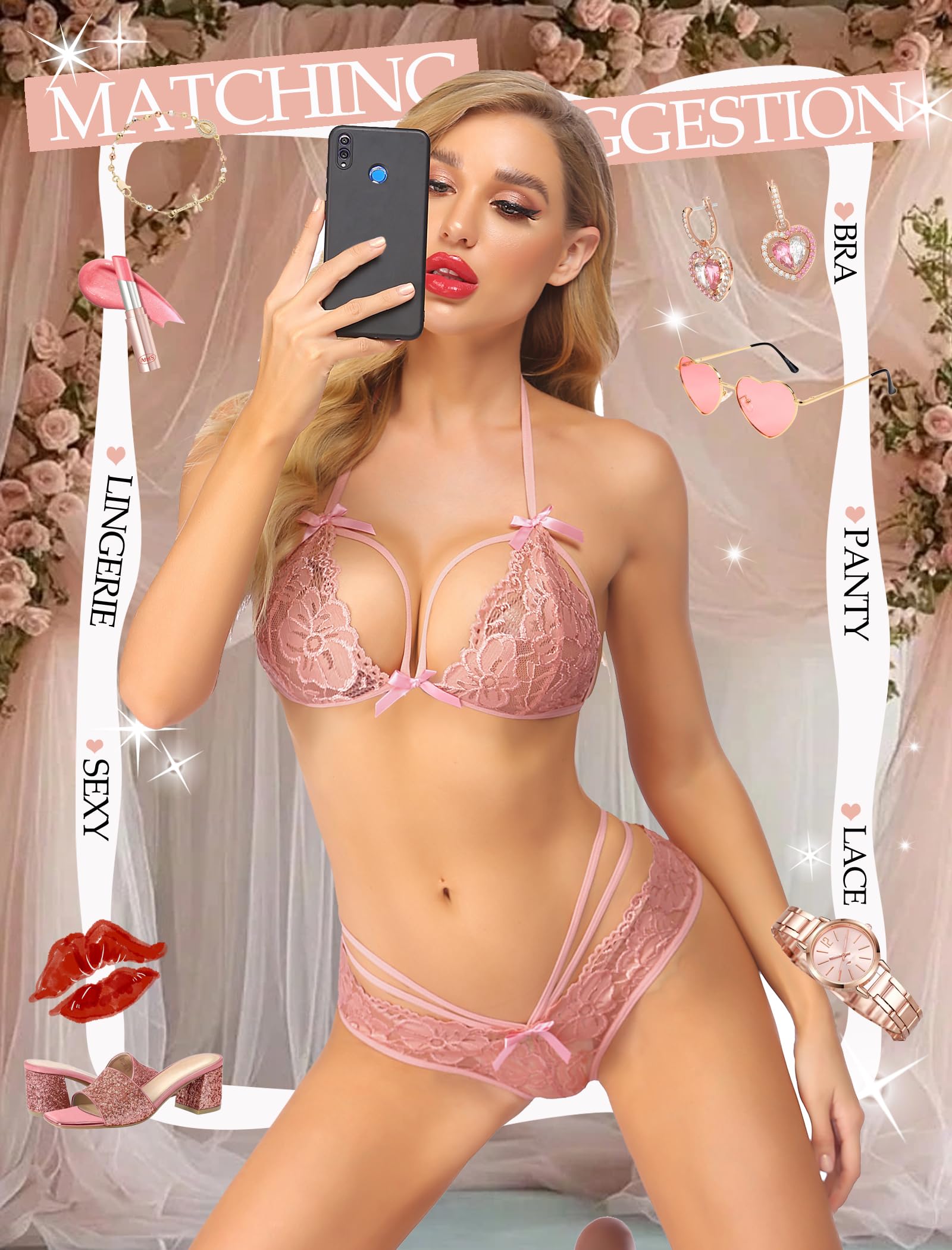 Featuring halter V neck with bow decoration ,Hollow Floral Lace, Sexy Design, Bra and panty set two piece lingerie set