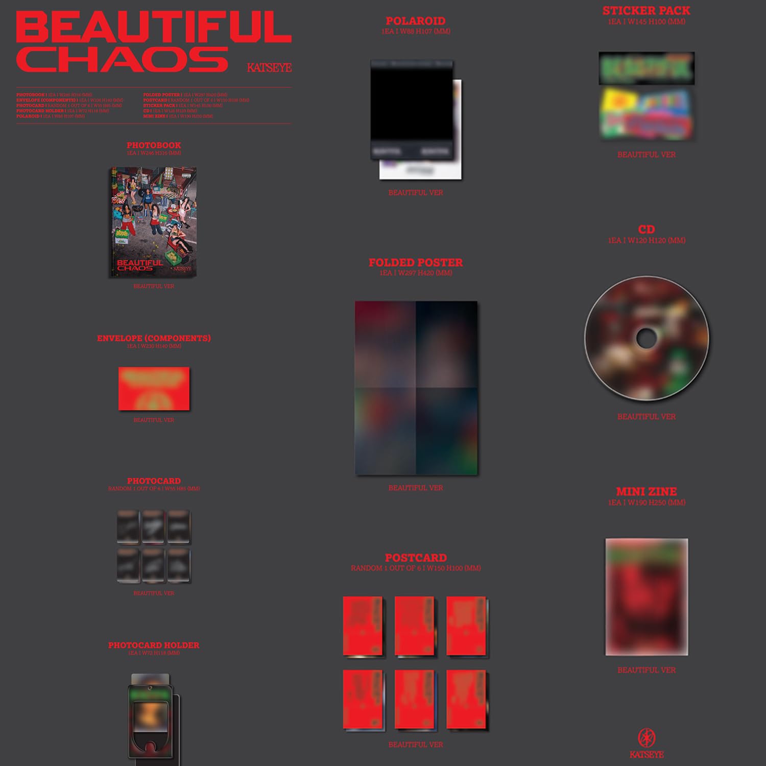 Made from Korea, Republic of Officially distributed Brand New & Factory Sealed. Will be Count Towards Hanteo and Gaon Chart. ───────────────────────── ♡ KATSEYE - [BEAUTIFUL CHAOS] ───────────────────────── [ FEATURES ] □ Release Date ■ 2025.06.27 ───────────────────────── □ Version ■ BEAUTIFUL Ver. ───────────────────────── □ Components ■ Photobook ■ Envelope ■ Photocard (1 of 6,Random) ■ Photocard Holder ■ Polaroid ■ Folded Poster ■ Postcard (1 of 6,Random) ■ Sticker Pack ■ CD ■ Mini Zine