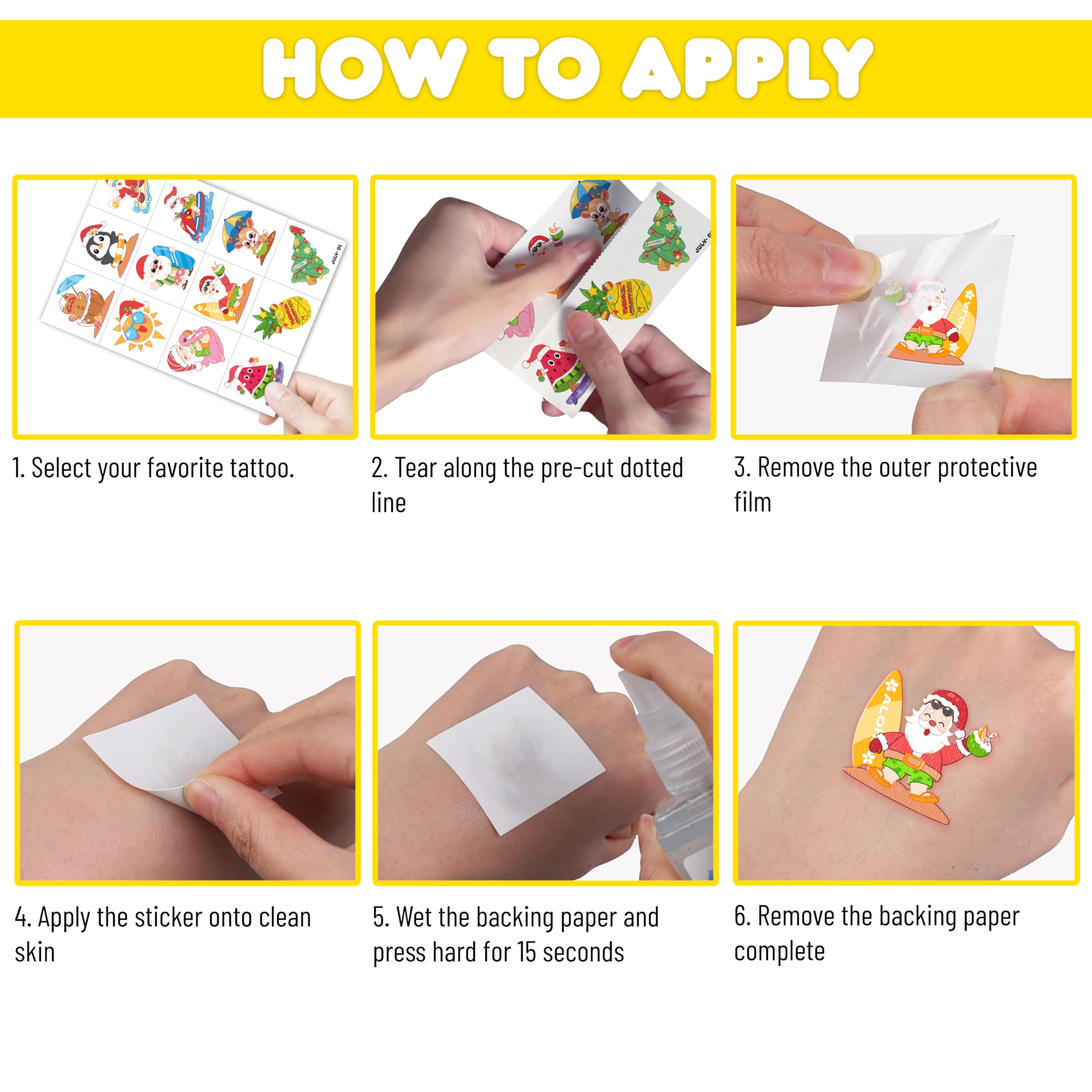 Simple Application: With just a few easy steps, your child can apply these tattoos effortlessly. Tear off the tattoo of choice and remove clear sheet. Place tattoo face down on skin. Wet the tattoo thoroughly. After 15-20 seconds, gently remove the backing paper. Allow the tattoo to dry. These delicate stickers are usually retained all days and can be cleaned with baby oil or hand sanitizer.