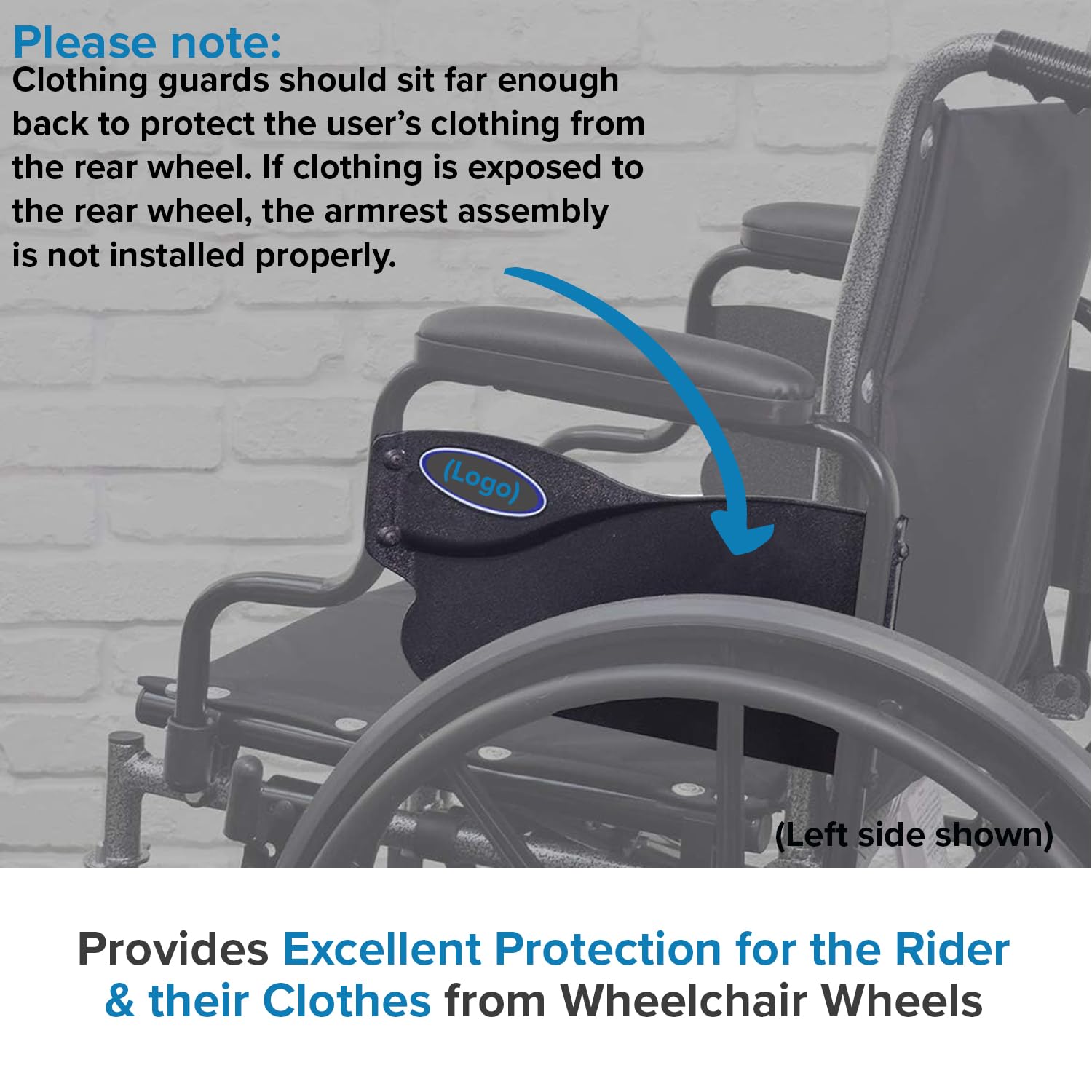 If the user's clothing is exposed to the rear wheel, the armrest assembly is not installed properly. The clothing guard should sit far enough back to protect the user's clothing from the rear wheel