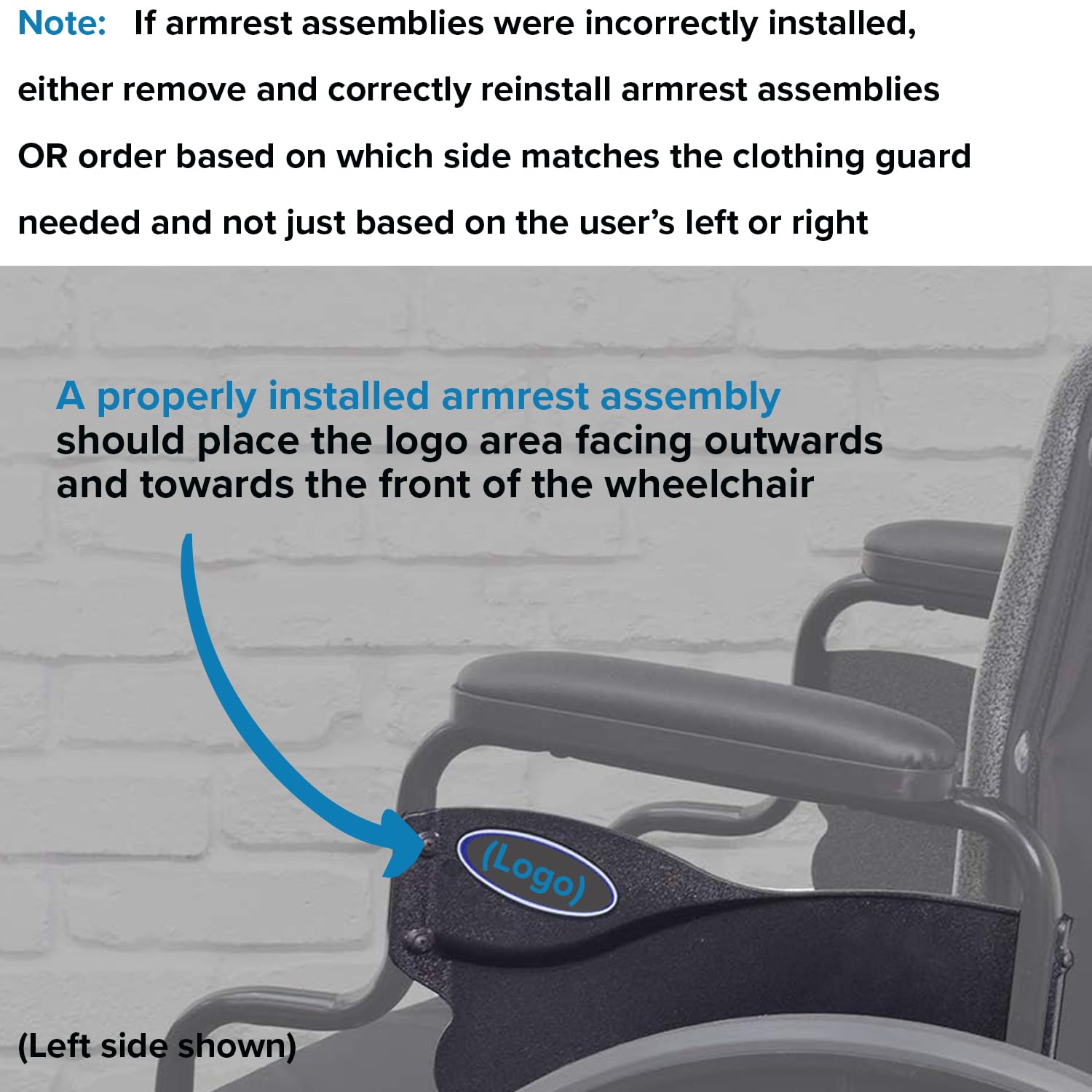 A properly installed armrest assembly should place the logo area facing outwards and towards the front of the wheelchair
