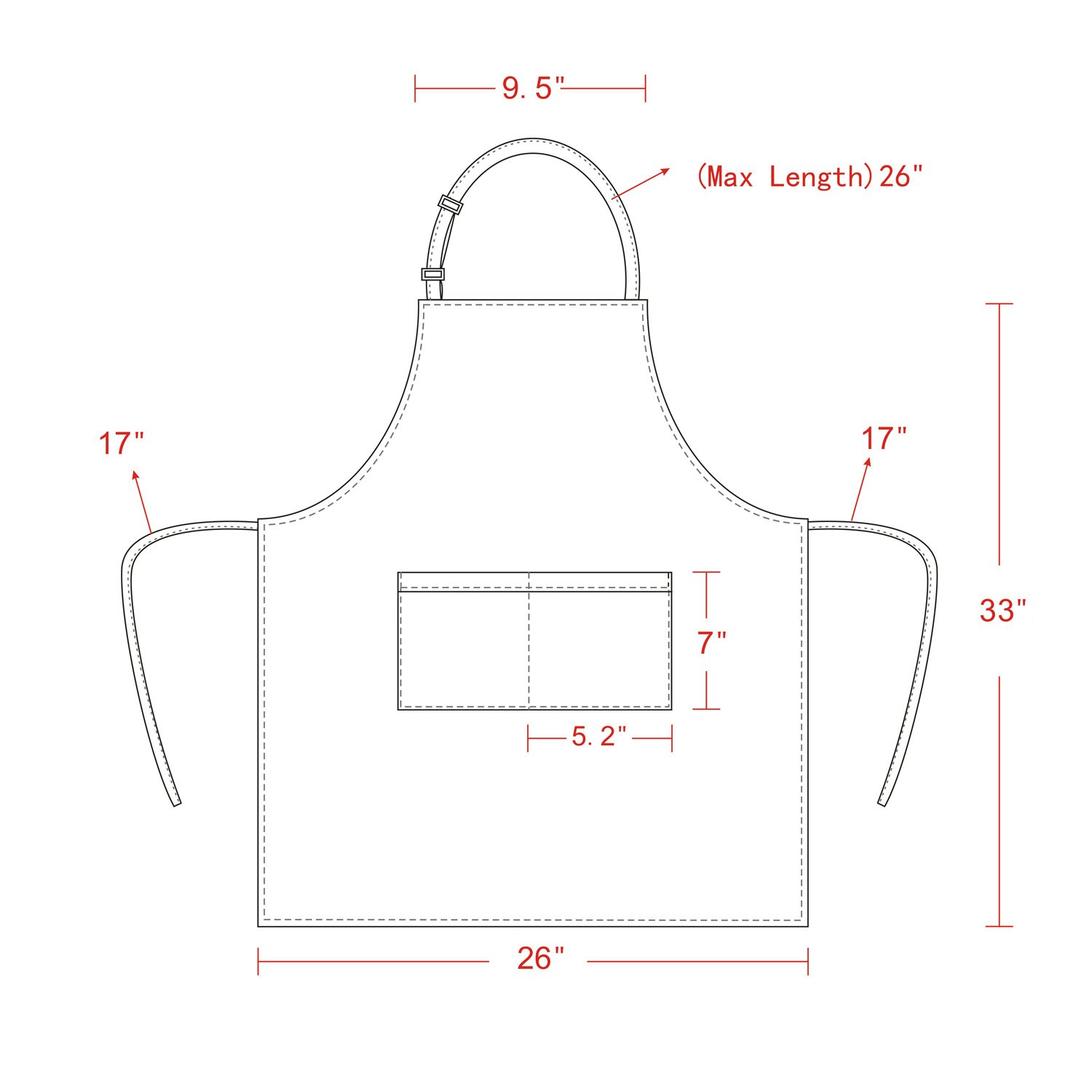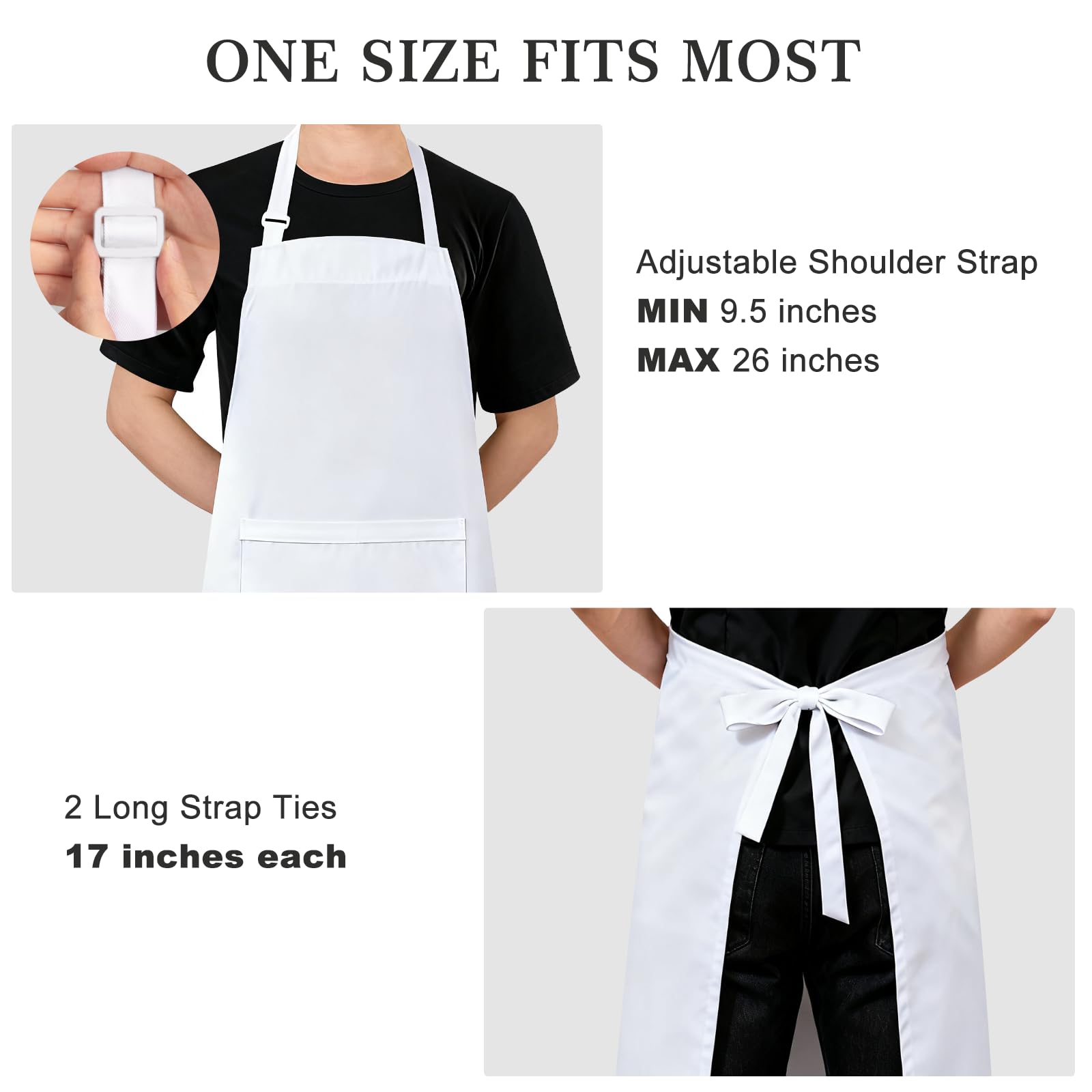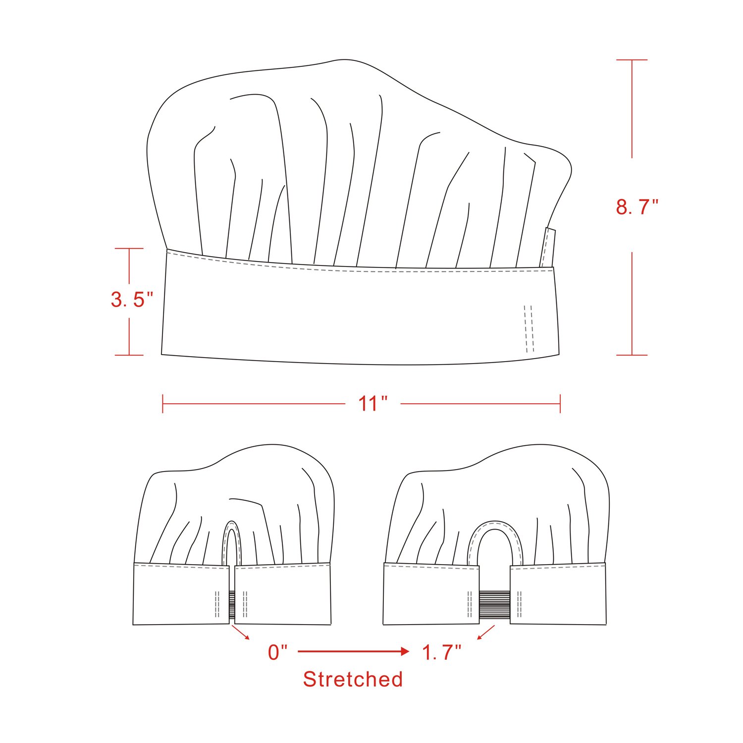 ADJUSTABLE: One size fits most. Each unisex apron measures 33"L x 26"W (at bottom) and features an adjustable neck strap and tie back. The bakers hat hides an adjustable elastic band stretchy to fit most adults (minimum head circumference of 22", can be stretched to up to 25.4")
