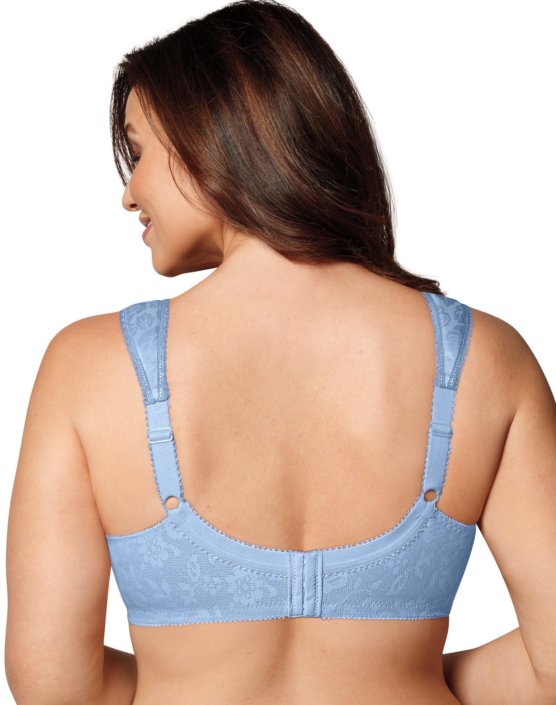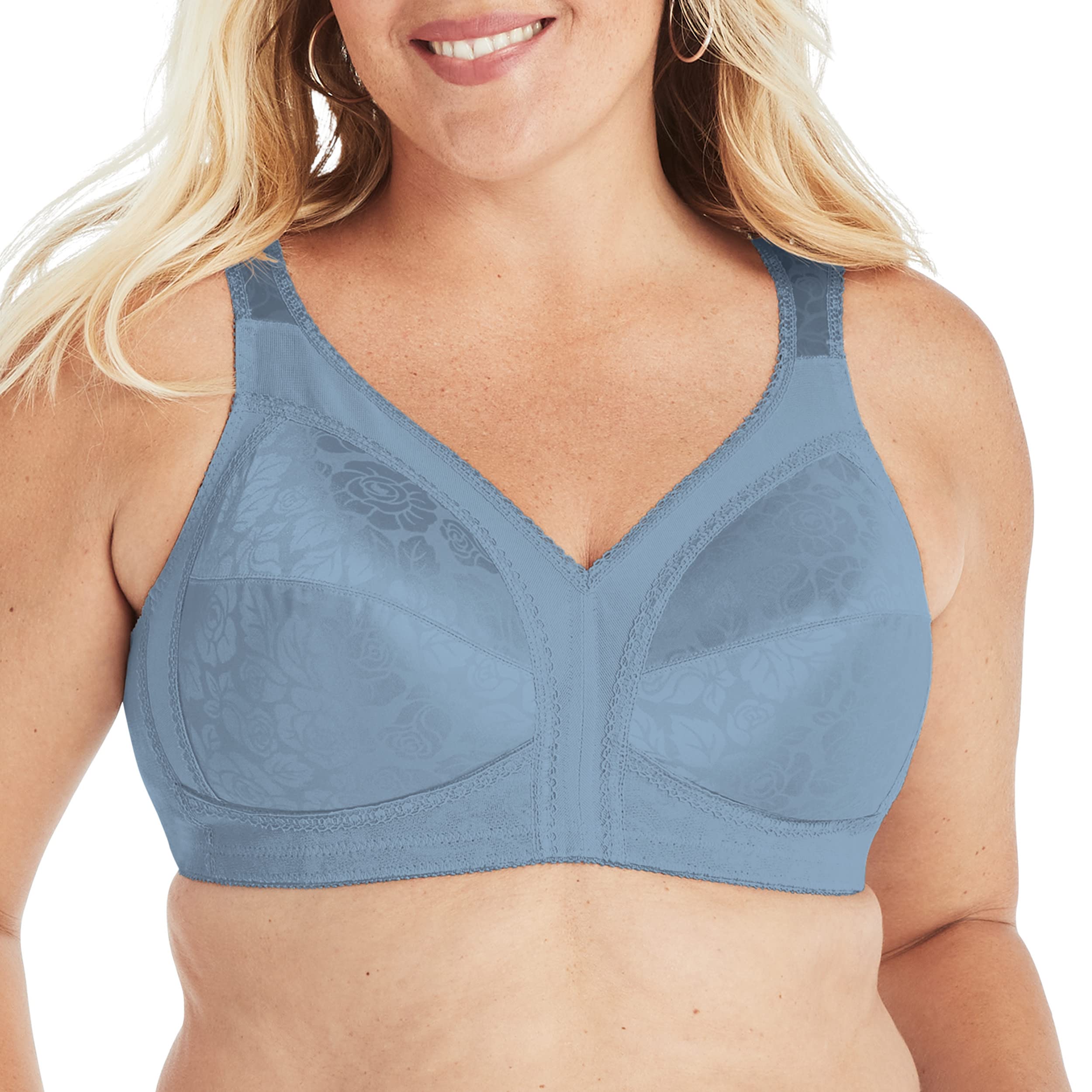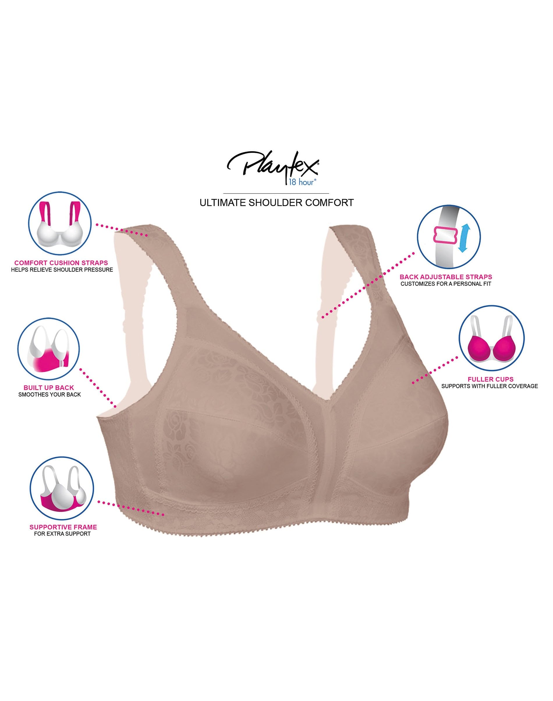 Description One of our customers said it best: "Finally found a bra that fits...great support, very attractive and very comfortable" This wireless bra from Playtex® is part of the famous 18 Hour® collection, a go-to favorite for so many customers who value wirefree comfort but need superb support. This wireless bra is fashioned around the famous Playtex M-frame that comfortably conforms to your shape. With a pretty, satiny floral print, this wireless bra is designed with the Playtex® 4-way TruSUPPORT® system that provides higher sides for bulge control, fuller, softly seamed cups for natural shaping, wider straps for all-day ease, and a smoother back for enhanced stability. The stay-in-place straps play an important role in the comfort of this full-coverage bra, with a wider, cushioned design that helps relieve shoulder pressure for no-dig comfort. And you'll love the Tagless® styling for itch-free comfort. Step up to the superior fit and dreamy comfort of this 18 Hour bra from Playtex.