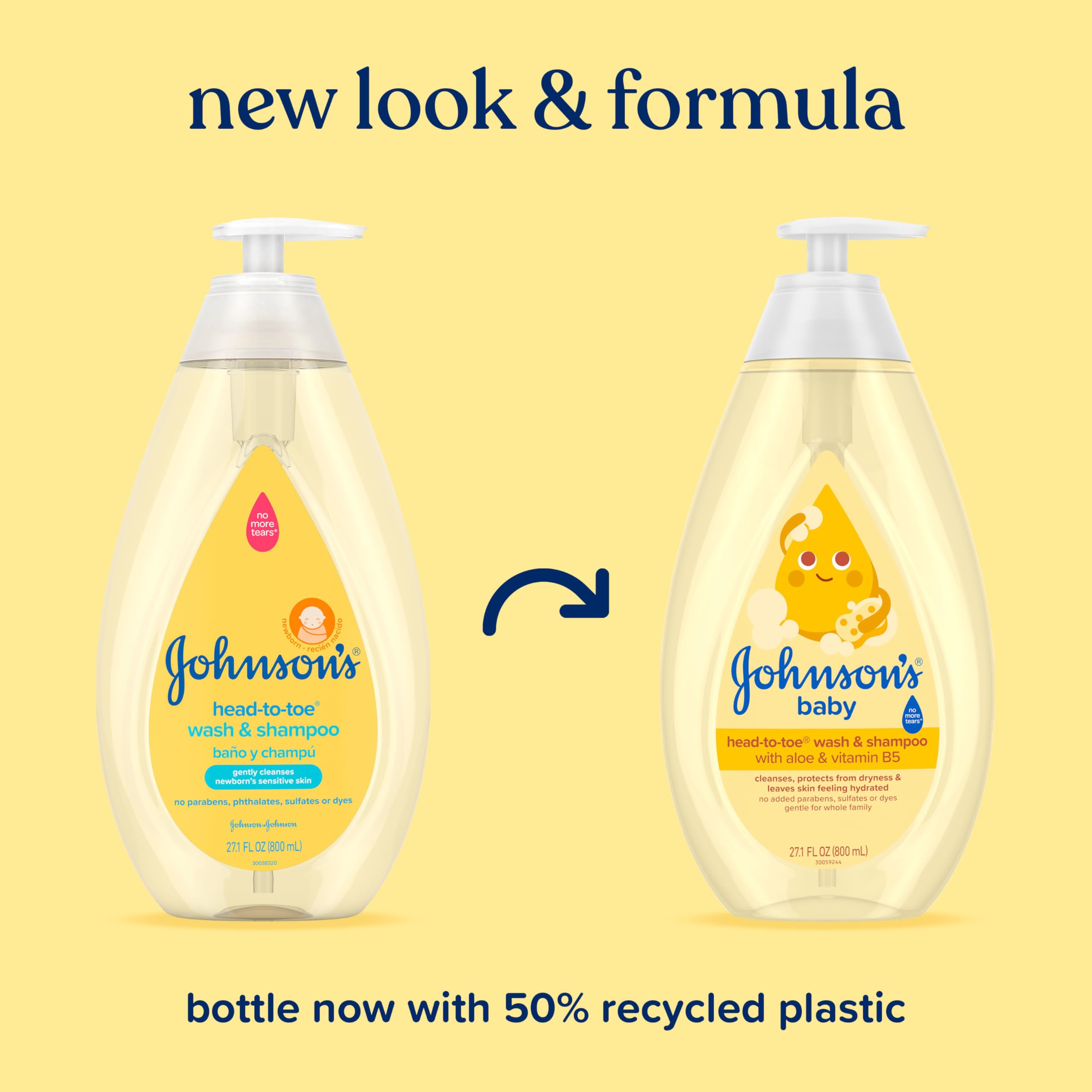 Gentle enough for newborns, Johnsonโs Baby Head-To-Toe Wash & Shampoo is a tear-free, 2-in-1 baby wash and shampoo that safely and gently cleanses your babyโs delicate skin and hair. Made with aloe vera and vitamin B5, this non-drying baby wash is clinically proven safe for newborns. It helps protect skin from dryness, leaves your baby's skin feeling soft and hydrated, and is made with Johnson's baby unique gentle scent. This hypoallergenic, pH-balanced baby shampoo and body wash is pediatrician tested and has no added parabens, sulfates, and dyes. The No More Tearsยฎ formula is as gentle to the eyes as pure water, making bath time stress-free. Part of the perfect 3-step bath routine: 1. Shampoo with Johnson's Baby Shampoo 2. Wash with Johnsonโs Baby Head-To-Toe Wash & Shampoo 3. Moisturize with Johnsonโs Baby Lotion Packaged in a bottle made with 50% recycled plastic. Our Formula: Formula, now with Aloe & Vitamin B5: Leaves hair feeling soft and skin feeling soft and hydrated No added parabens, sulfates, & dyes. Tested with Pediatricians; Made with unique gentle baby scents How to Use: Apply with warm water using your hand or a washcloth, gently lather, rinse, & follow with a massage using Johnson's Baby Lotion. Our Brand Story: Johnsonโs Baby cares for what is precious: your babyโs precious skin and hair, and precious moments of bonding. For over 125 years, weโve been committed to crafting gentle, science-backed baby care prod-ucts that support happy, healthy bonding moments. World's #1 Baby & Child Care Brand* *Source Euromonitor International Limited; Beauty and Personal Care 2025 ed. As per Baby and Child-Specific Products Category; all retail channels; value sales at RSP; 2024 data.
