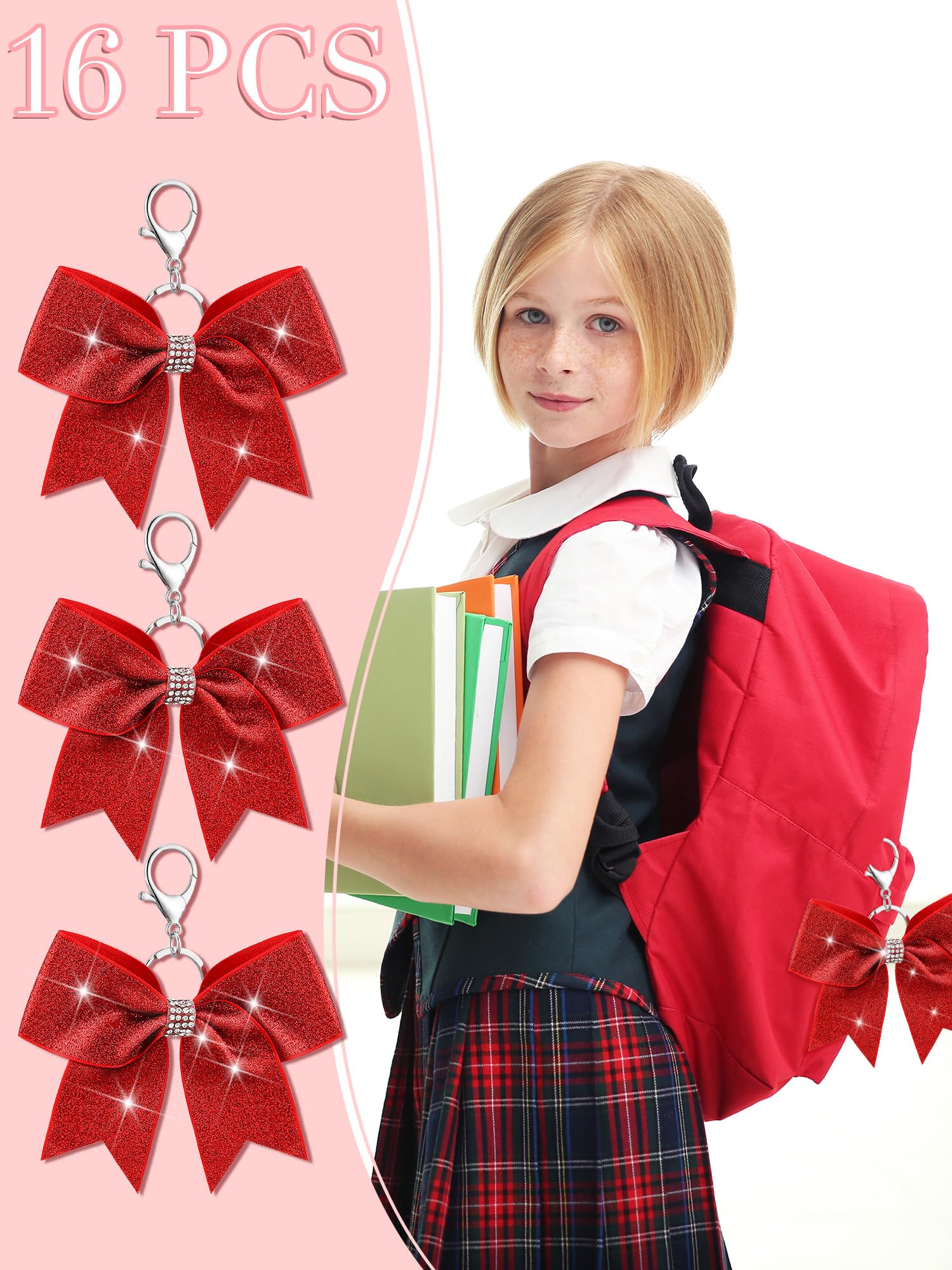 What You Will Get: each package includes 16 pieces of cheer bow keychains, nice for quantity users and suited for various occasions; These cheerleader bow keychains are embellished with a glittery finish, making them decorative charms, and the adequate quantity will meet your various needs