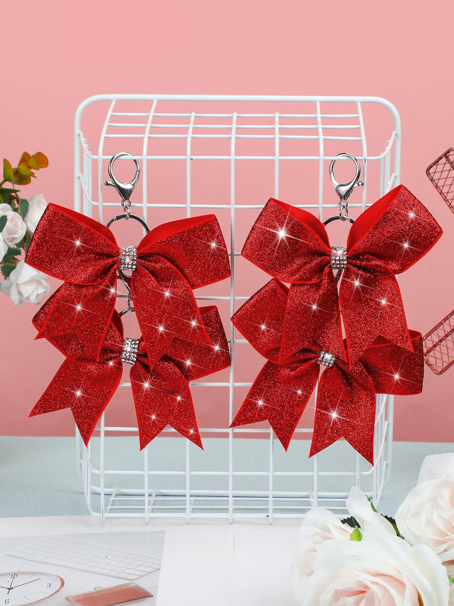 Quality Material: our glitter bow key chains are made out of fabric, sturdy metal, and rhinestones; This trio of materials makes a product that's not only visually appealing but is also designed to withstand daily usage; You can expect longevity and continuity of the aesthetic appeal