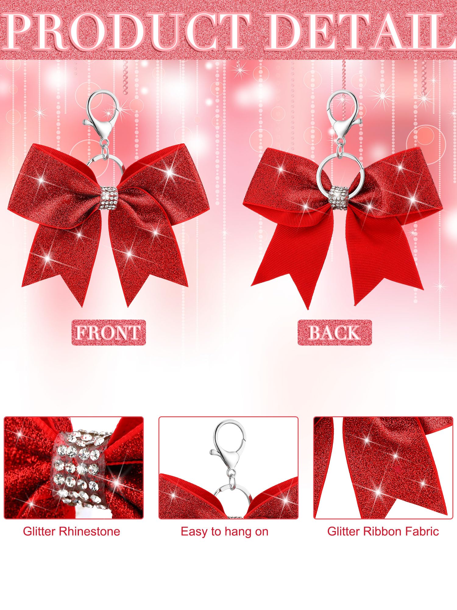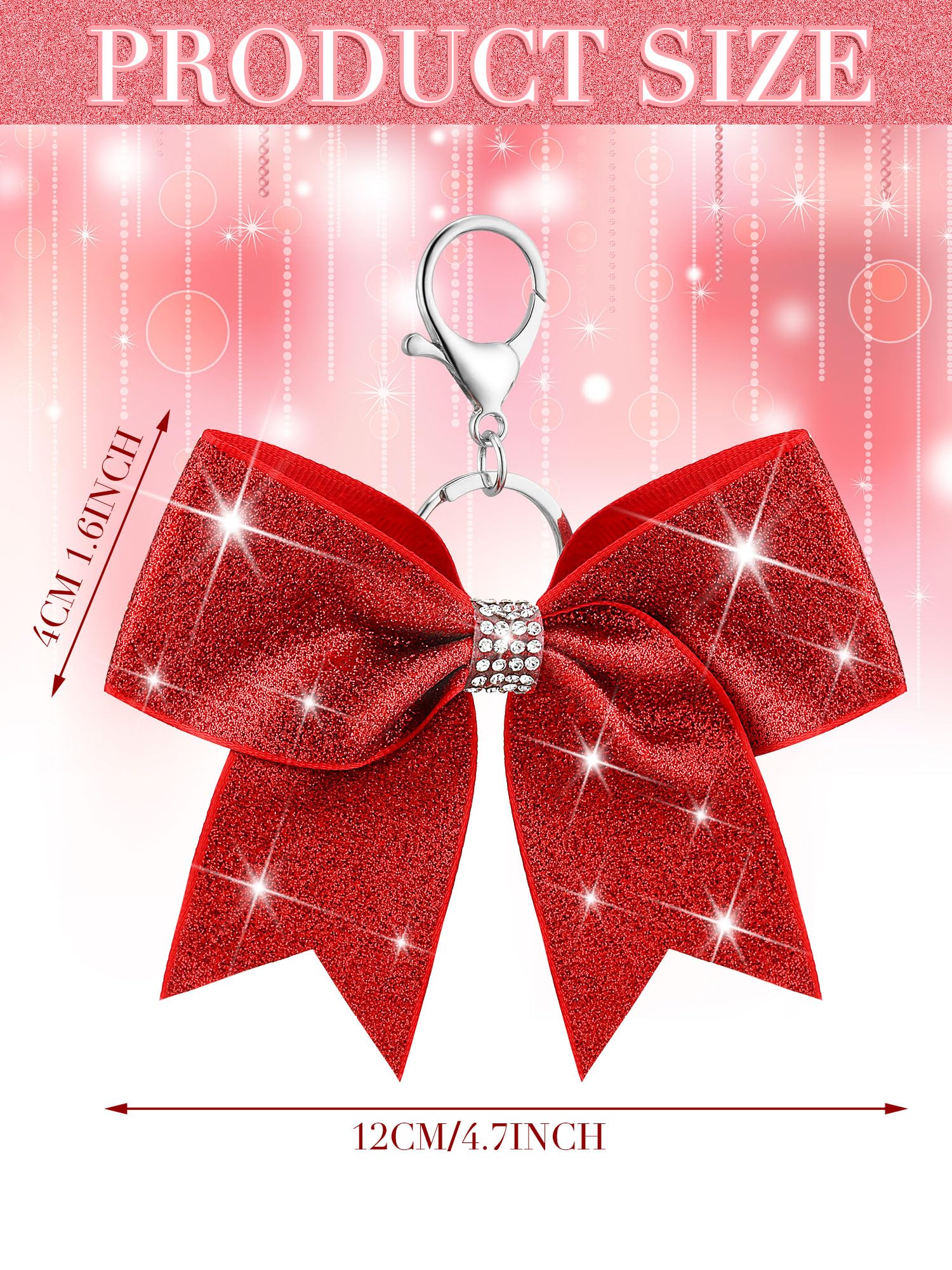 Proper Size: our glitter cheer bow keychains about 1.6 inches/ 4 cm wide, about 4.9 inches/ 12 cm long, in the classic bow shape, proper size for you to hang on your items, and the rhinestone and glitter effect will add a touch of elegant to your keychains