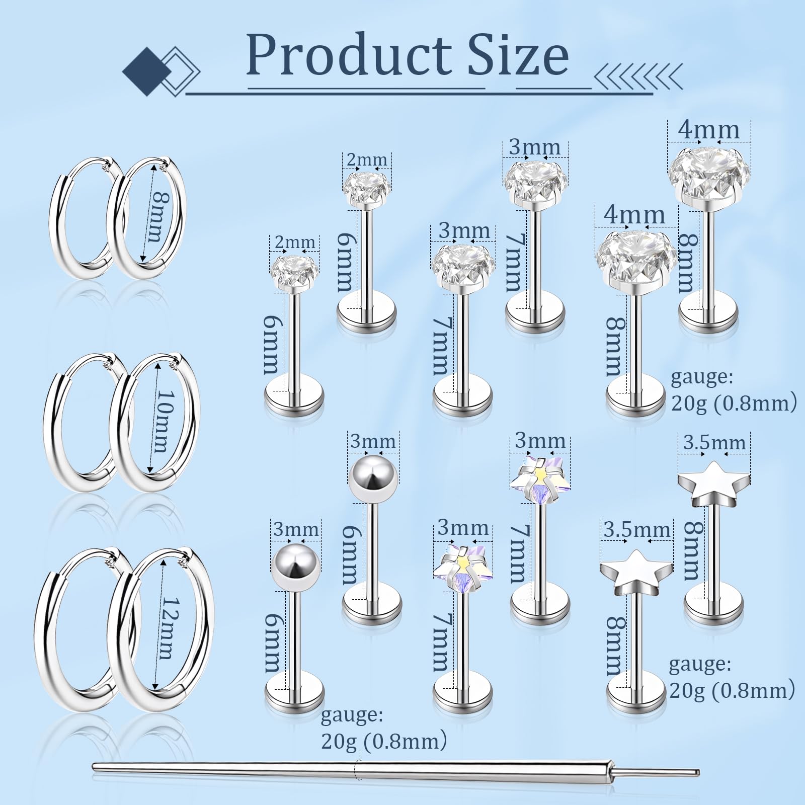 Tragus Piercing Jewelry Size: Stud 0.8mm (20 gauge), Diamonds: 2mm (0.08 in) / 3mm (0.12 in) / 4mm (0.16 in), Bar Length:6mm (0.23in) / 7mm (0.27in) / 8mm (0.3in), jagosen surgical steel earrings are available in a wide range of sizes, including ball studs, star studs, pentagonal diamond studs, and three pairs of different sizes of cubic zirconia studs. earrings and three pairs of cubic zirconia studs in different sizes.