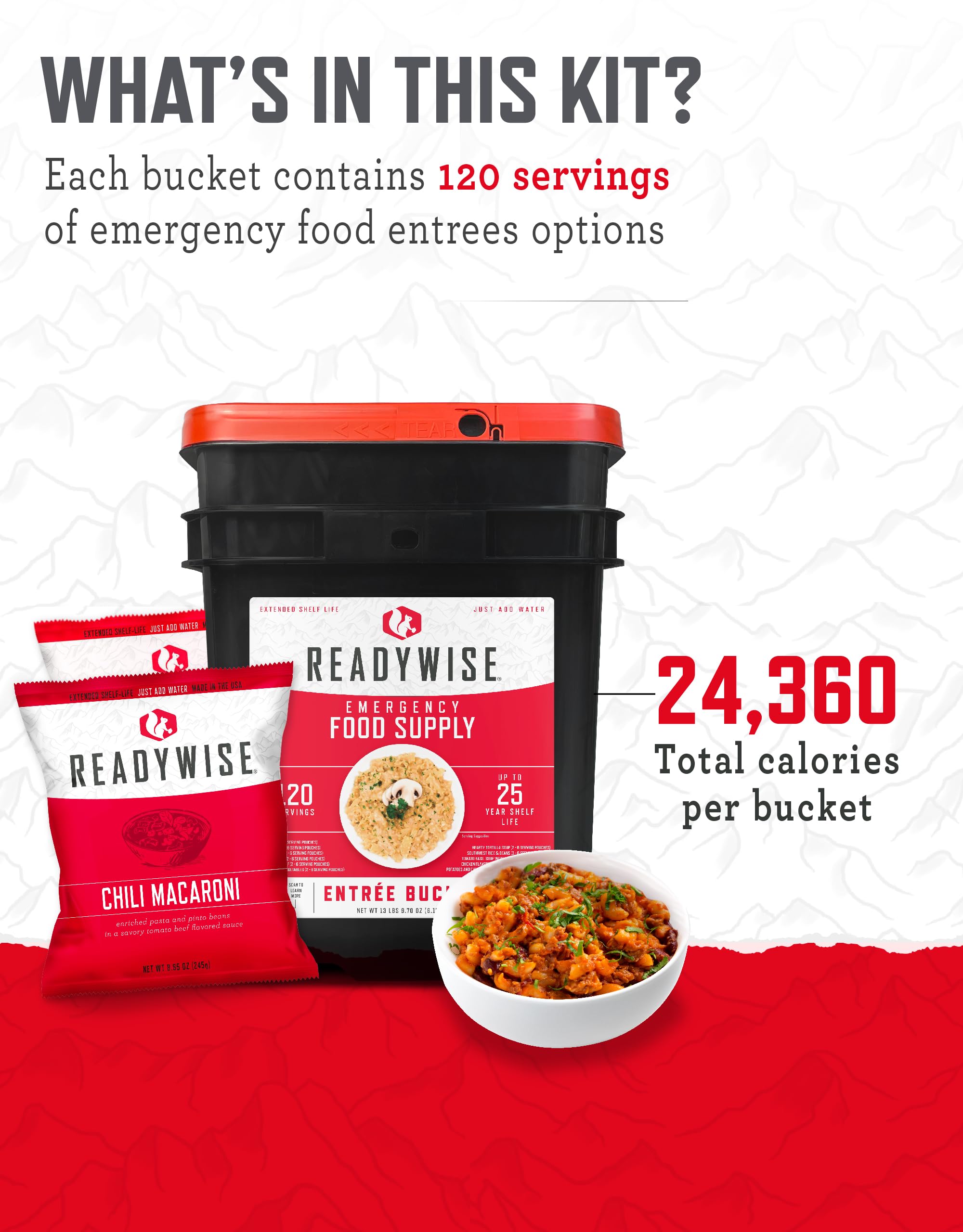 THE ULTIMATE SURVIVAL ESSENTIAL: With 120 servings of entrées meals, ReadyWise Grab & Go Bucket is the perfect starting point for anyone serious about preparing for the future. Stay ready for anything, from power outages to outdoor adventures!
