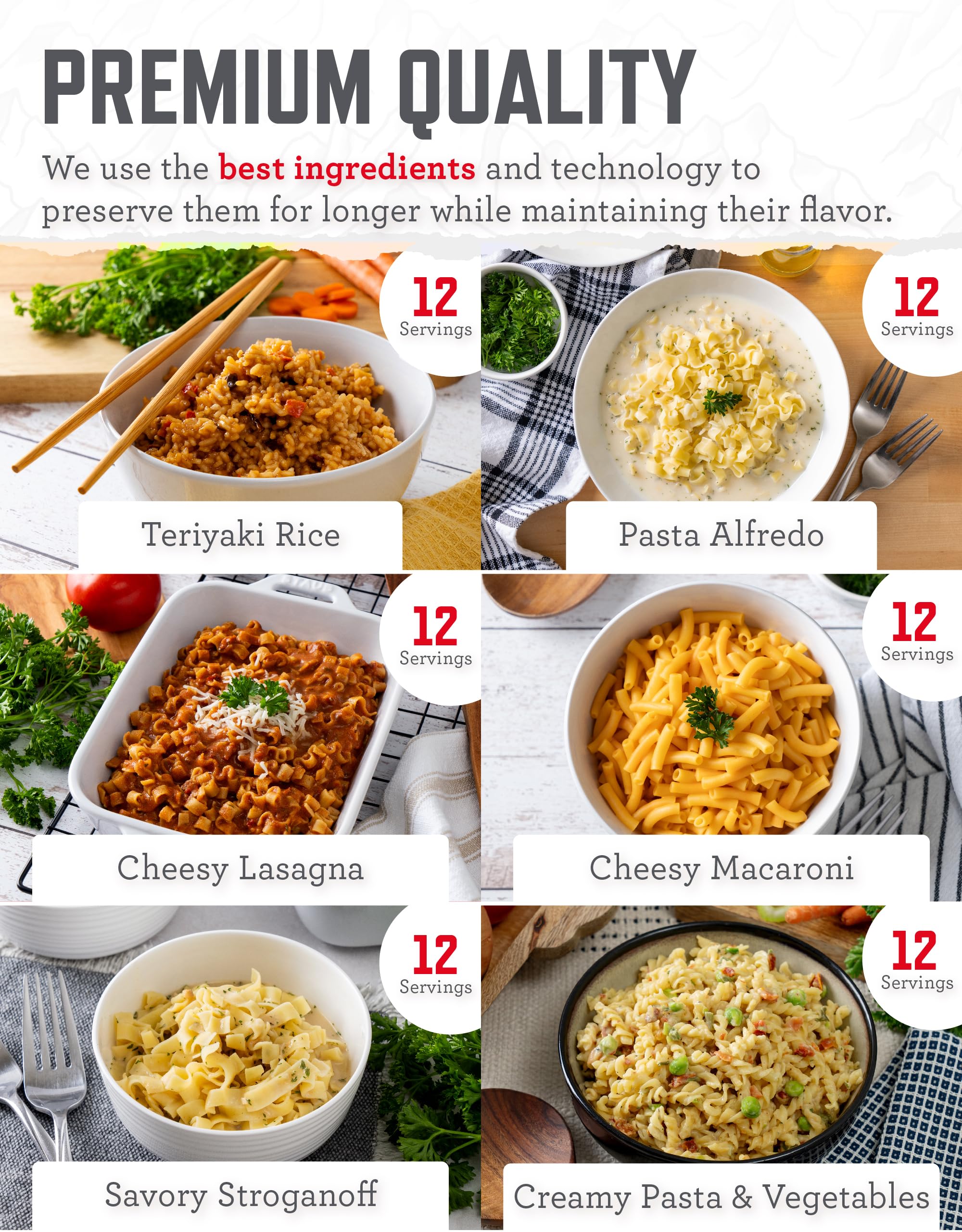 ENJOY NUTRITIOUS MEALS: Our emergency supplies offer convenience and tasty, nutrient rich options, including Cheesy Macaroni, Lasagna, Teriyaki Rice, and Chicken Flavored Noodle Soup! Perfect for travel necessities, as well as home and kitchen use.