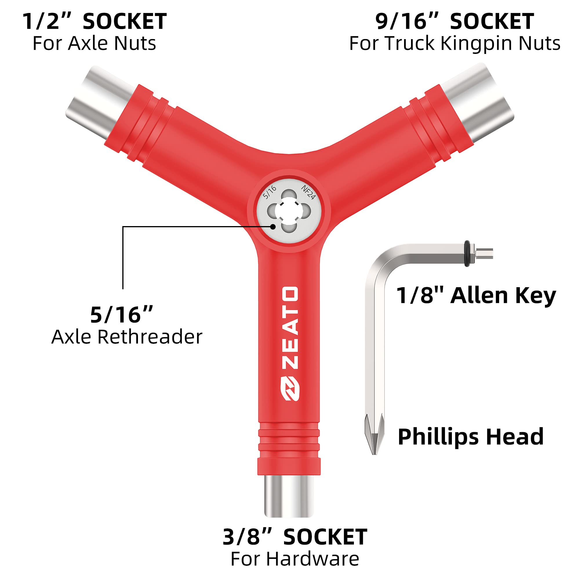 [Innovative Structure]: The skateboard Y tool includes 3 different sizes of sockets (1/2'',9/16''and 3/8'') and a slide-out Phillips head wrench screwdriver that fits into the middle of the handle when not in use