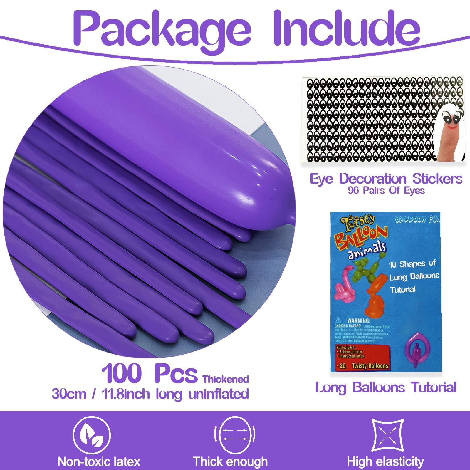 What you get: Pack of 100 Purple long balloons, 30cm long uninflated, up to 150cm after inflation, each balloon has undergone rigorous testing to reduce the defect rate as much as possible