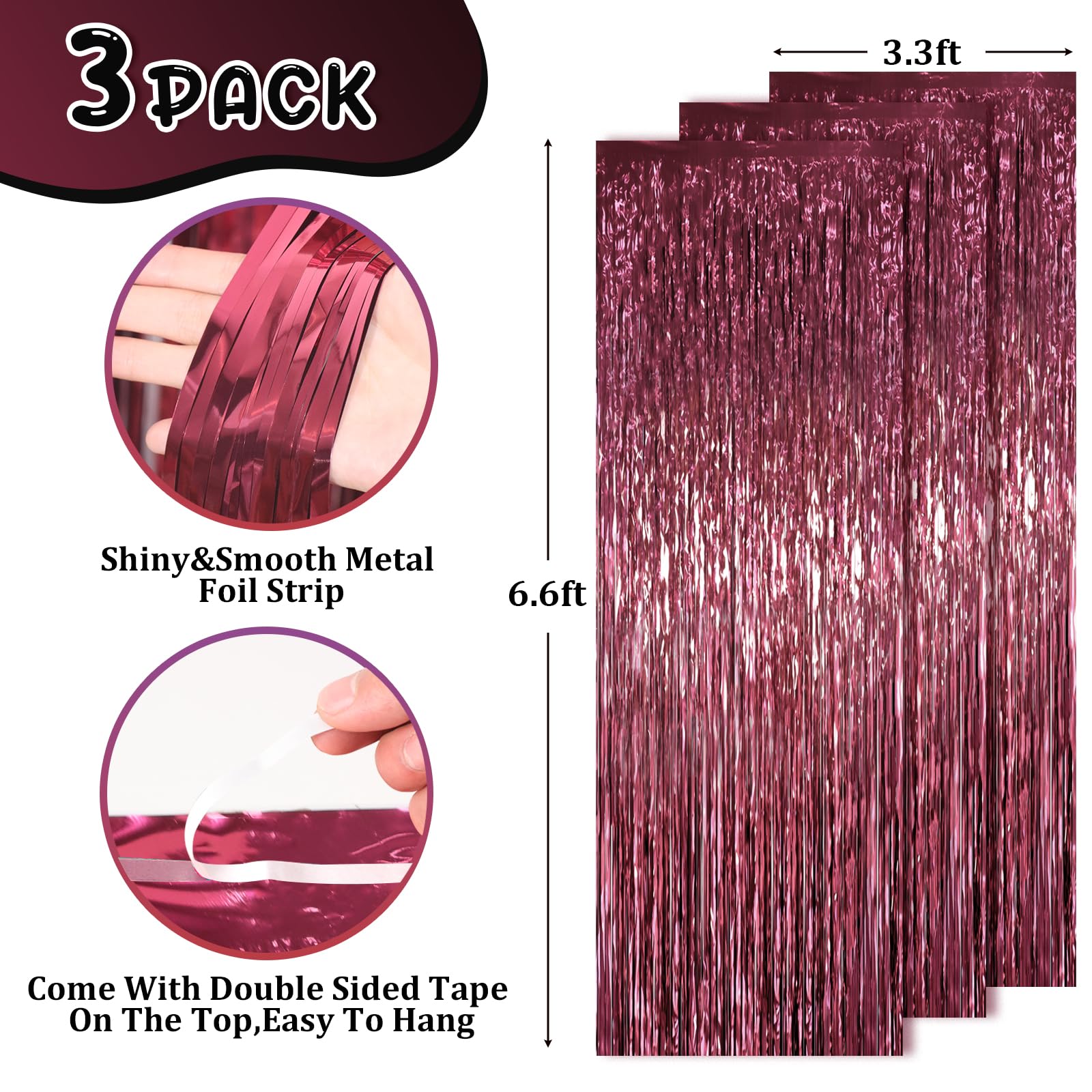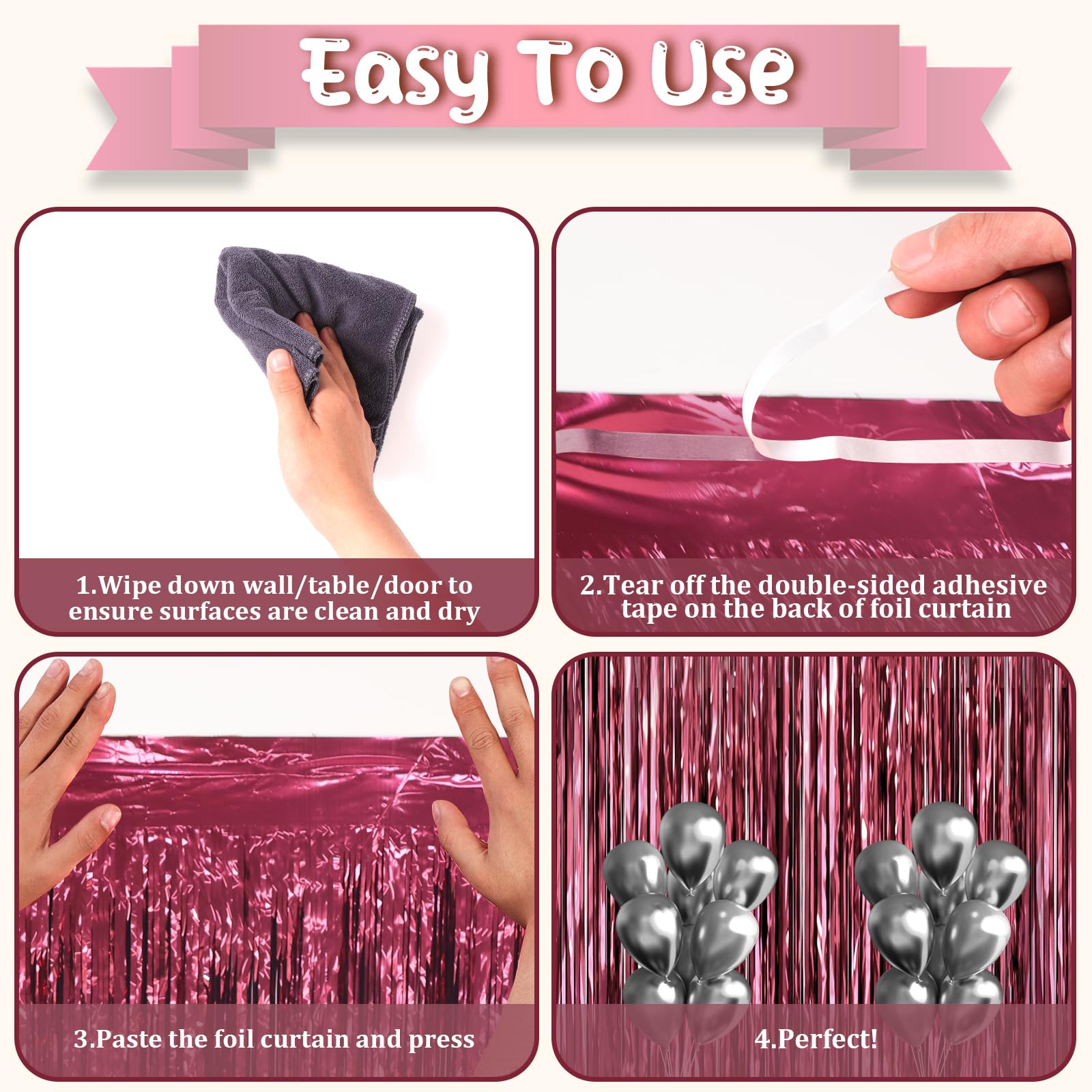 How to Set up: Wipe down wall/table/door, ensure surfaces are clean and dry, tear off the double-sided adhesive tape, paste the foil backdrop curtains and press. Hang each individual tinsel fringe curtains in different locations for a fuller effect