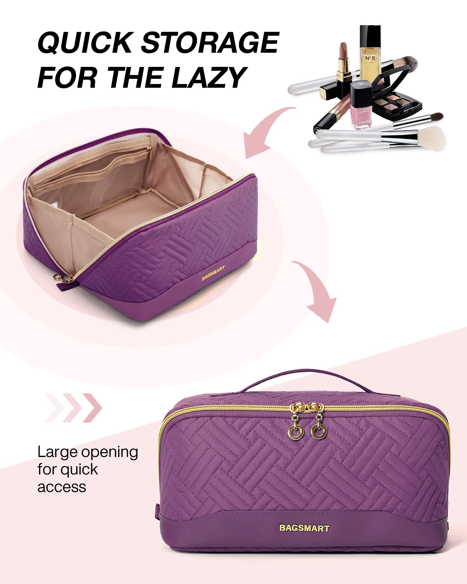 Quick Storage: Wide-open design makeup bag makes it easy to find and reach your daily cosmetics, skin-care products, toiletry accessories. Open up completely, and just close the zipper for easy storage