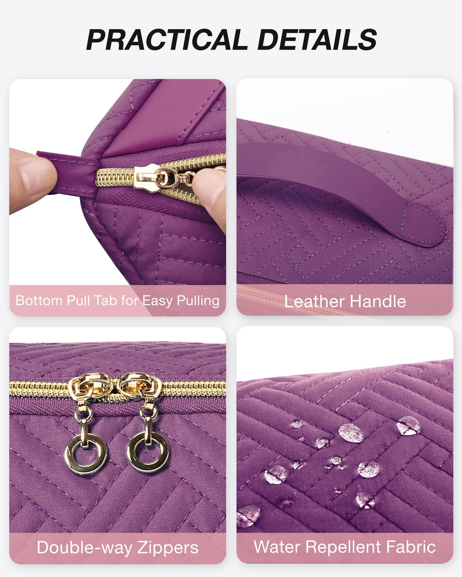 Quality & Convenience: The makeup bags for women is made of quilted water-resistant fabric. Top leather carry handle is easy to carry. Double-way zippers and bottom tabs make this cosmetic bag easy-pulling