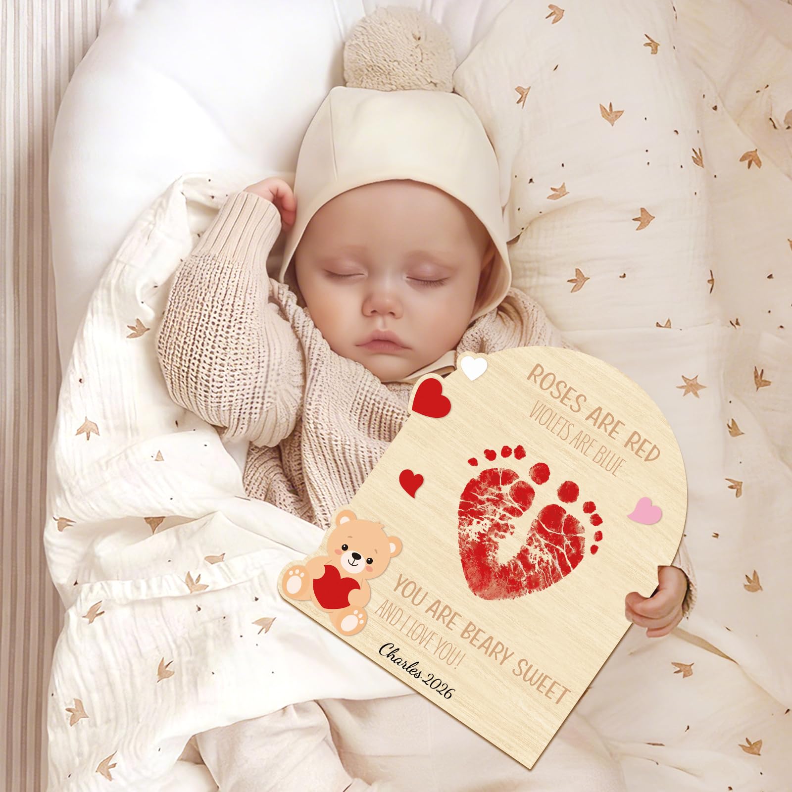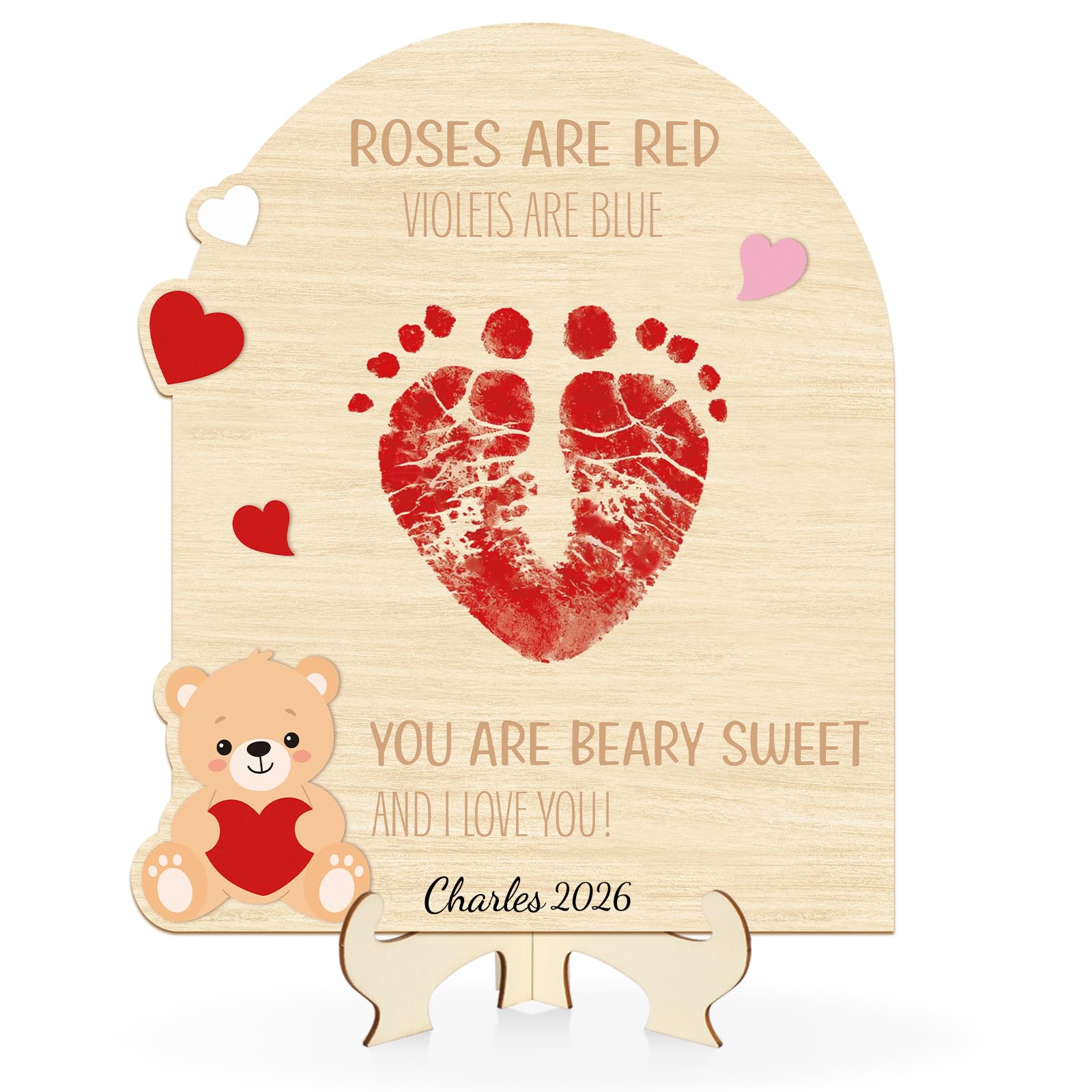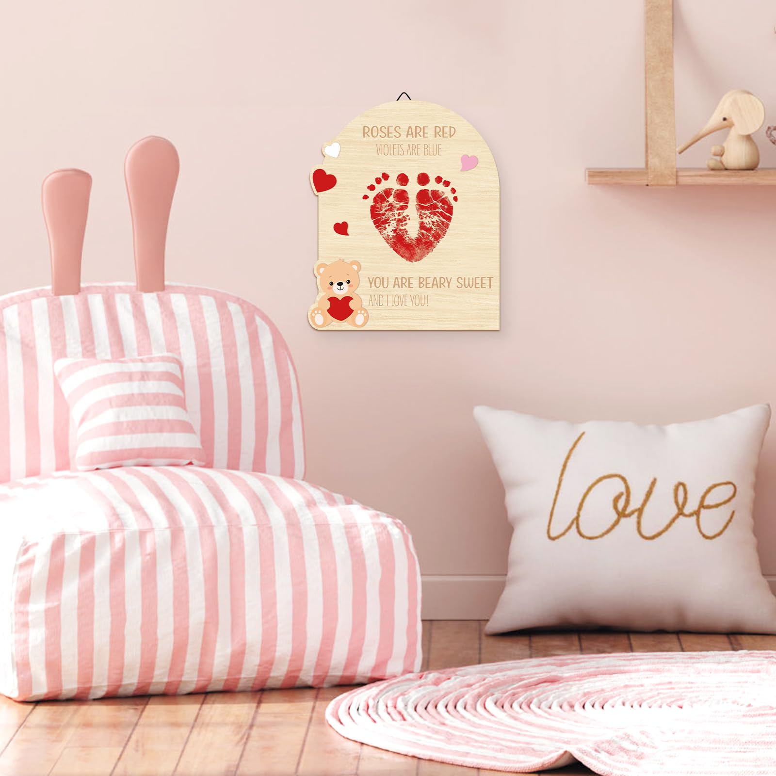 High-quality Craftsmanship: Our little baby Valentine footprint signs are made of high-quality wood, with beautiful patterns and durability. They are equipped with hooks and brackets, and can be hung or displayed on the table
