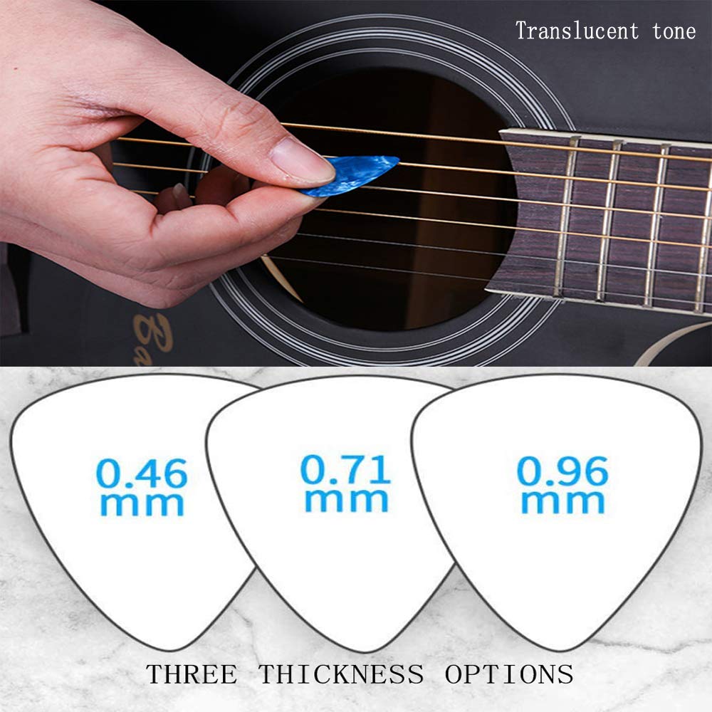 🎸【GREAT GIFT WHAT YOU GET】The package includes: a guitar fretboard sticker, 5 packs premium classic celluloid guitar picks and 1pc high guality guitar bridge pin puller. The celluloid picks in 3 different thickness: 0.46mm,0.71mm,0.96mm. Fits in the finger with wide body with a dense round tip, that could produce a wonderful classic tone to your guitar.