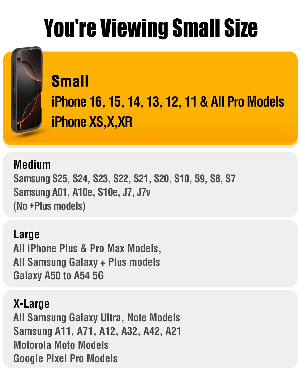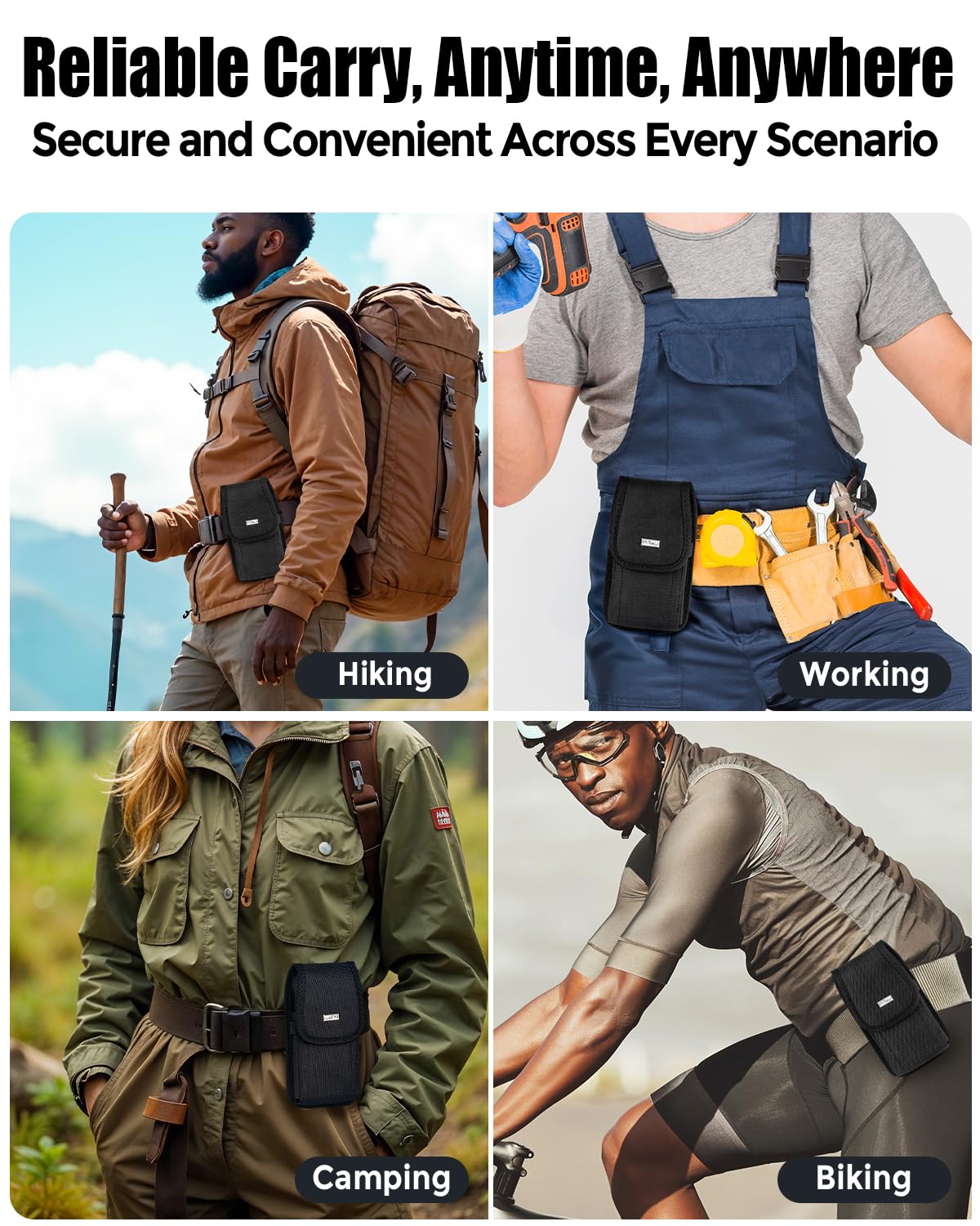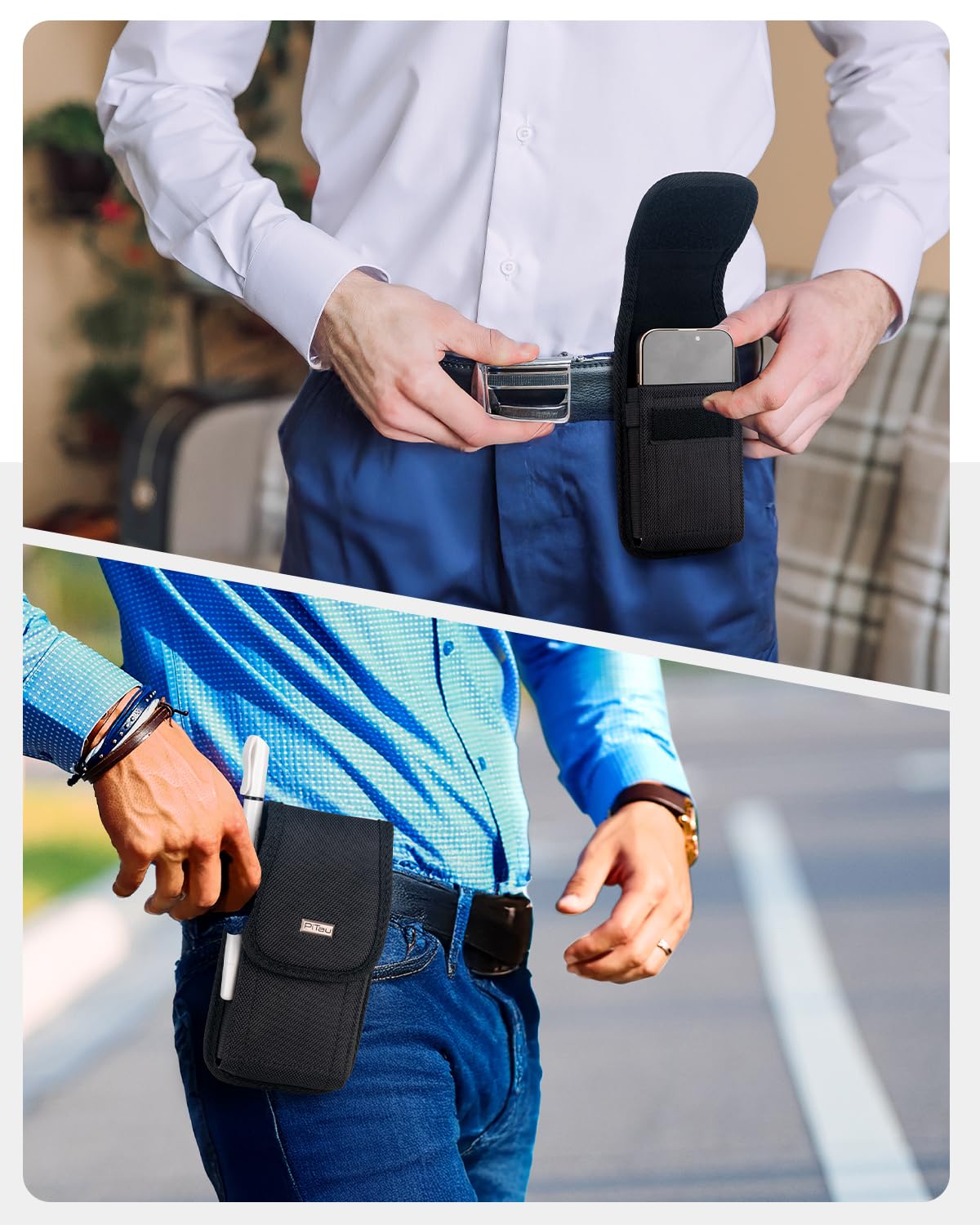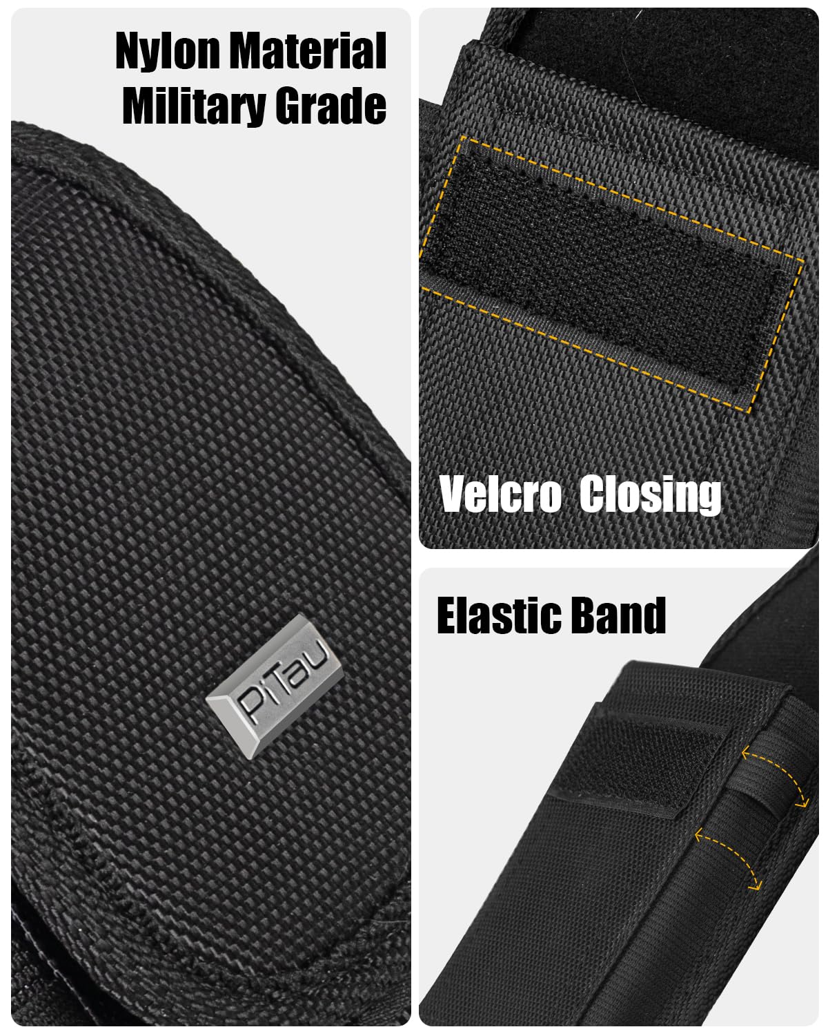 PiTau rugged nylon vertical cellphone holster case with belt clip is designed for iPhone 16, 16e, 16 pro, 15, 15 pro, 14, 14 Pro, 13, 13 Pro, 12, 12 Pro, 11, 11 Pro, Xs, X, 10, XR Samsung Galaxy S25 S24 5G, S23, S22, S21, S10, S9. Enough room to fit the phones with protective cases on.