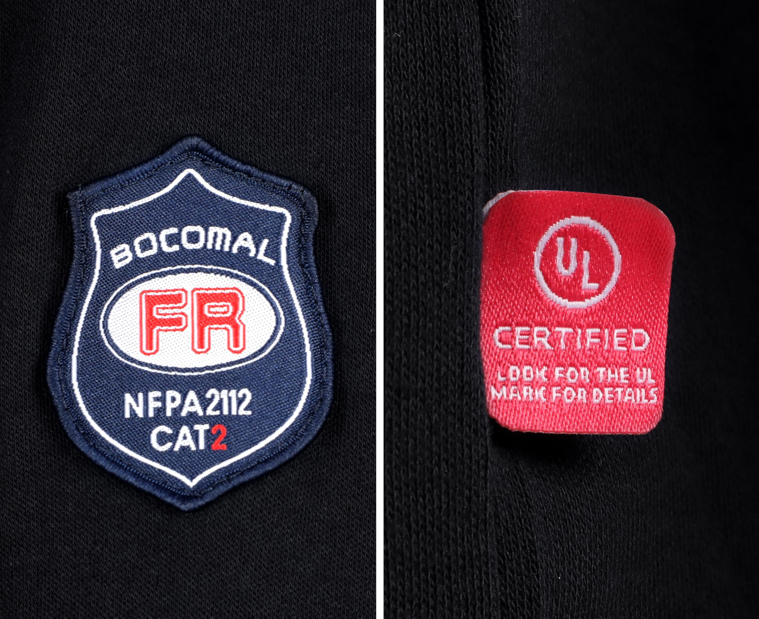 FR MATRIALS:7OZ Cotton Knit FR Treated,FR Buttons,FR Sewing Threads!Clear FR Tag on arms and bottom front.More FR info On Neck Tag About UL Certification.We Attached A Small Sample Inside Package For Cunstomers Simple FR Try