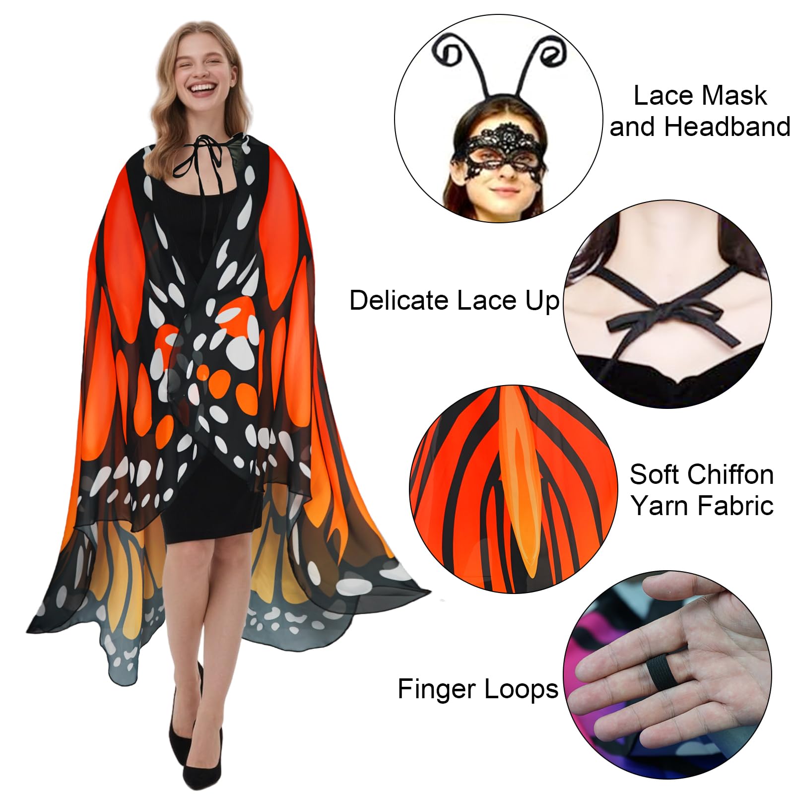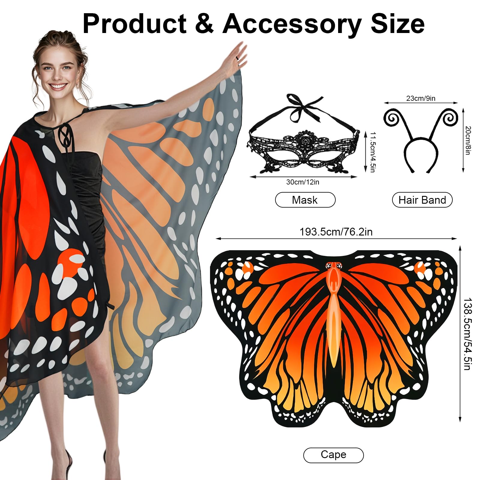🦋 Complete Butterfly Costume Set for Adults – This stunning butterfly costume for women includes a chiffon wings cape (198x140 cm/78x55 inches),a delicate lace mask,and a antenna hairband.The adjustable neck drawstring and finger loops ensure a secure,comfortable fit,making it ideal for adult Halloween costumes for women and cosplay events.